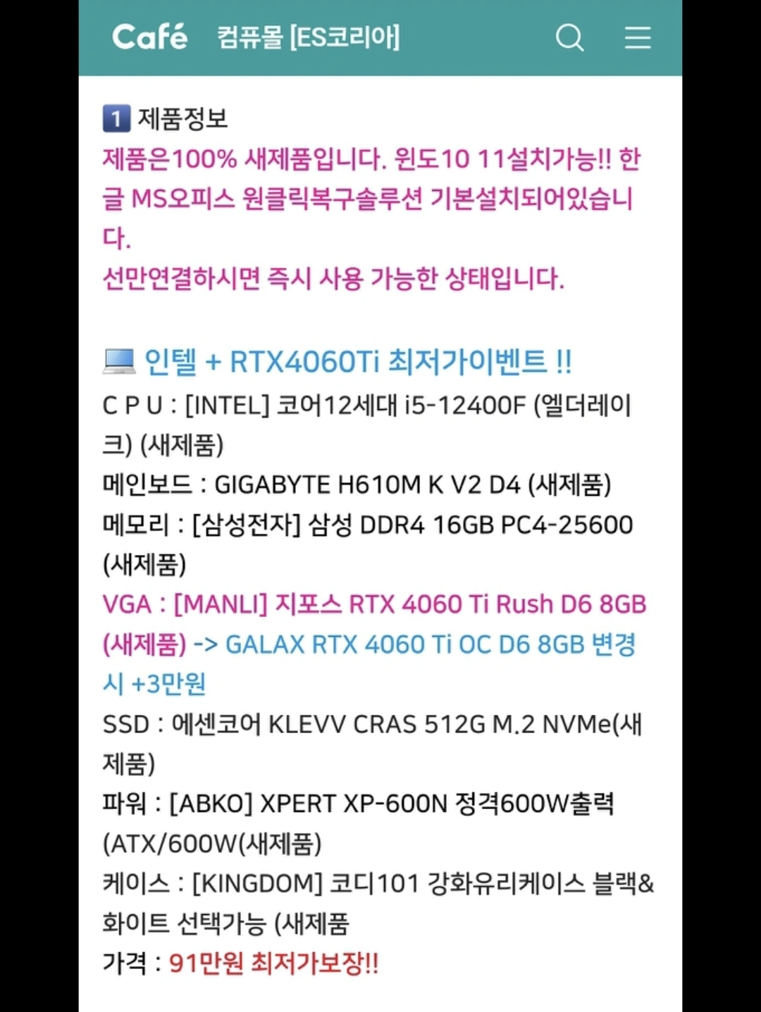 게임도 하고 영상편집도 하려고 올해 7월에 (약3개월정도 사용)구매했습니다 업체에서 인텔 RTX4060ti(91만원)에 추가로 메모리32기가로올리고 어항케이스로 변경해서 주문했습니다 (사진첨부 참고하세요) 게임도 안하고 영상편집도 일이 없어서 노트북으로 충분하여 컴텨 내놓습니다. 따로 판매하기 힘들어서 따로 안팔고 본체랑 묶어서 팝니다 본체+모니터(32인치) 하나 70 본체+모니터 (32인치)두개 80 에 팝니다 주변기기 (키보드.마우스.스피커)는 별도이며 주변기기 도 구매원할시 세개묶어서 5에 팝니다 바로 구매하실분만 챗주세요 (3교대근무라 일하거나 잘땐 답변늣습니다 확인 즉시 답장드리겠습니다) 네고안합니다