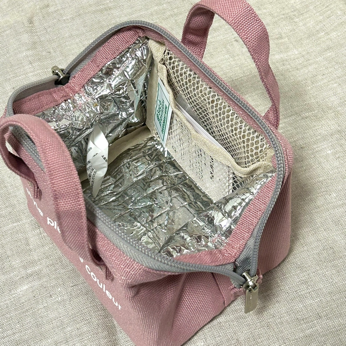 三角形の可愛いお弁当袋、未使用ですが包装は開けてしまってもうありません。 コンビニのおにぎりなら2個、小さいタッパーとおにぎり1個くらい入ります。 内側のメッシュポケットに保冷剤を入れるタイプ。 保冷保温機能。 消臭、抗菌加工タグ付き。 撥水加工。空の時畳む用のゴムバンド付き。 サイズ : (約)幅13x奥行11x取手除く高さ11cm 素材 : 帆布調ポリエステル 容量 : 1.1ℓ 重さ : 約100g