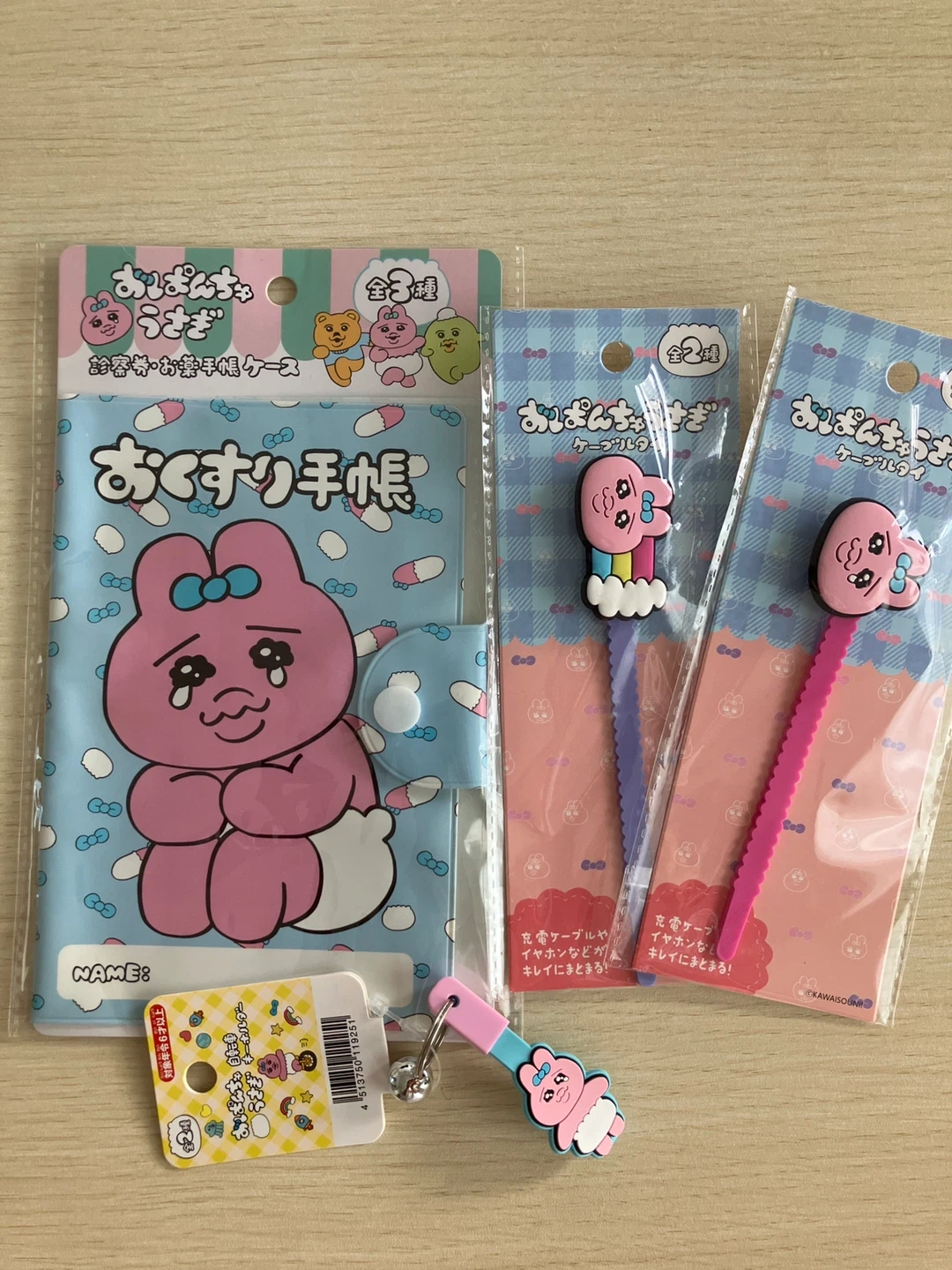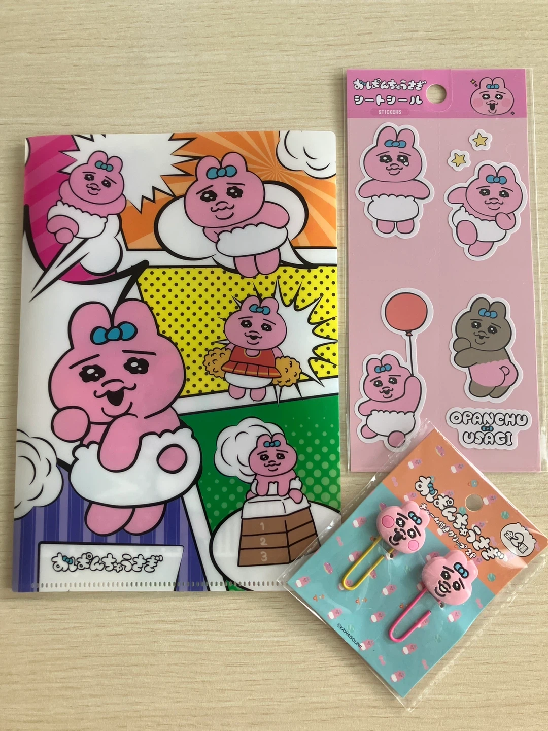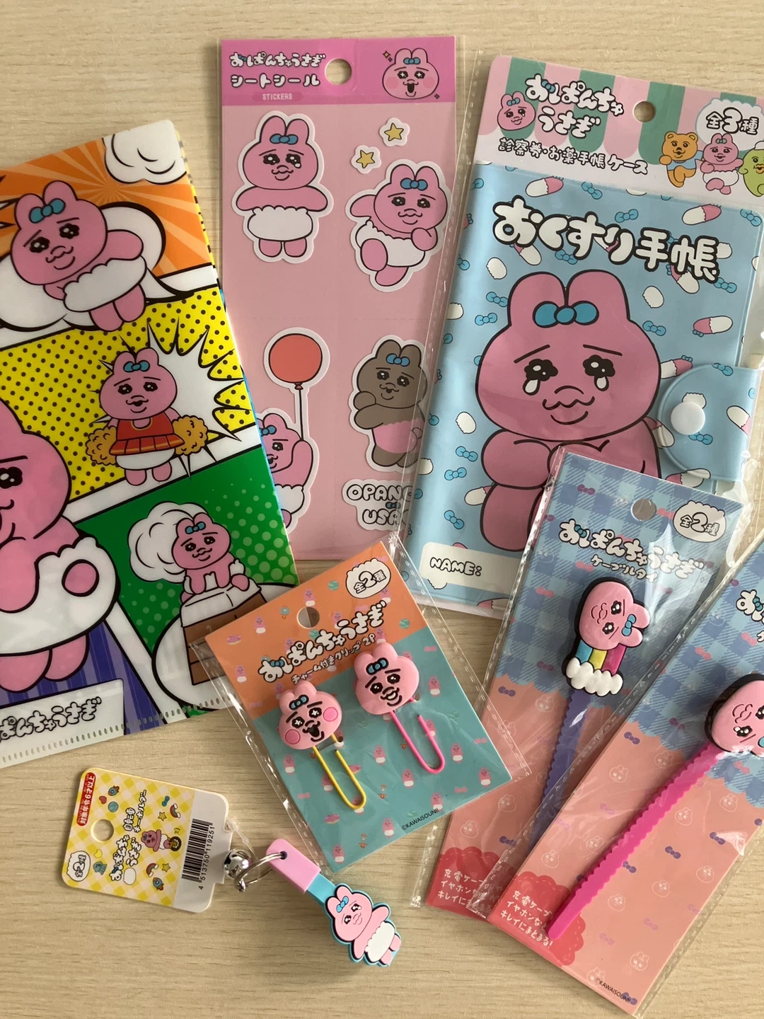 おぱんちゅうさぎの文具雑貨セットです。 ・シートシール ・お薬手帳ケース ・クリップ ・イヤホンケーブルホルダー ・キーホルダー ・ファイル おぱんちゅ好きな娘にとお店で見つけては購入していたら使いきれないと言われてしまったため、使っていただける方に。