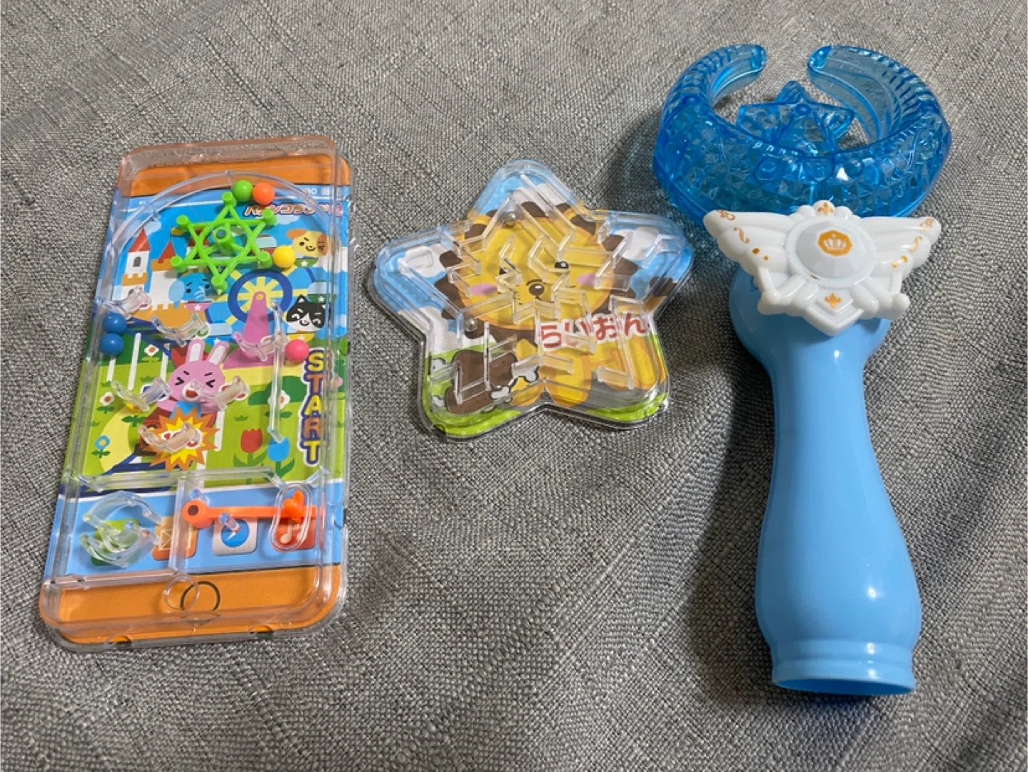 おもちゃ3点セットです ・ピンボールゲーム ・星型パズル ・光るステッキ(赤と青に点滅します) ・全体的にきれい 中古品であることご了承ください 受け取り場所は基本的に綱島駅でお願いしています。 平日日中の受け渡しだと日時にかなり融通が利きます。