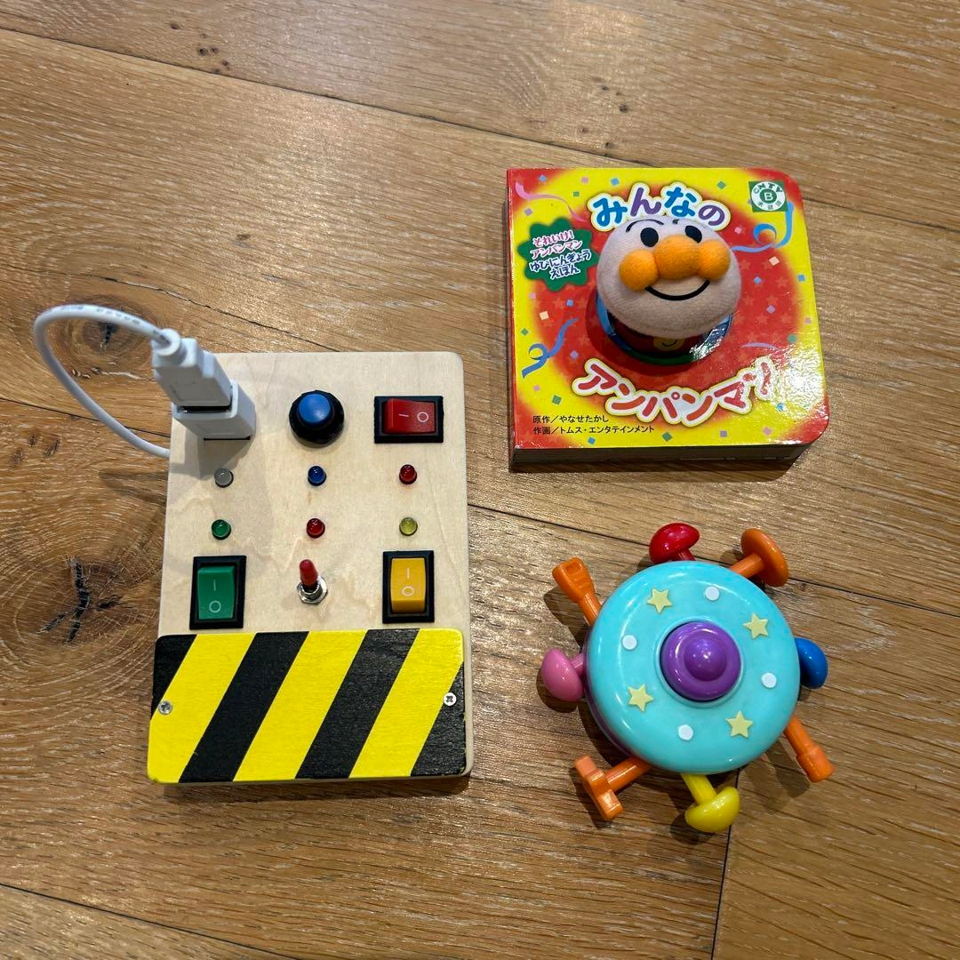 【スイッチのおもちゃ】 木製のコントロールパネルです。4つのボタンとスイッチとUSBのおもちゃです。 9x13cm Amazonで購入しました。 【みんなのアンパンマン】 指人形絵本です。小さいので外出に持ち歩きにもちょうど良いです。 【people のひっぱりボタン】 ピープルのノンキャラ良品のおもちゃです。 紐の部分がありましたがなくなっています。 8x8cm 子供が半年から1年くらい使用してました。 ご希望の方はお気軽にご連絡ください。