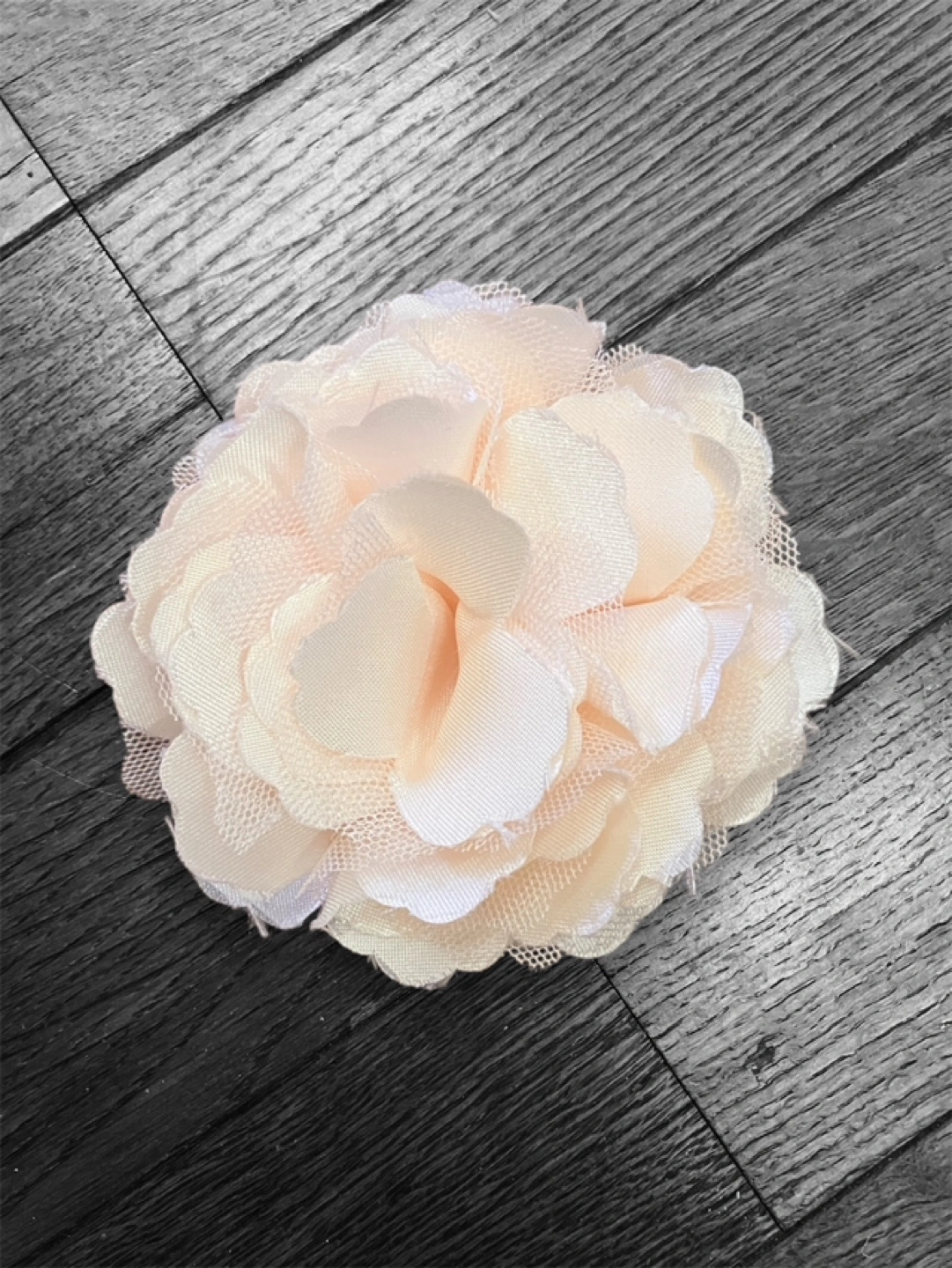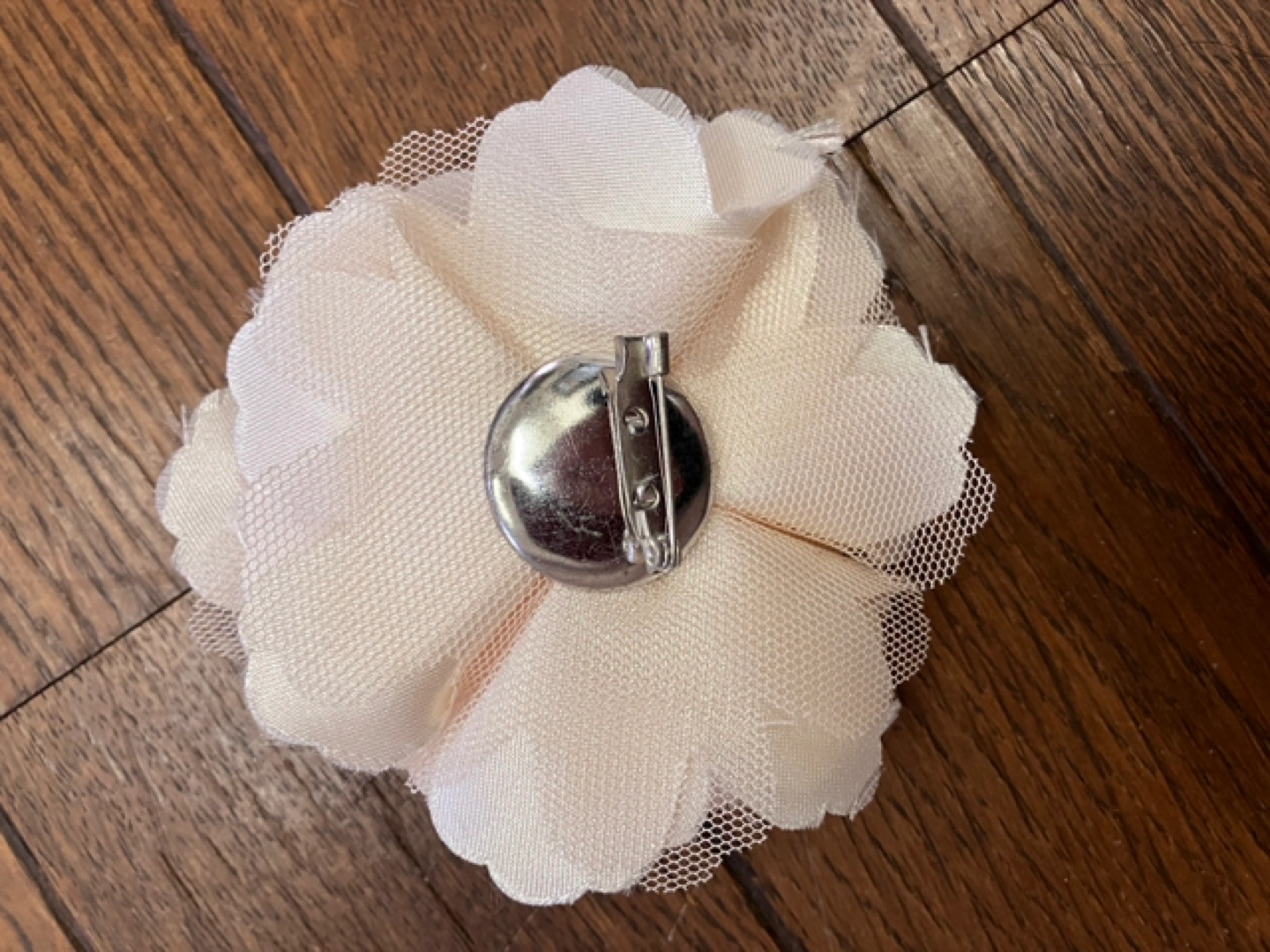 オフホワイトのコサージュ 流行のオーガンジーとサテン地のコンビです パーティシーズン到来!大活躍間違いなしの素敵なブローチ 素人採寸で最大直径9㌢位です 軽いので、薄物にもつけられそう ほぼ似ているものを、もうひとつ持っているので、手放すことにしました これからのパーティーシーズンや、卒業式、入学式などにはもちろん、カジュアルなTシャツなどに付けても可愛いです。