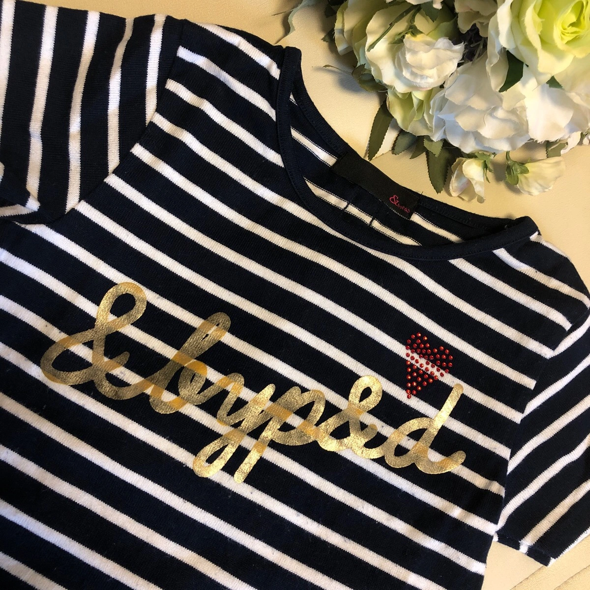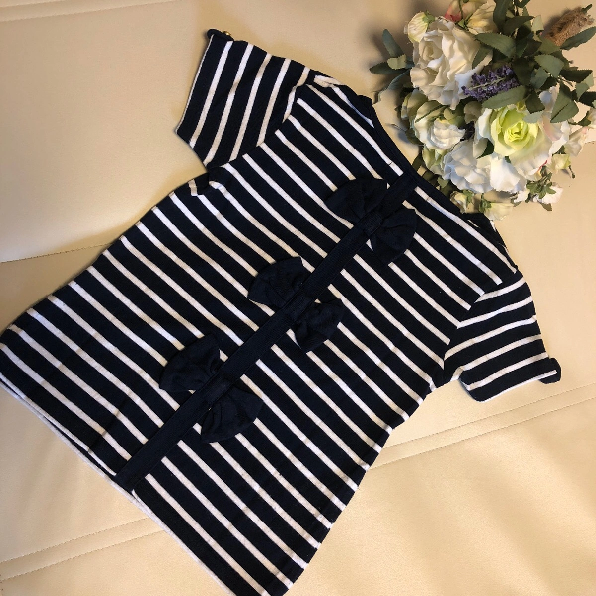 ♪ピンキー&ダイアン 紺と白のボーダー地に前の赤のハートストーンとゴールドの文字。後ろは3つのおリボンが付いて後ろ開きかな?と思わせ。お袖にもボタンが付いて。。中々凝ったデザインで可愛いです。少し厚手の地ですので今の季節にお勧めです。お色違いで購入しましたが両方とも着用回数の少ない綺麗なお品です。家庭での保管品はご理解下さいね ♪ピンキー&ダイアン サイズ130 着丈44、5cm 身幅32、5cm