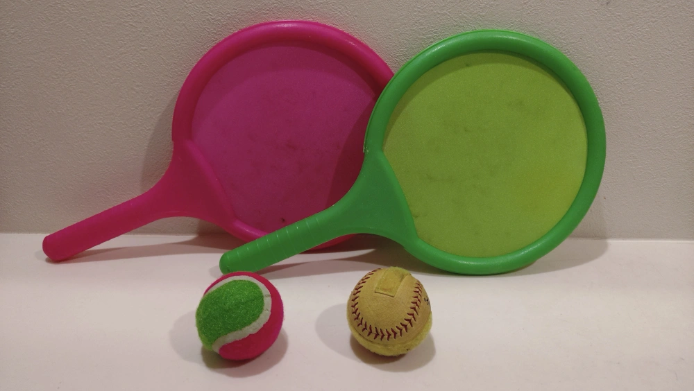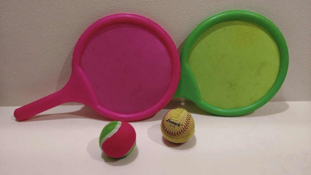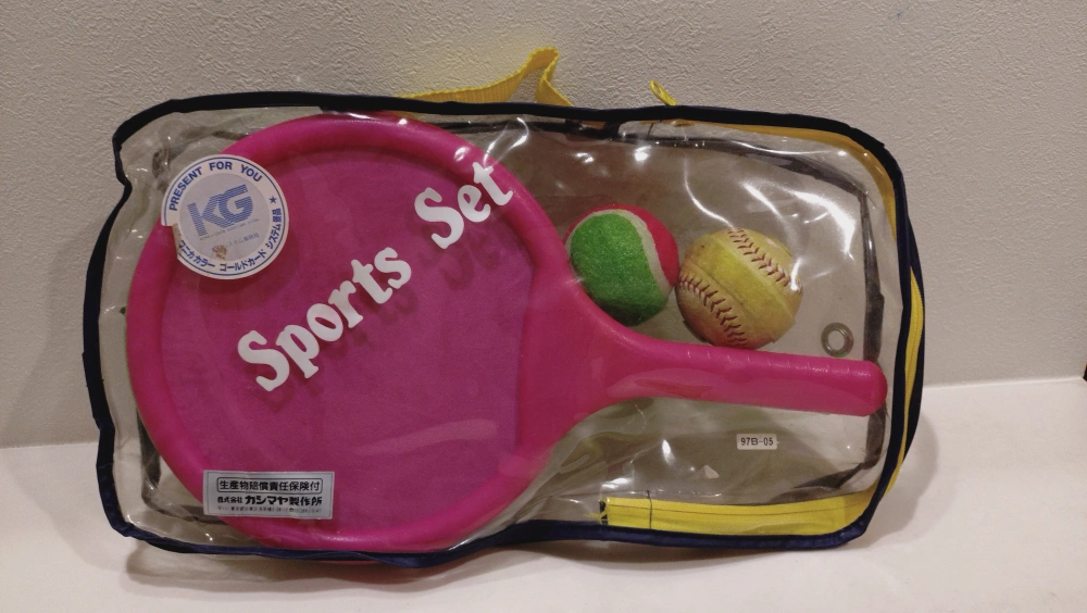 スポーツセット(ラケット、ボール)です ・ラケットの色:ピンク、グリーン ・ボールの種類:テニスボール、ソフトボール ・中古品になります