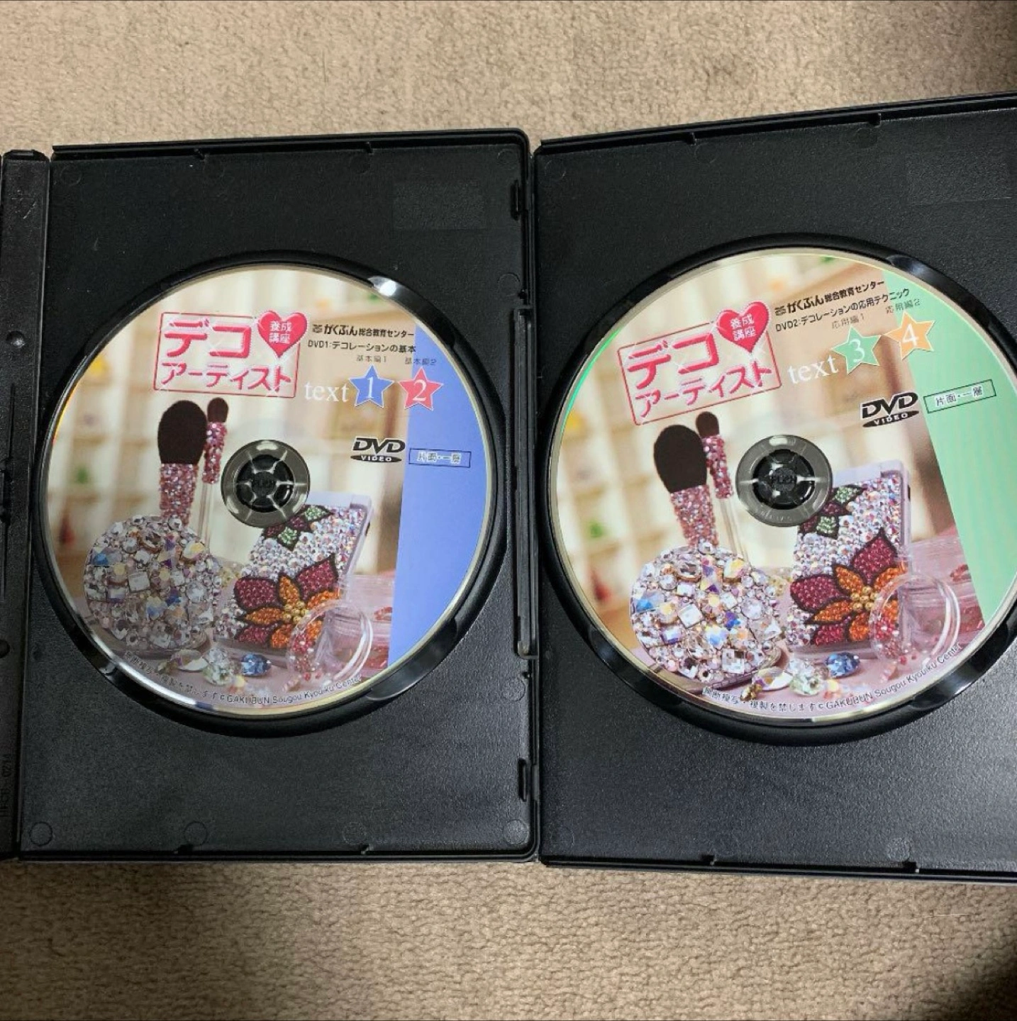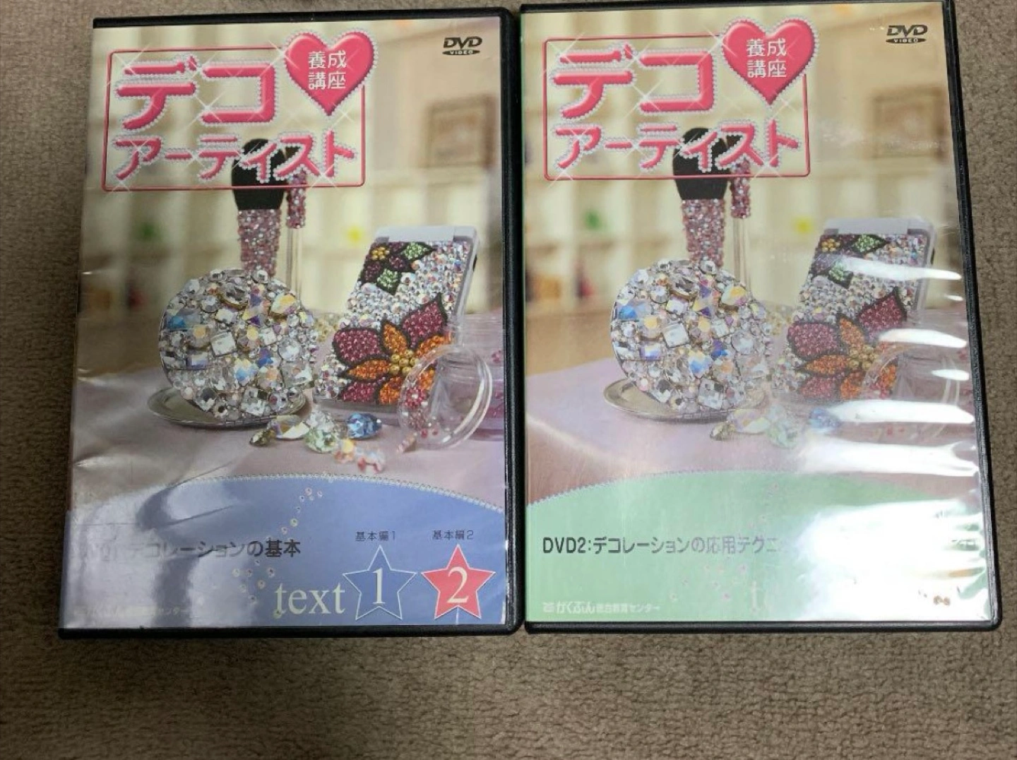 がくぶん総合教育センターのデコアーティスト 養成講座text1.2.3.4 DVD2枚になります。テキストはないです、DVDのみです。 デコに興味ある方に。 基本編1:ストーン・パーツの種類、用具の使い方、基本の技術 他 基本編2:ストーンを散らしてはる、整列ではる、すき間なくはる 他 応用編1:市松柄、ストライプ柄、アルファベット 他 応用編2:ゼブラ柄,パーツを使ったデザイン,オリジナルデザインの製作他 作品集:藤井愛弓先生の最新作品を収録