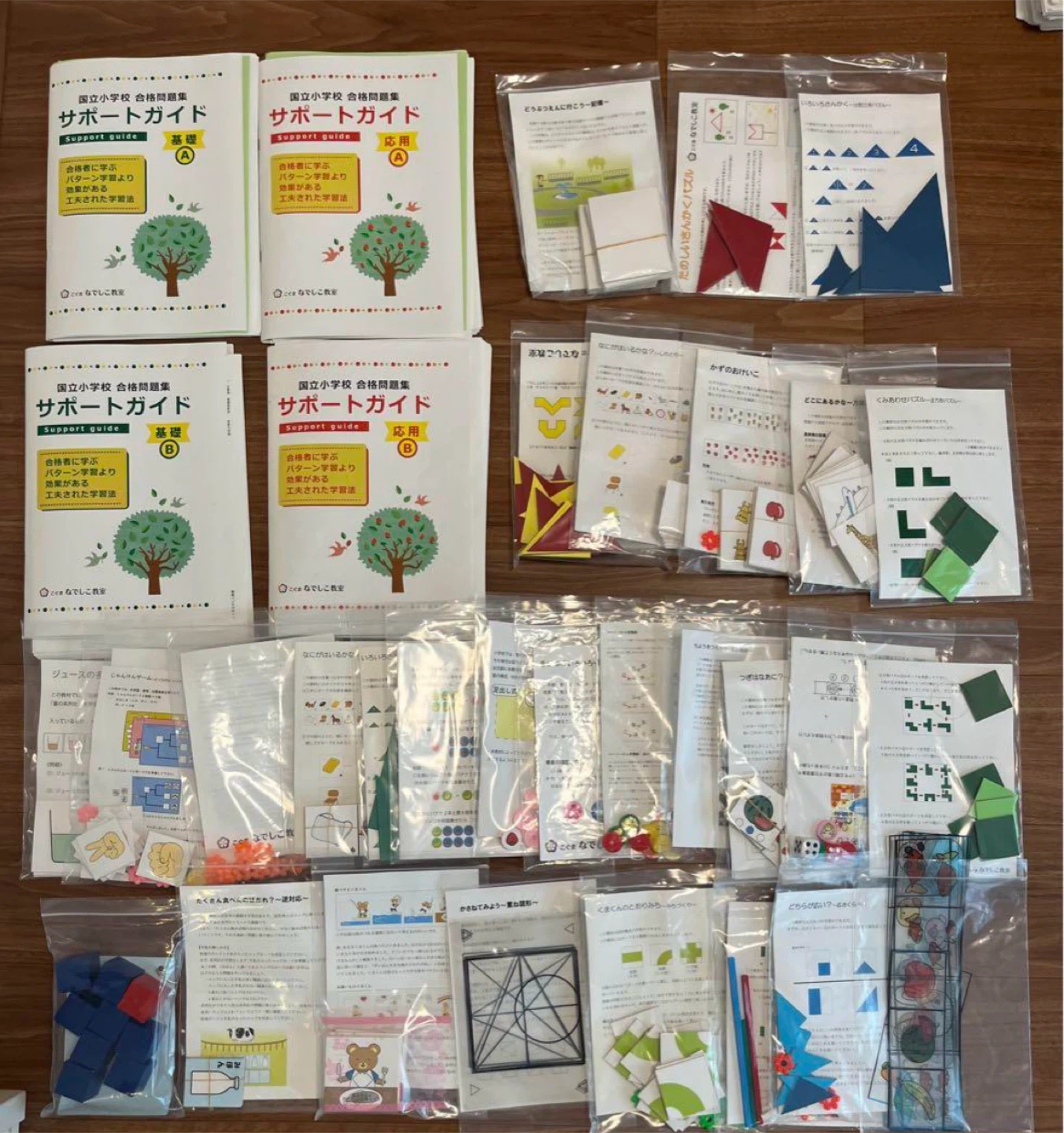 国立小学校合格問題集サポートガイドおよびなでしこ教室の教具もろもろです。 ほとんど活用していません。 かなりのボリュームです。 格安になりますので、細かいことを気にされない方に。 お受験 小学校受験