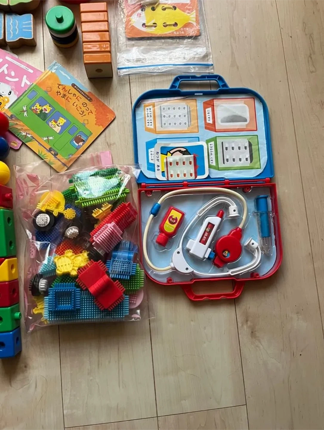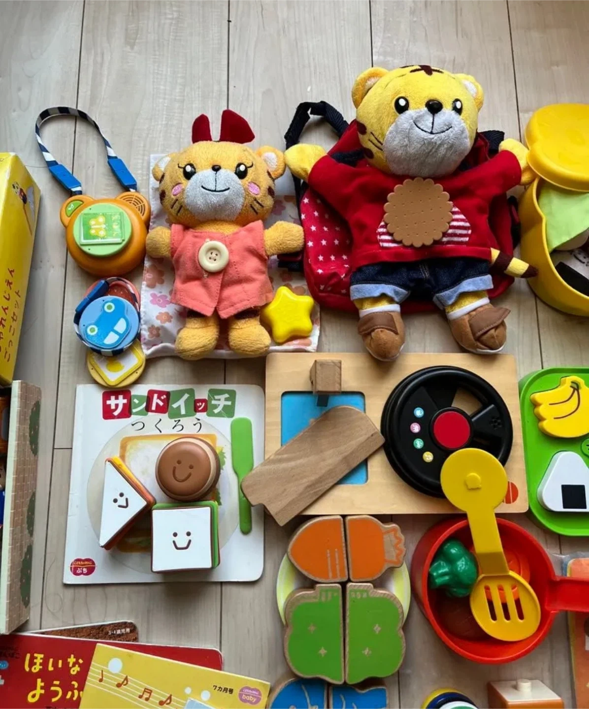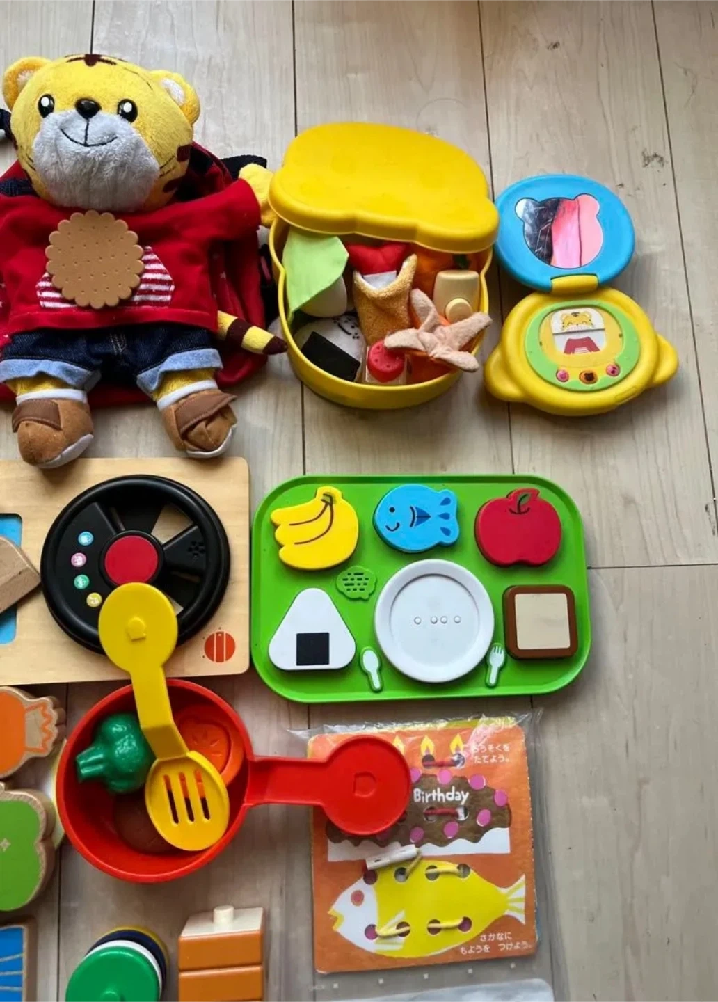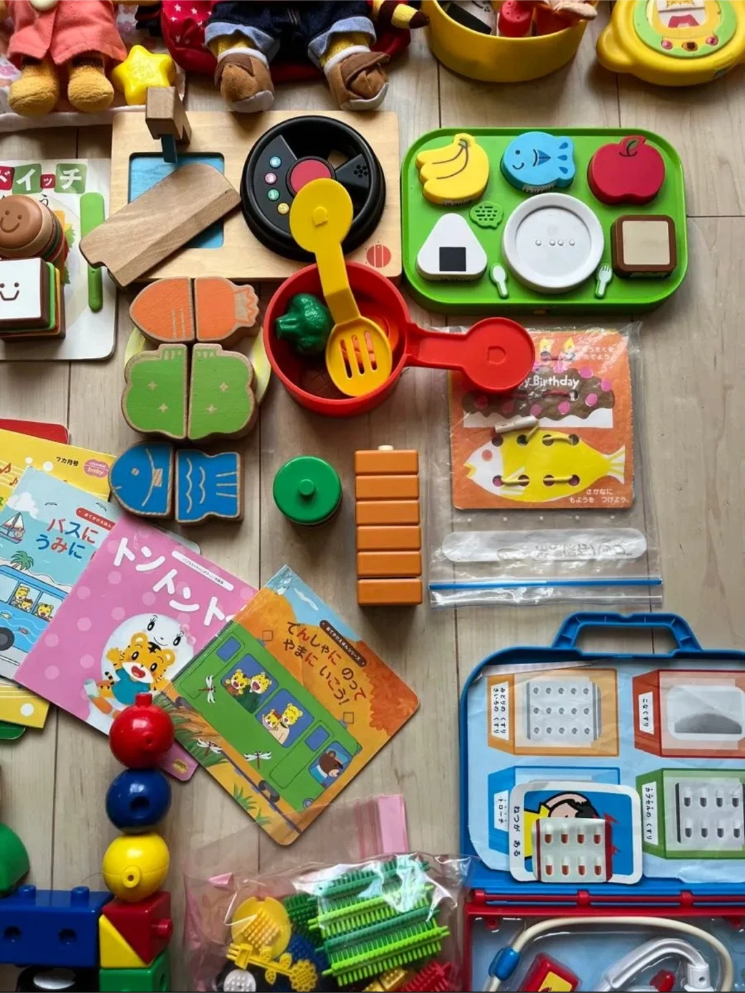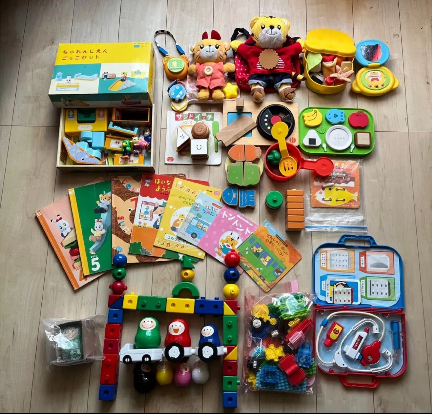 2歳児、3歳児用のこどもちゃれんじ 2年分の知育玩具を大量セットにまとめました! さすがベネッセという感じですごくハマってよく遊んでました。他にこどもちゃれんじ、しまじろうグッズ出品しています。宜しければご覧ください。 おまとめ買いに限りお値引き対応致します 【情報】 ブランド:ベネッセ 商品:おもちゃセット 【内容】 ・絵本複数冊(一部2016年表記あり) ・ぬいぐるみ2体 ・おままごとセット(食材、調理器具など) ・組み立てブロック ・知育玩具(お弁当、サンドイッチなど) ・お医者さんセット ・その他おもちゃ 【状態】 使用感はありますが、全体的にきれいです 中古品であることご了承ください