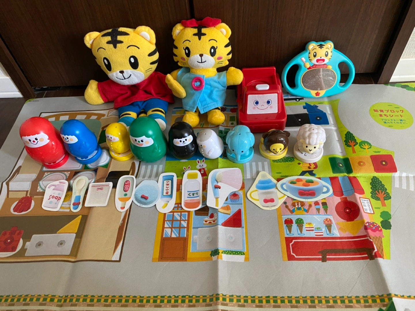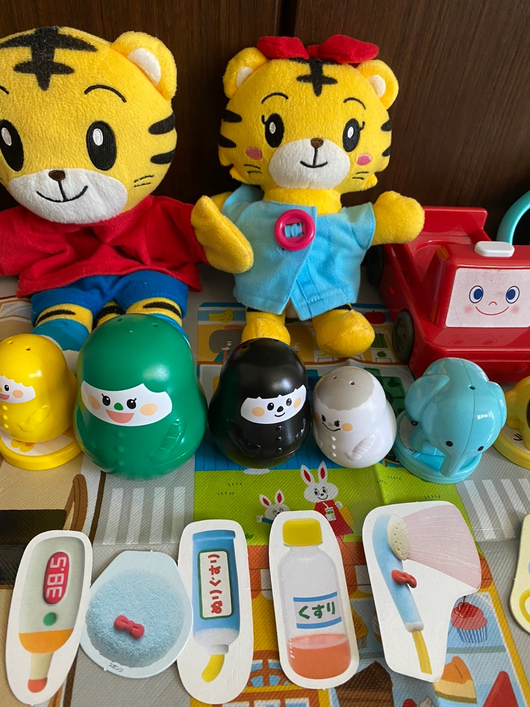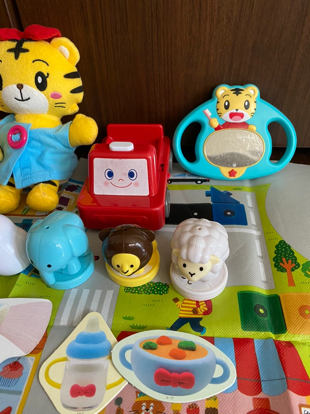 1〜2歳のお子様が特に楽しめると思います♪ 赤い車に動物を乗せると 色々な音が鳴り、とても楽しいです。 マトリョーシカあそび、はなちゃんのお世話セットなどなど盛りだくさんです。 歯磨きミラーは歯磨きが苦手なお子さんにぴったりです! 全て子どもが使用した物ですので 音が多少不鮮明な所もあるかもしれません。 かなり格安ですので、 ご理解頂ける方のみご購入をお願い致します! Englishも出品しております♪
