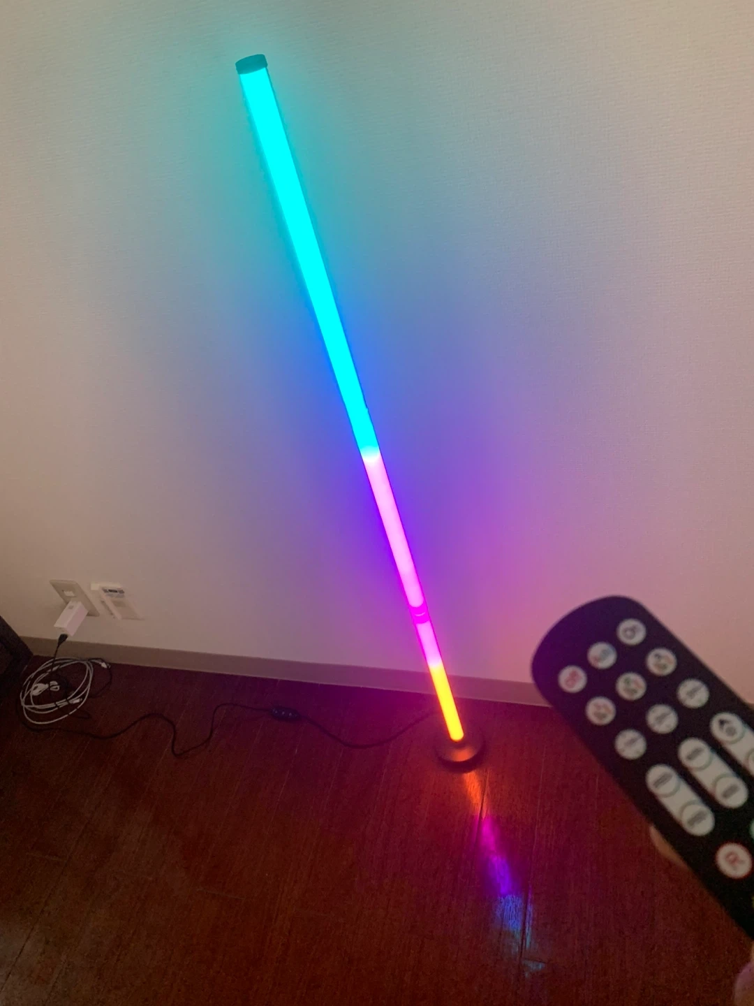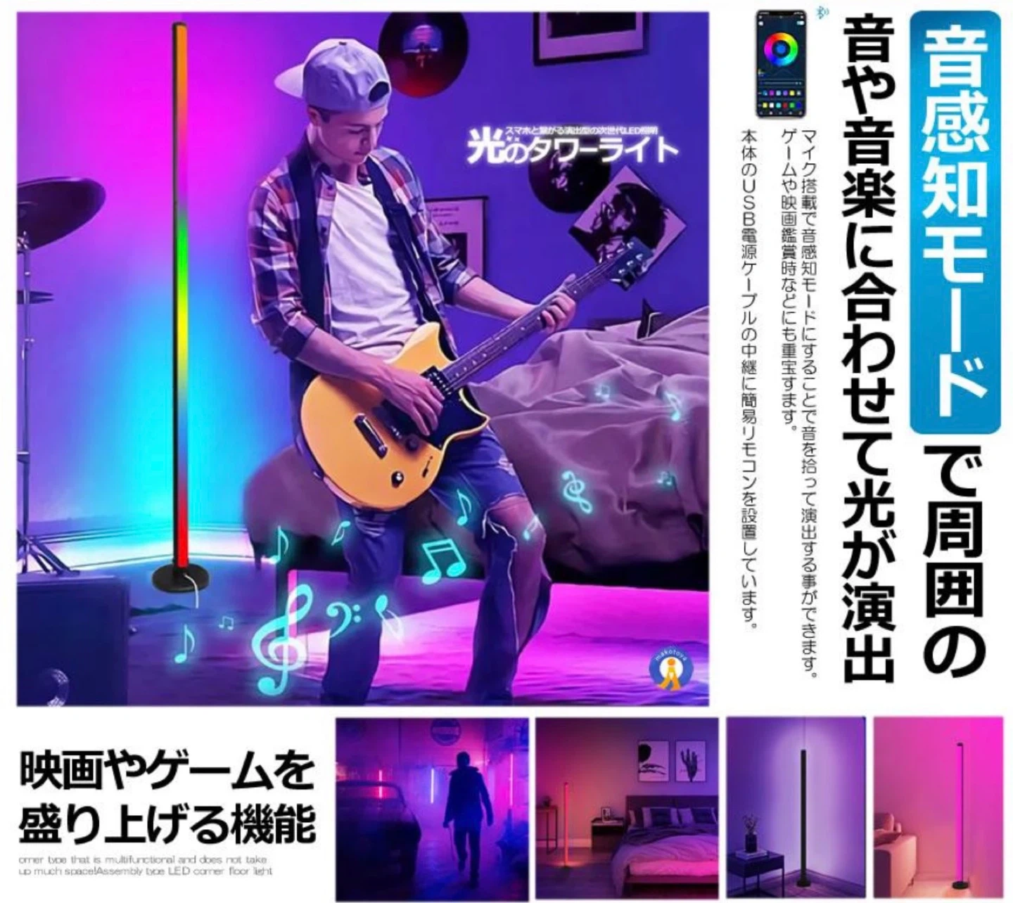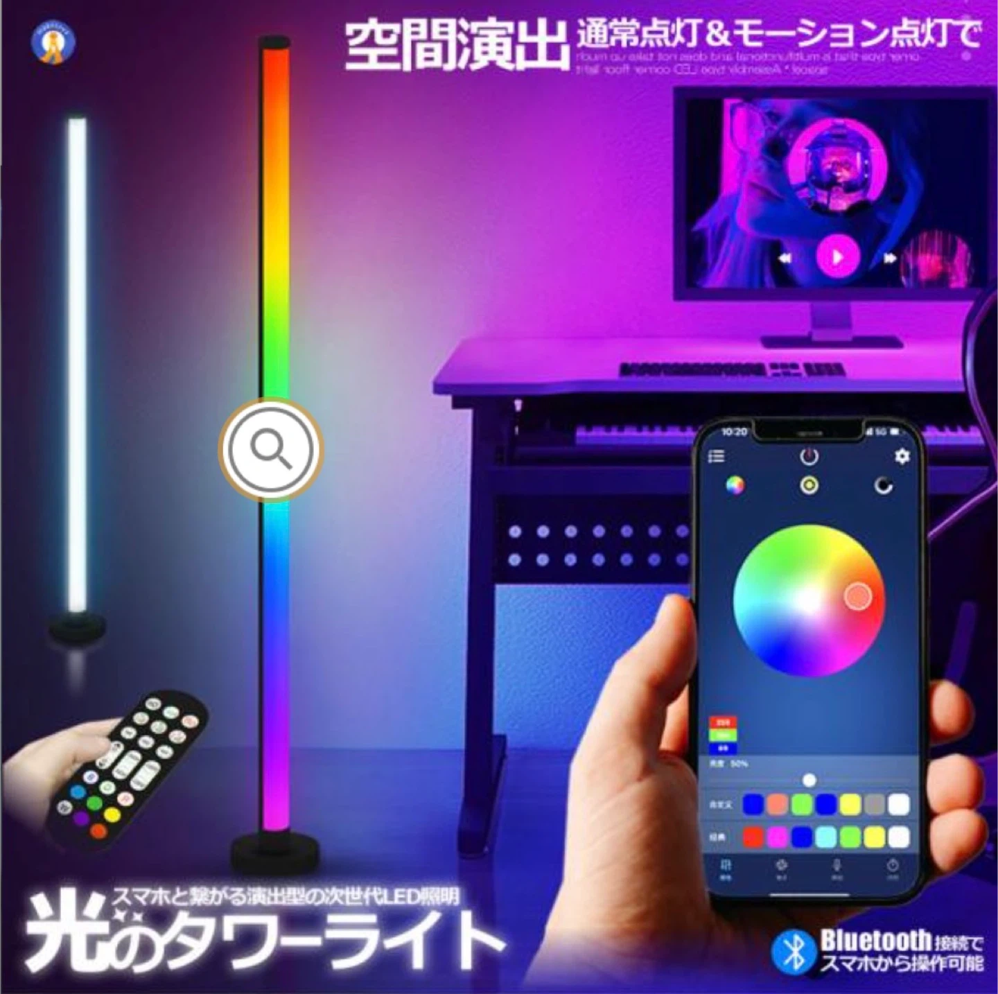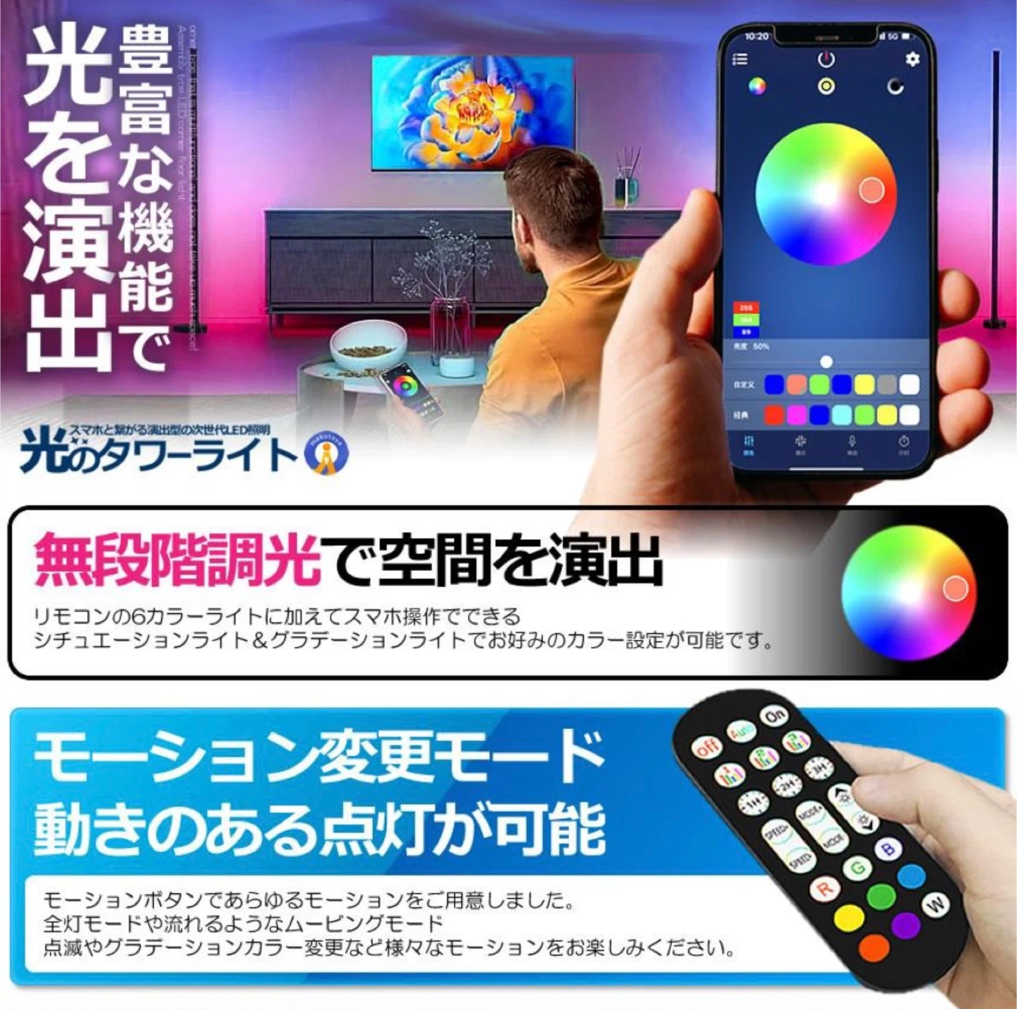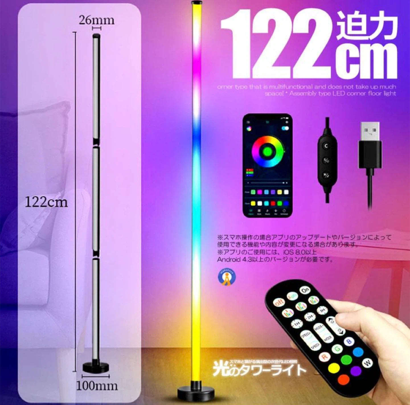 ご覧いただきありがとうございます! スムーズに気持ちよくお取引出来るよう、迅速丁寧な対応を心がけております。 【商品説明】 光のタワーライト フロアランプです ・サイズ:約122cm ・組み立て式 ・リモコン付き ・USB電源 多機能で場所を取らないコーナータイプ! 組み立て式LEDコーナーフロアライト Bluetooth接続でスマホから操作可能 スマホ操作で専用アプリを使用すればライトの色調整や無段階調光、 音に合わせて光るミュージック機能などより自由度が高い設定が可能です。 無段階調光で空間を演出 シチュエーションライト&グラデーションライトでお好みのカラー設定が可能です。 ・モーションモード変更で動きのある点灯が可能 ・モーションスピードを20段階まで変更可能です ・音感知モードで周囲の音や音楽に合わせて光が演出 ・場所を取らないコーナータイプ ・3つの場所で操作できるマルチプレイ仕様です ・オンオフタイマー設定 ※2025年5月に購入し、そのままほぼ使用せず自宅保管品した物です。 ほぼ使用しておりませんが、あくまでも中古品であることご了承ください。