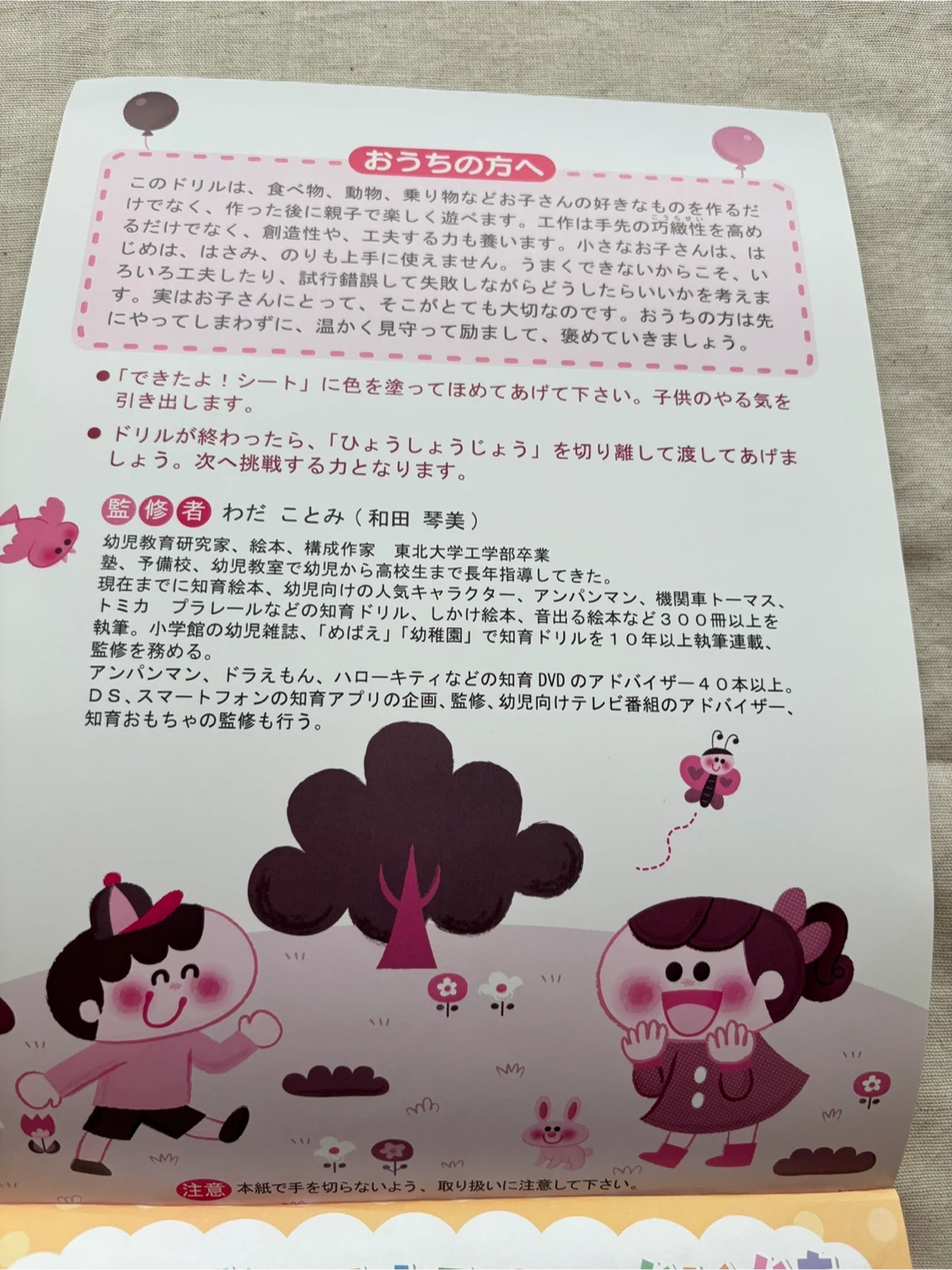 知育ドリル はじめてのこうさく3.4.5歳 定価1000円+税 37ページ中 1.2.3.4.27ページのみ使用してありませんが、それ以外未使用で書き込みなどもなく 綺麗です。 ・対象年齢:3-4-5歳 ・「はじめてのこうさく」と記載 ・手先の器用さと創造性工夫する力を育てます ・できたよ!シート、ひょうしょうじょうつき 中古品であることご了承ください