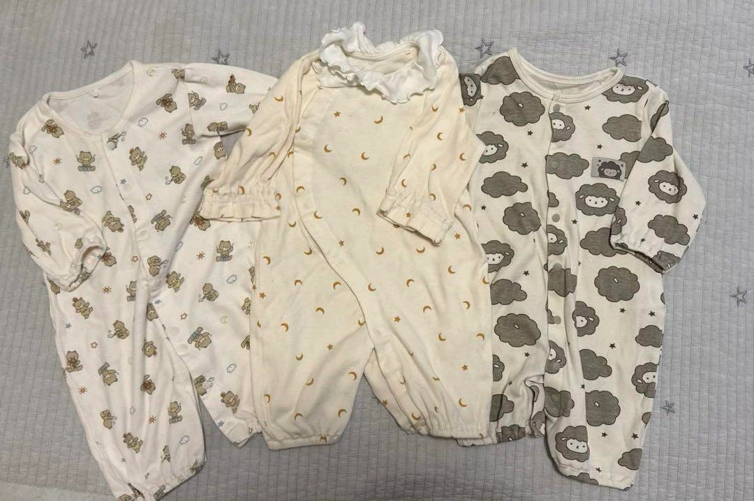 可愛い羊と雲のデザイン、クマ柄、月柄のツーウェイ・ドレスオール3点セットです。柔らかいコットン100%素材。 - サイズ: 50-60cm - 素材: すべてコットン 100% ご覧いただきありがとうございます。 着用感はありますが素材も柔らかく、まだまだきていただけます。 ご希望の方はお気軽にご連絡ください。