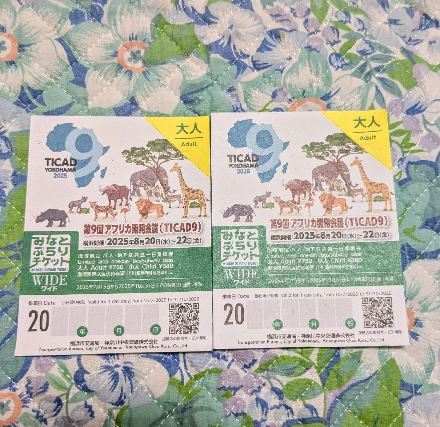 みなとぶらりチケットWIDE2枚です 特典サービスガイド ベイシティマップ付き どなたか使っていただける方に 【情報】 種類:みなとぶらりチケットWIDE イベント:第9回アフリカ開発会議(TICAD9) 有効期限:2025年7月15日~2025年10月31日の乗車日1日限