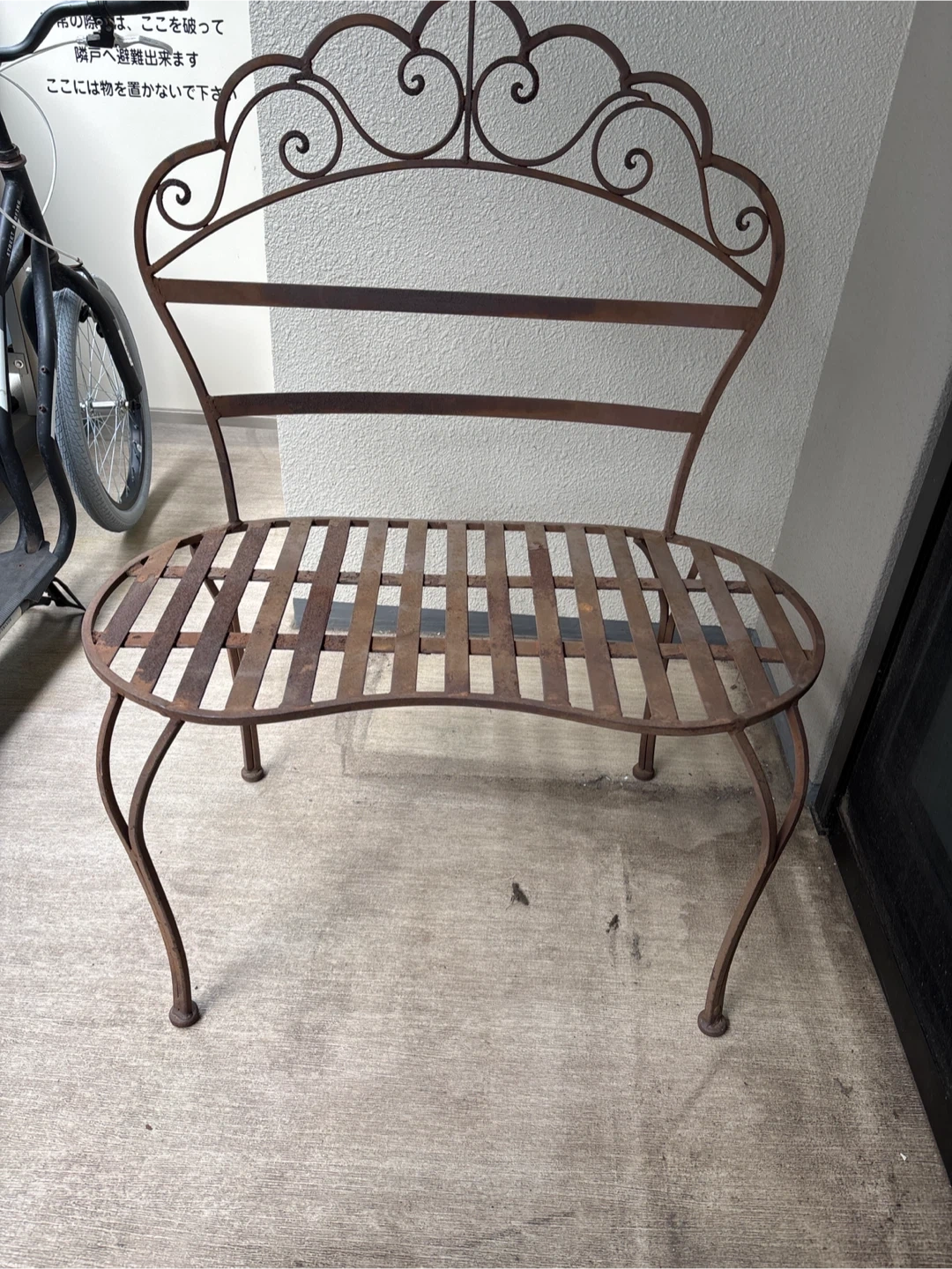 アイアンのチェアです。 ・色:ブラウン ・材質:アイアン ・状態:錆、使用感あり 中古品であることご了承ください 引き渡し場所はタコ公園となっていますが、お取引の際は公園近くの自宅前になります。
