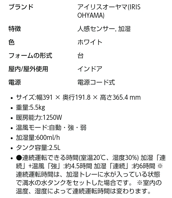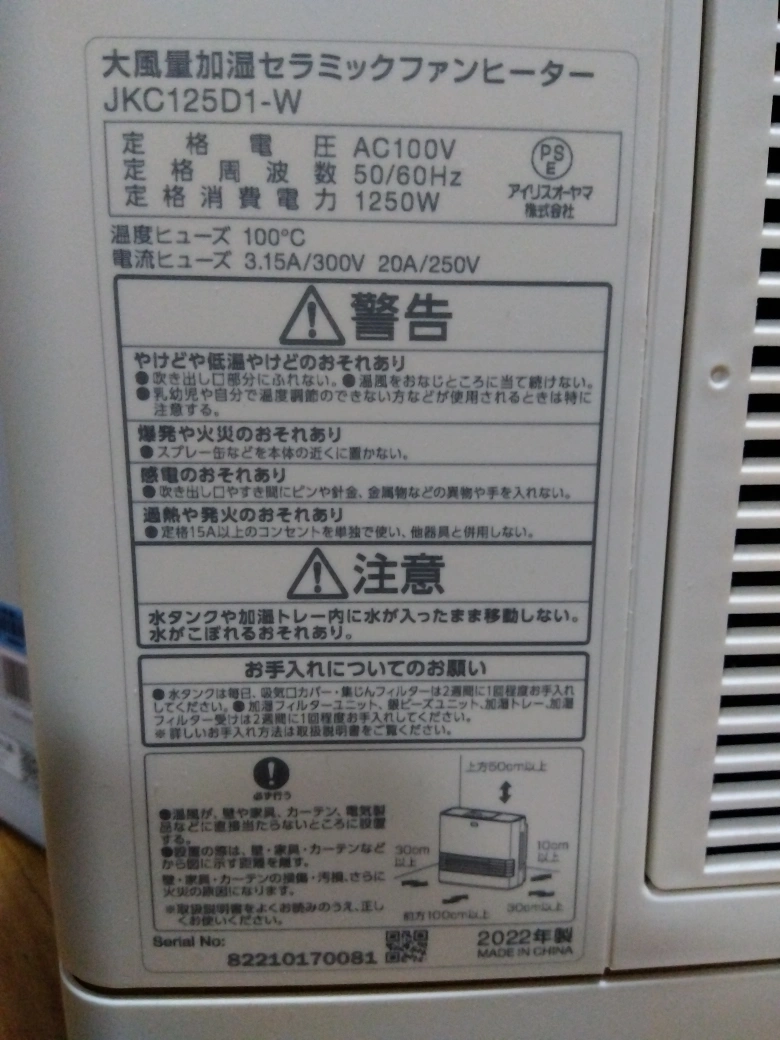 アイリスオーヤマ セラミックファンヒーター JKC125D1-W 1200W 加湿機能付き 詳細は画像を参照してください。 2年前に購入し、数回使用。 加湿機能は未使用なので、水を入れるタンクも未使用です。 エアコンばかりで結局使わないので出品します。 重量5.5キロあります。 箱に入れてお渡ししますが、重いので駅まで持っていくのが難しいです。 お渡し場所は自宅付近でご相談させてください。