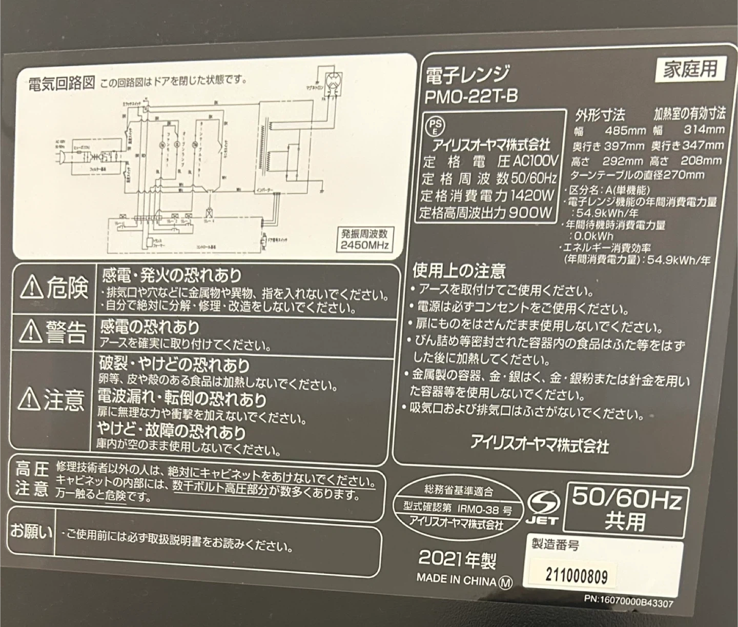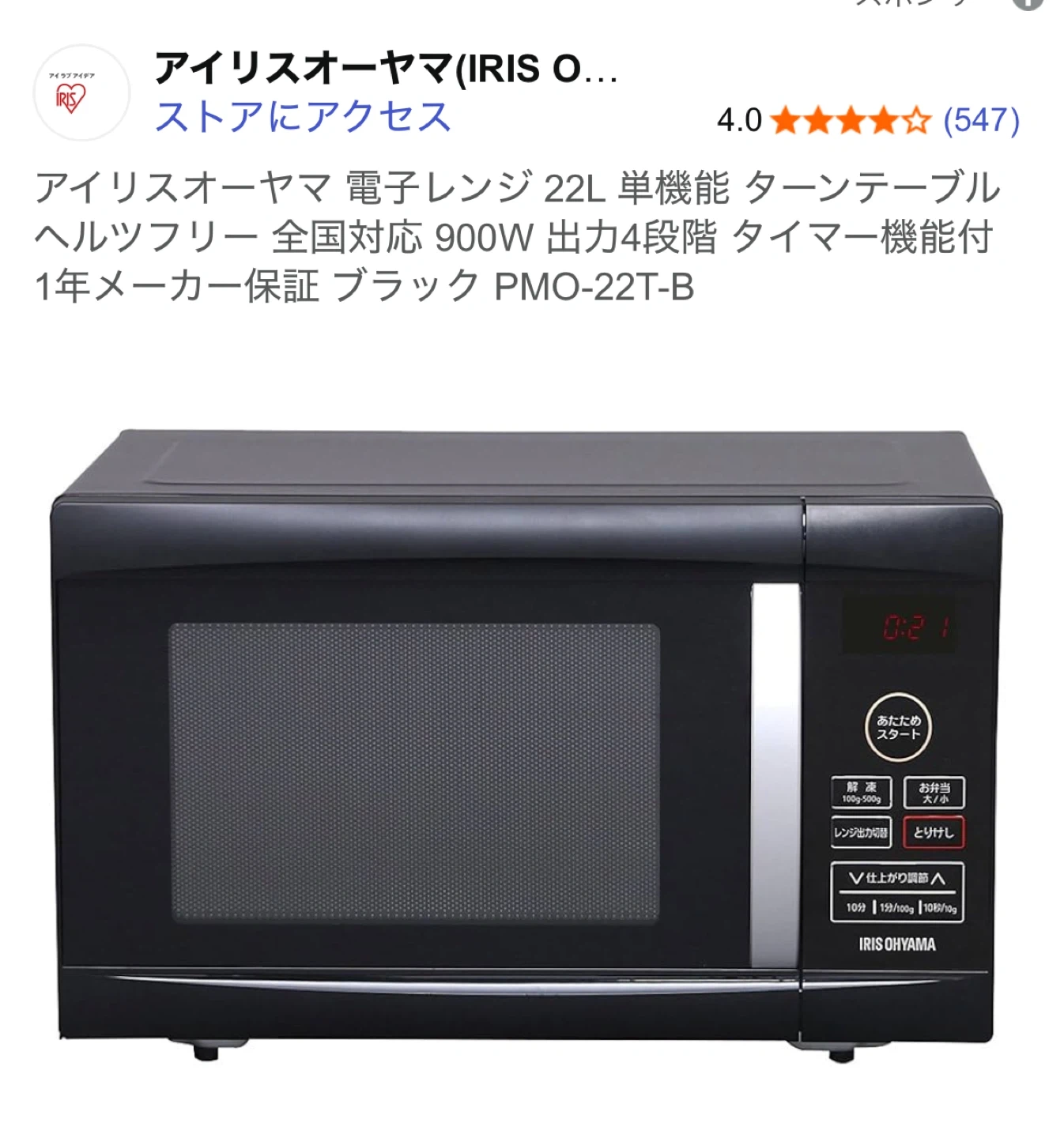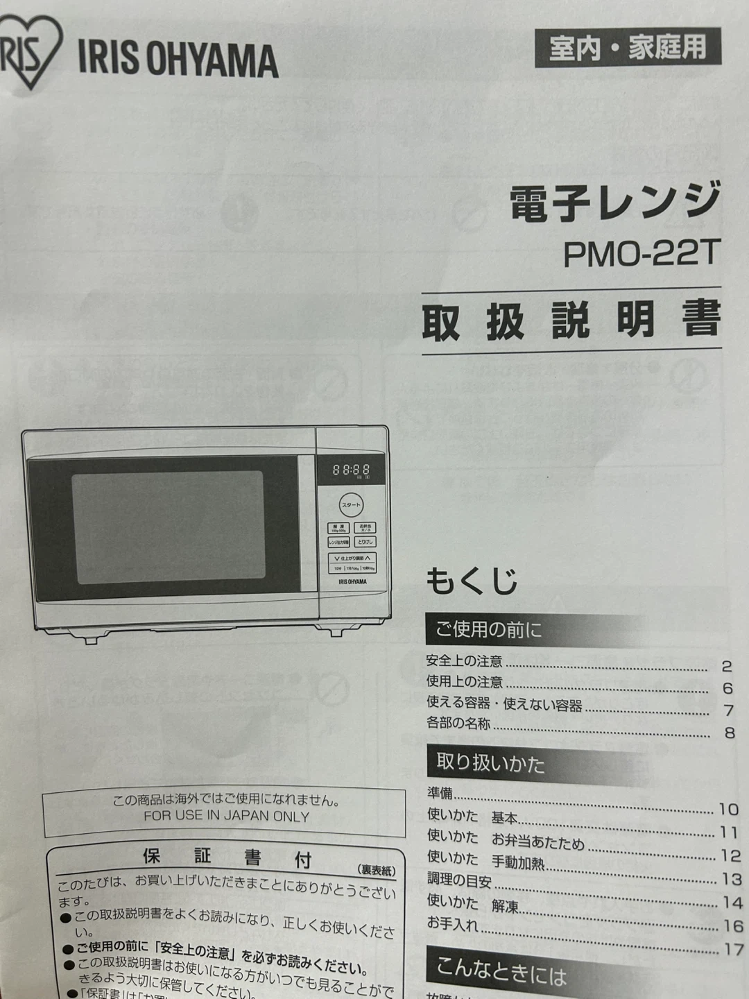 アイリスオーヤマの電子レンジです 【情報】 ブランド:アイリスオーヤマ 型番:PMO-22T-B 容量:22L カラー:ブラック 年式:2021年製 【状態】 目立った傷はありませんが、中は若干使用感はあります。 200W、500W、700W、900Wの出力があります 受け渡しは、10月18日か19日でお願いしたいです 中古品であることご了承ください