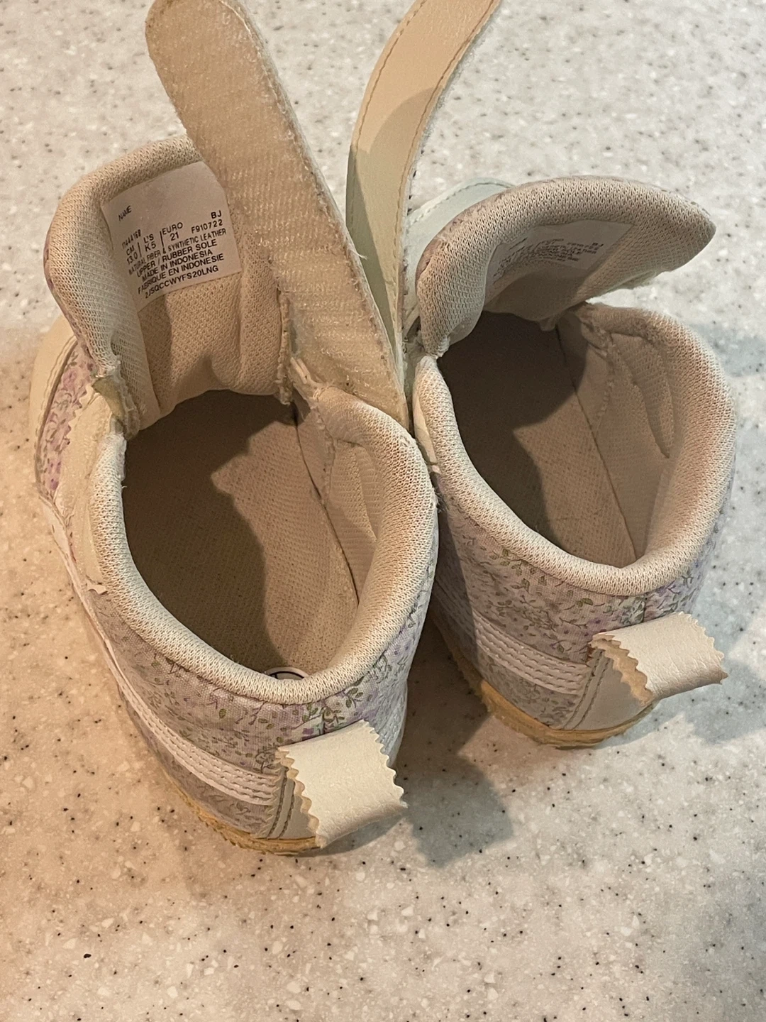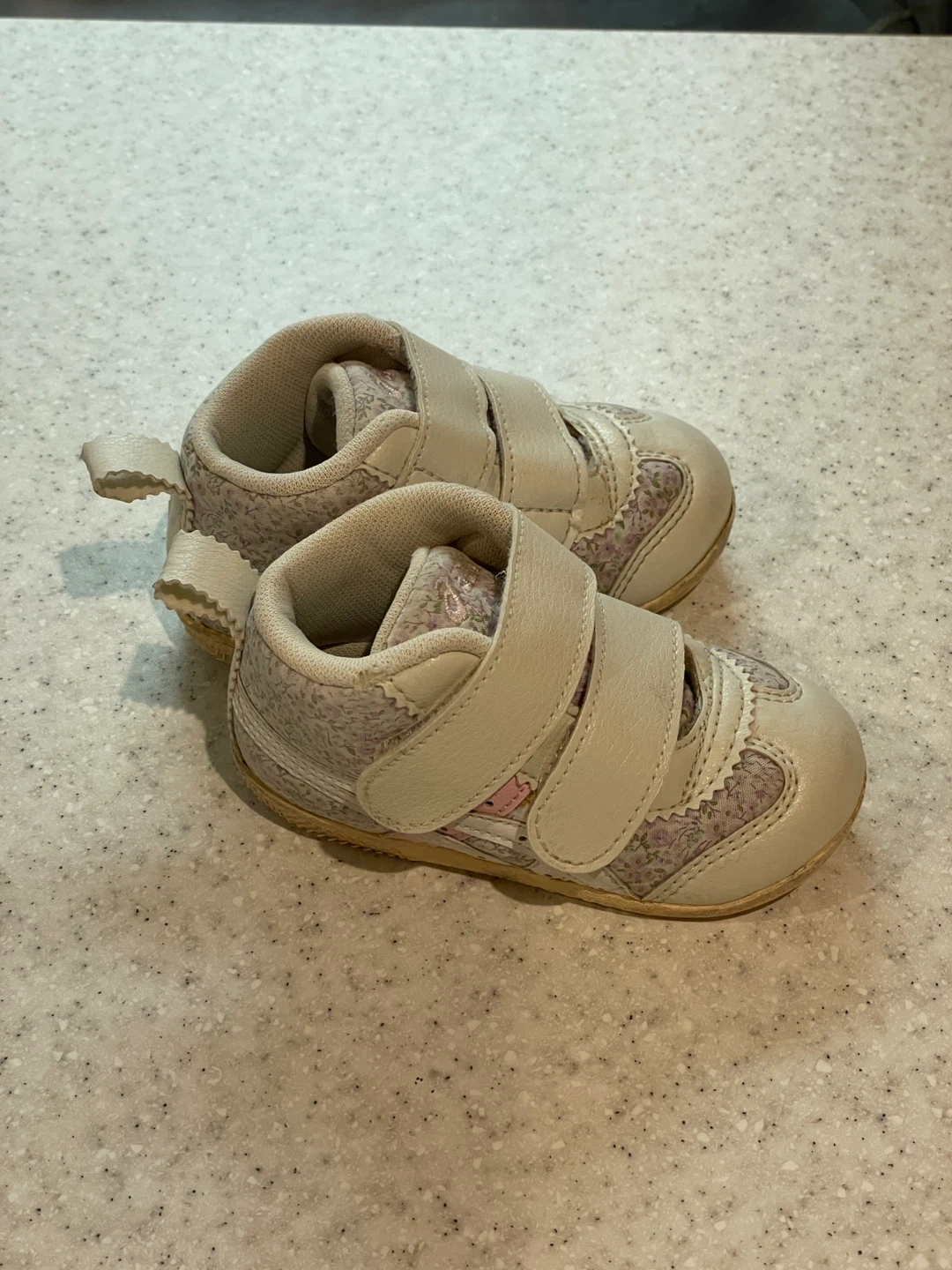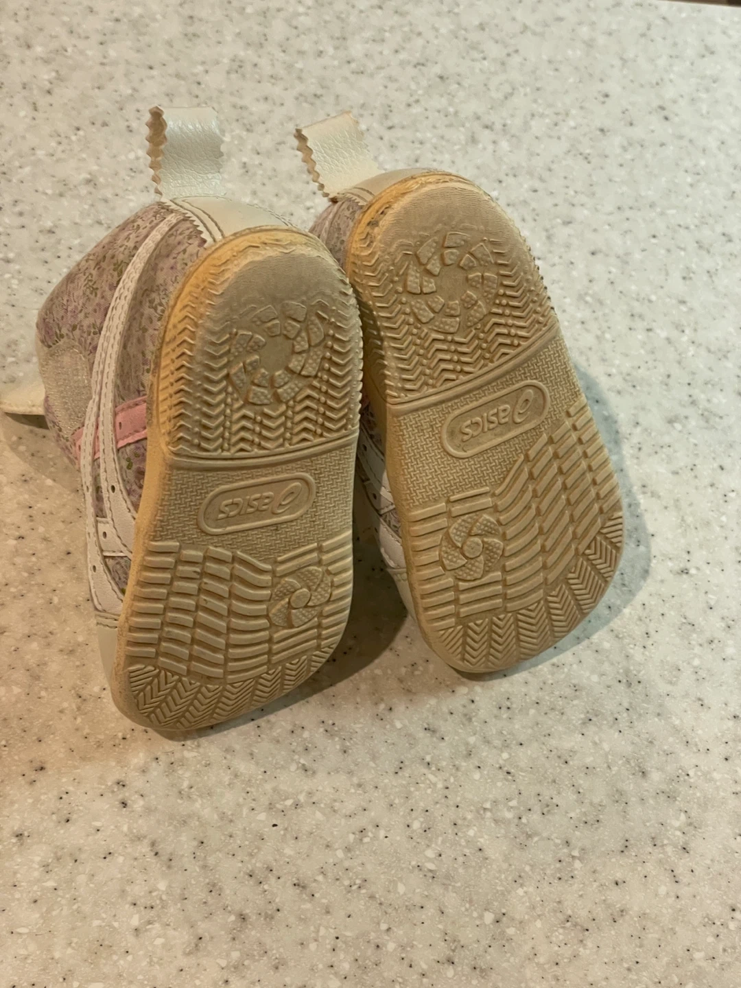アシックスのベビーシューズです。 ・ブランド:アシックス ・色:白、紫花柄 ・サイズ:EU19 (11.5cm相当) ・使用感あり ・左足シミあり 中古品であることご了承ください