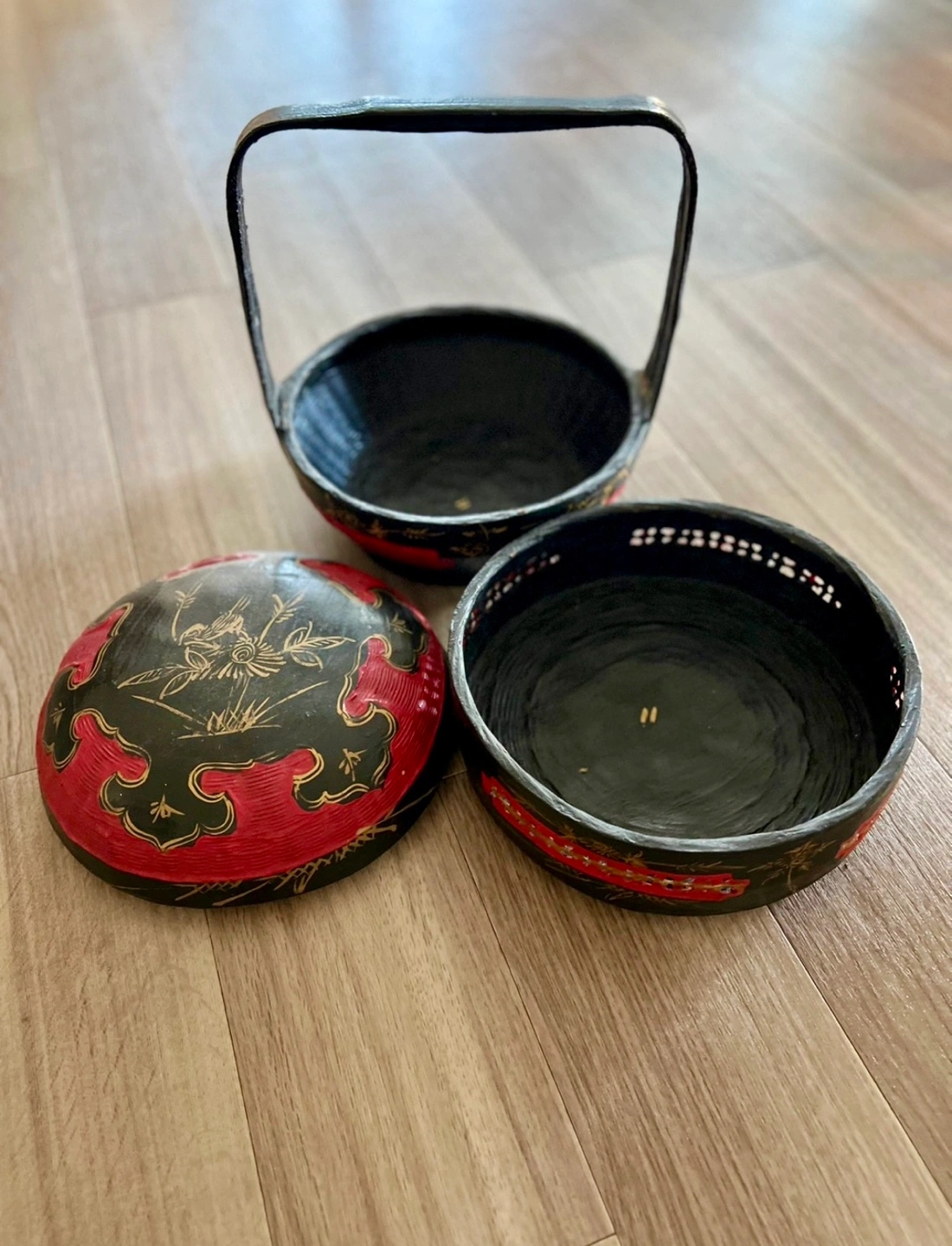 昔、シンガポールに旅行に行った時に購入。婚礼の際に反物やフルーツなどを入れて運ぶ、おめでたい籠で、中国の都市部では今やアンティークショップでしか見当たらないものです。 おそらく、もう現地ではほとんど作られていないと思われるビンテージ ウエディング・バスケット、アジアンテイストのお部屋やお店のインテリアにいかがでしょうか🧺 クロゼットに閉まっていて使っていなかったので使用感はありません。