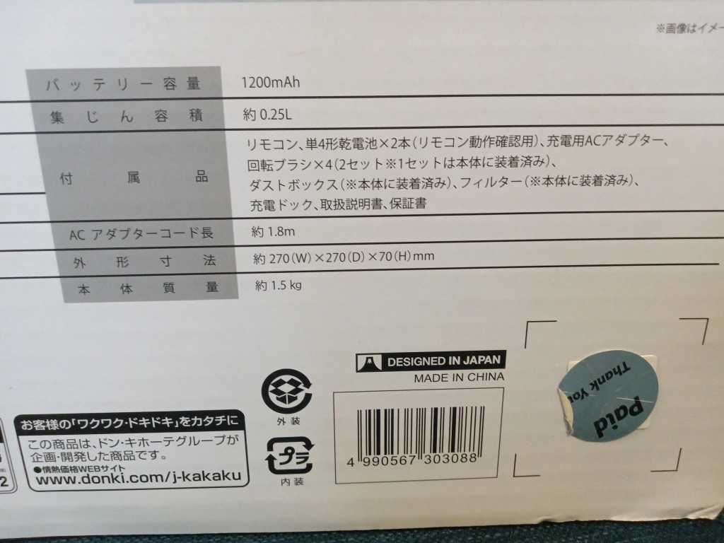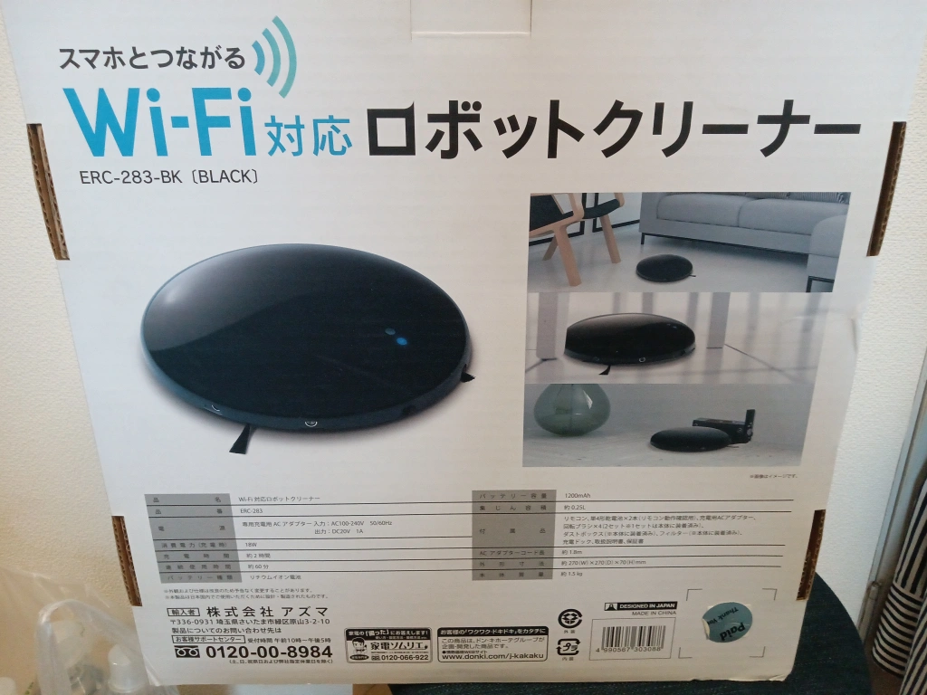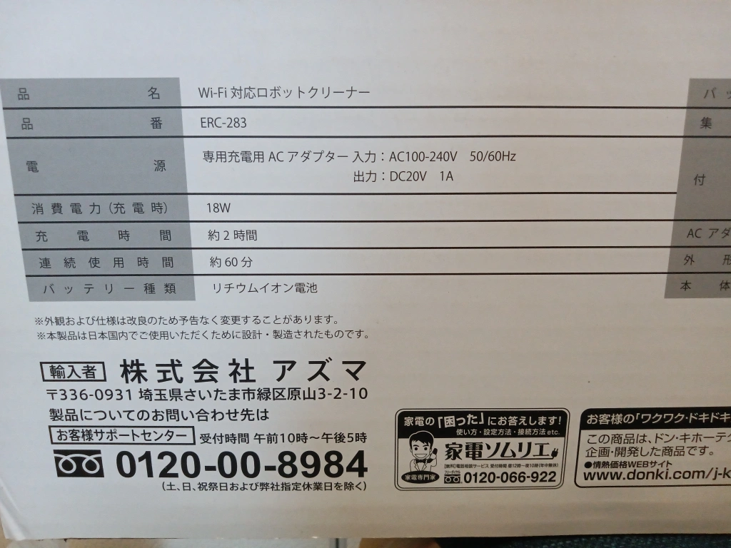 アズマのロボットクリーナーです 【情報】 ブランド:アズマ 型番:ERC-283-BK(BLACK) 【仕様】 電源:専用充電用ACアダプター入力:AC100-240V 50/60Hz 出力:DC20V 1A 消費電力(充電時):18W 充電時間:約2時間 連続使用時間:約60分 バッテリー容量 :1200mAh 集じん容量:約0.25L 本体質量:約1.5kg 本体寸法:約270(W)×270(D)×70(H)mm 【付属品】 リモコン、単4形乾電池x2本(リモコン動作確認用)、充電用ACアダプター、回転ブラシx4(2セット※1セットは本体に装着済み)、ダストボックス(※本体に装着済み)、フィルター(※本体に装着済み)、充電ドック、取扱説明書、保証書 ACアダプターコード長:約1.8m 新品ですが購入してから年月がたっています。御納得の上でご購入下さい。
