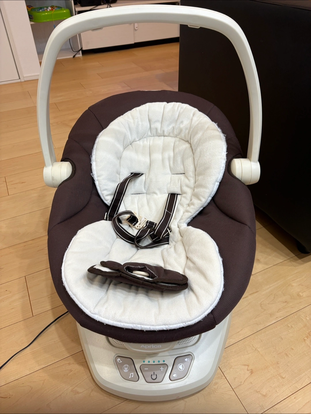 アップリカスマートスウィング 音楽なりません ボタン接触悪い ボタンおして揺らすと左右に自動で揺れます。 ボタン押して止めることができないので、電源を抜くかそのままゆれたままになります。 角度調整は2段階です。 ⚠️左右に揺れればいいって人のみ購入お願いします。