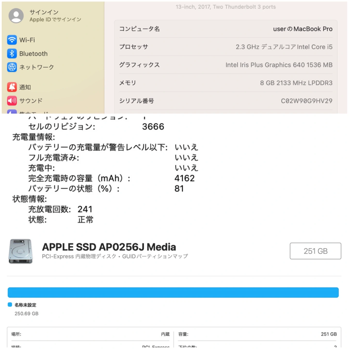 Macbook Pro 2017 A1708 8/256GB ■スペック • モデル:MacBook Pro 2017 (13インチ / Thunderbolt 3 ×2ポート) • CPU:2.3GHz デュアルコア Intel Core i5 • メモリ:8GB • SSD:256GB • OS:macOS Ventura 13.7.8 ⸻ ■付属品 • MacBook Pro 本体 • ACアダプター(純正品ではなく互換品です) ⸻ ■バッテリー情報 • 状態:正常 • 充放電回数:241回 ⸻ ■動作状況 • 全機能動作確認済み • Apple診断テスト異常なし • アクティベーションロック解除済み • 初期化済み、すぐにご使用いただけます ⸻ ■外観・状態 • 中古品のため多少の使用感はありますが、全体的に良好な状態です • バッテリー充放電241回と少なめで安心 • 動作は問題ありませんが、ディスプレイ左側に黄ばみがあります(7写真参照)。返品・クレームはお受けできませんのでご了承ください。 ⸻ ■発送について • プチプチで丁寧に梱包し、当日発送 ⸻ ■注意事項 • 中古品につき、神経質な方や完璧を求める方はご遠慮ください
