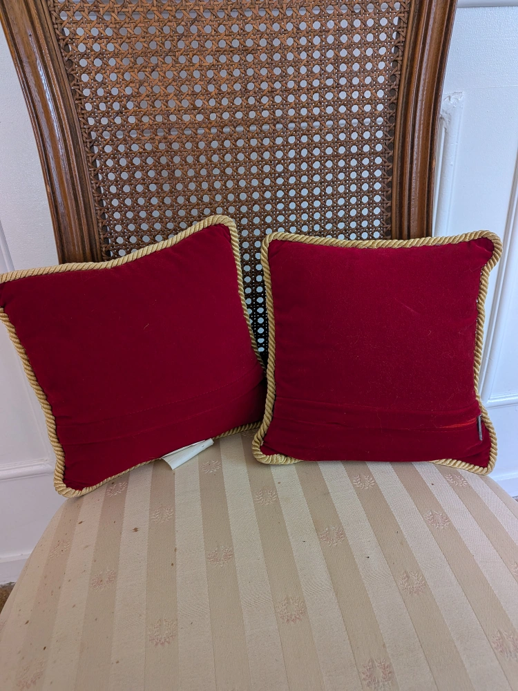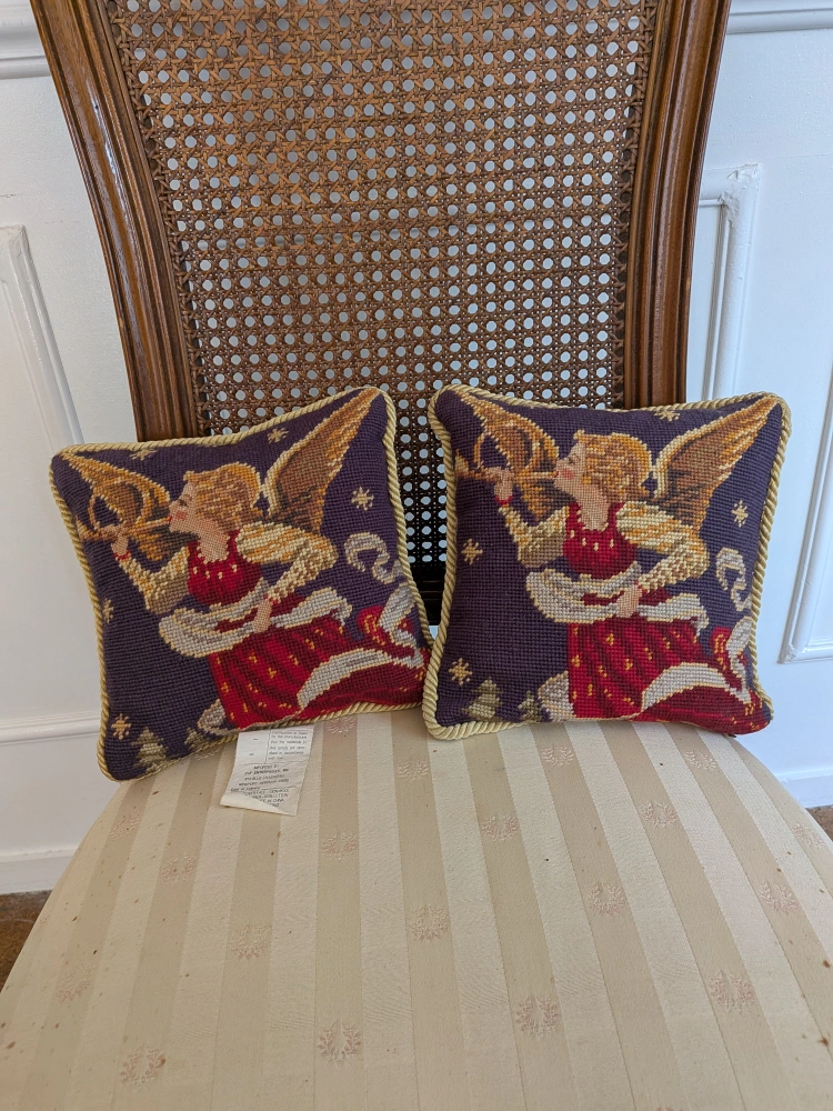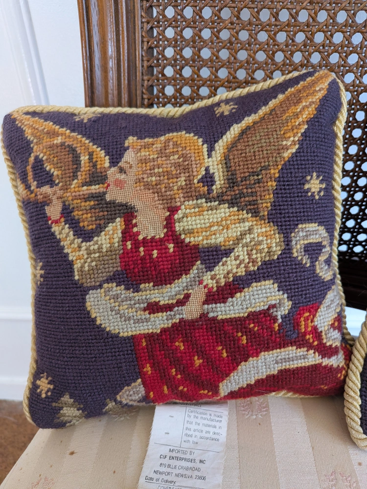 (アメリカ)ヴィンテージ天使のクリスマスミニクッション2個セット&サンタと天使の置物になります。 ・天使の模様 ・裏面は赤色の無地 ・素材:表面ウール100%、裏面コットン100% ・小さなタグ付き(C&F ENTERPRISES, INC)両方とも10年ほど前にアメリカから購入した物になります。天使のクリスマスミニクッションは前面にはホルンを吹く天使が施され背面はベロア生地になり縁にはゴールドのロープが施された高級感溢れるミニクッションになります。またクリスマスシーズン以外にも素敵なインテリアとして飾って頂けます。サンタクロース置物と天使のツリートッパーもゴールドとシルバーで細部までこった作りがアメリカらしいインテリアになります。急ぎで本日中に現金手渡しにて引き取り可能な方よろしくお願いします。ミニクッションのサイズは縦✕横25cmになります。置物は高さ約30cmほどになります。ご質問などはお気軽にお問い合わせ下さい!今年のクリスマスにいかがでしょうか?