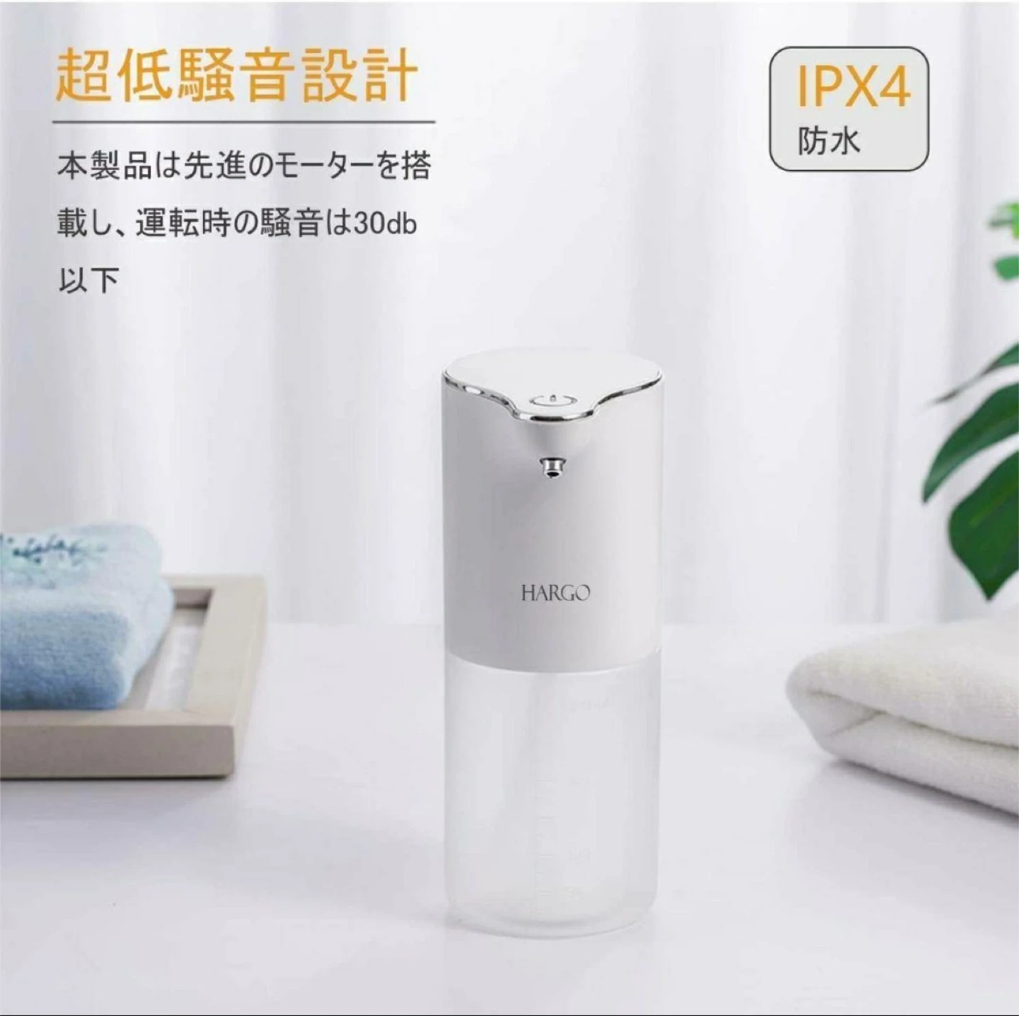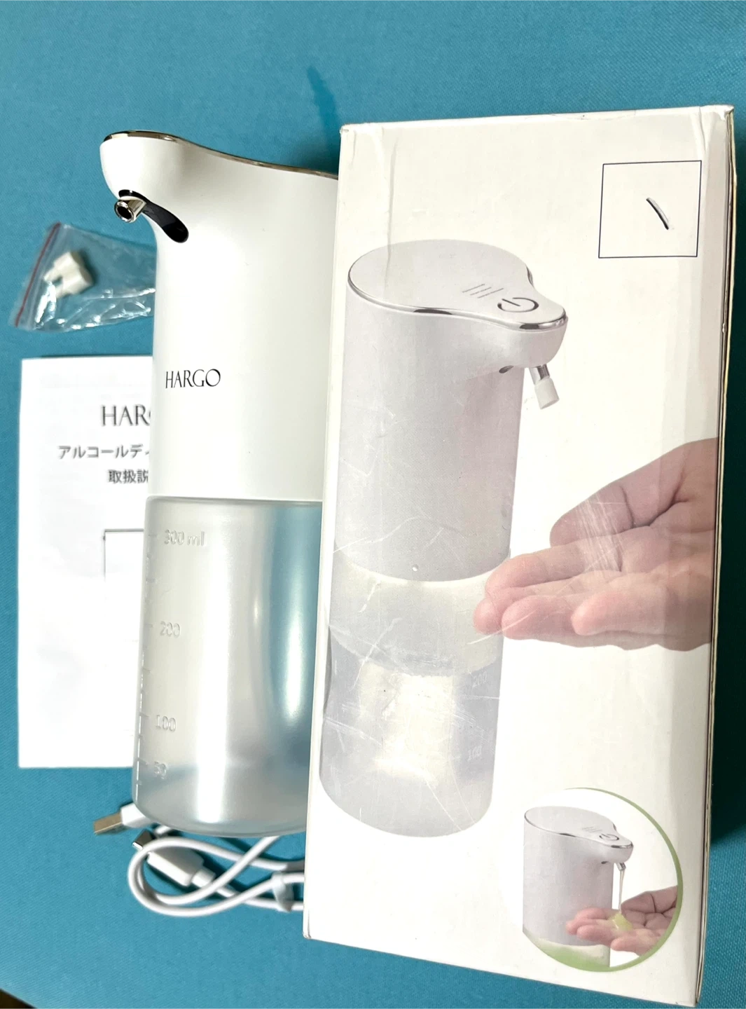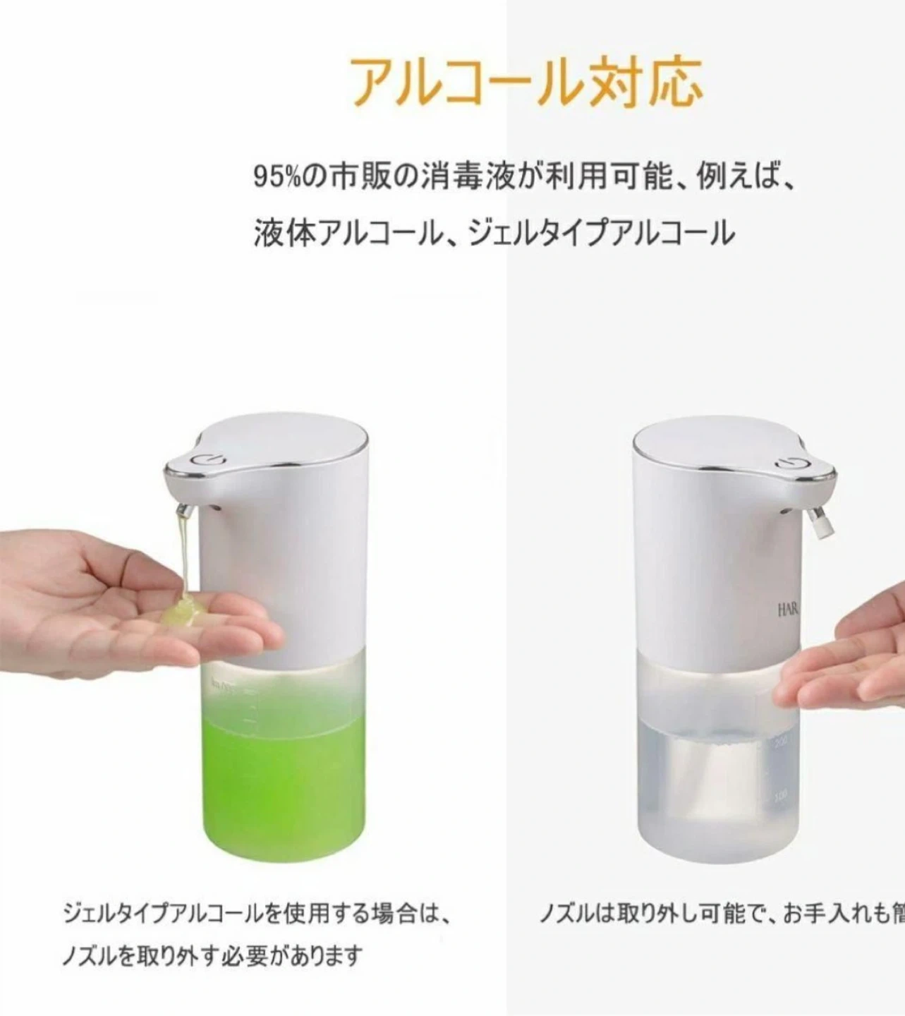 手をかざすだけで液が噴出してきますので、忙しい時や帰宅時などでスムーズに手を清潔にできます。 普段の手洗いでインフルエンザ対策にも活躍します。如何でしょうか 【購入時の商品説明】 ◉4段階調節&洗浄モード 噴出量の時間が0.5秒、第2段階1秒、の2段階で切り替えられます。 ◉場所を取らない直置き・壁掛け兼用&USB充電式 置き型としてはもちろん、壁に貼り付けてカウンタースペースを確保することもできます。 ◉半透明な320 ml大容量タンクのため、頻繁に液を入れる必要はありません。半透明の容器の設計ですので、液を補充する必要があるかどうかを確認するのに便利です。 カラー:ホワイト/透明 ブランド:Hargo サイズ:9.7長さ x 7.2幅 x 18.2高さ cm 形状:円筒形 防水性能:IPX4 充電式:USB typeC 液状、ジェルタイプのアルコールが可能(ジェルタイプの場合はノズルを取り外してご使用ください) →ノズルは外してお手入れ可能 ◉中身確認と動作確認のため1度開封しておりますが新品未使用です。◉1度出しているので未使用に近いにしていますが、新品・未使用品です。 ご了承の上ご購入下さい。