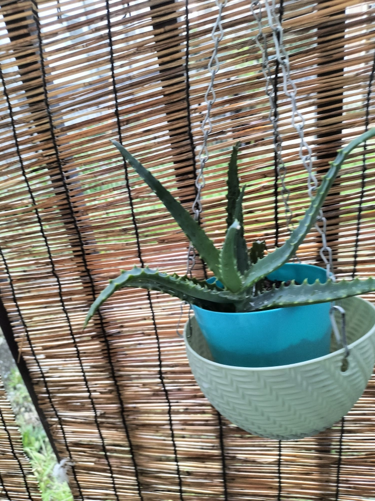 アロエの鉢植えです ・鉢の色:水色、白 ・吊り下げチェーン付き ・植物の種類:アロエ 中古品であることご了承ください