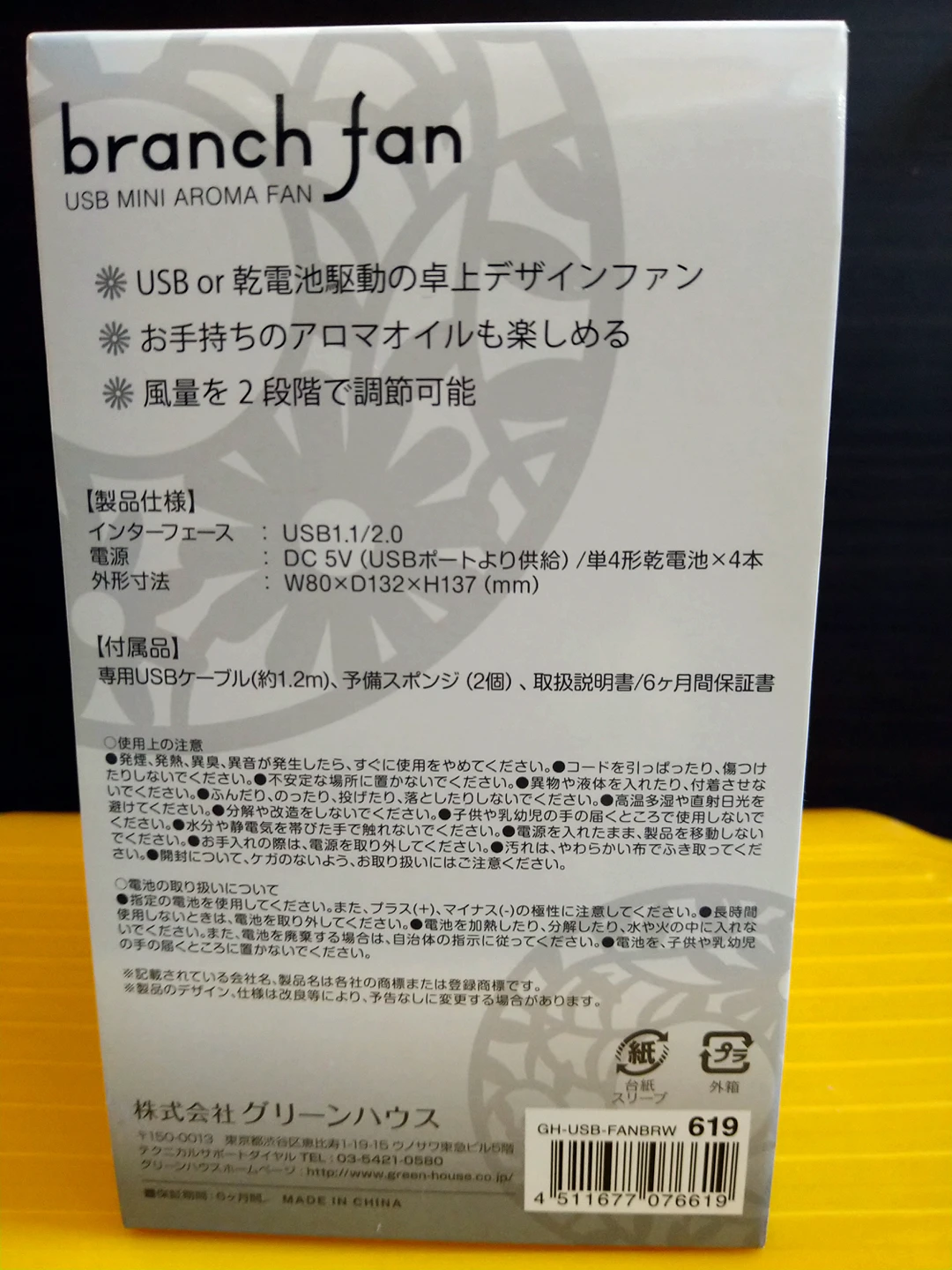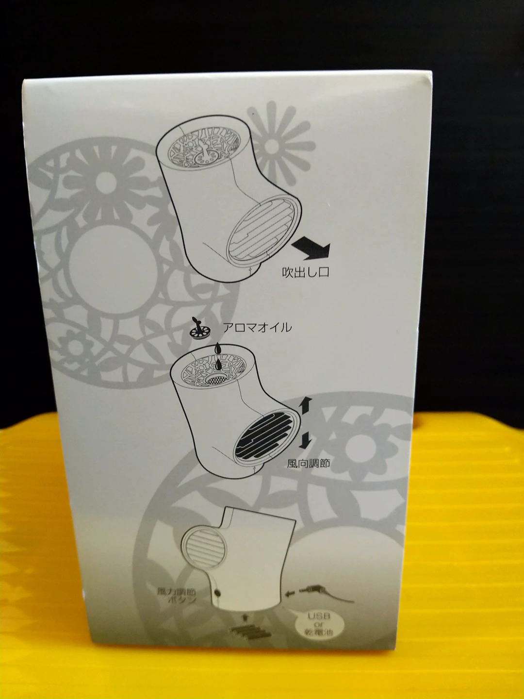アロマオイルを入れて使用します。 USBまたは乾電池で駆動する卓上デザインファン、風量を二段階で調節可能。 いただき物で保管していましたが、使用機会がないのでお好きな方に譲ります。 新品未使用ですが内容確認のため箱から出しました。動作確認はしていません。外箱は少し傷みがあります。長期保管品ですのでご理解いただける方のみお願いします。