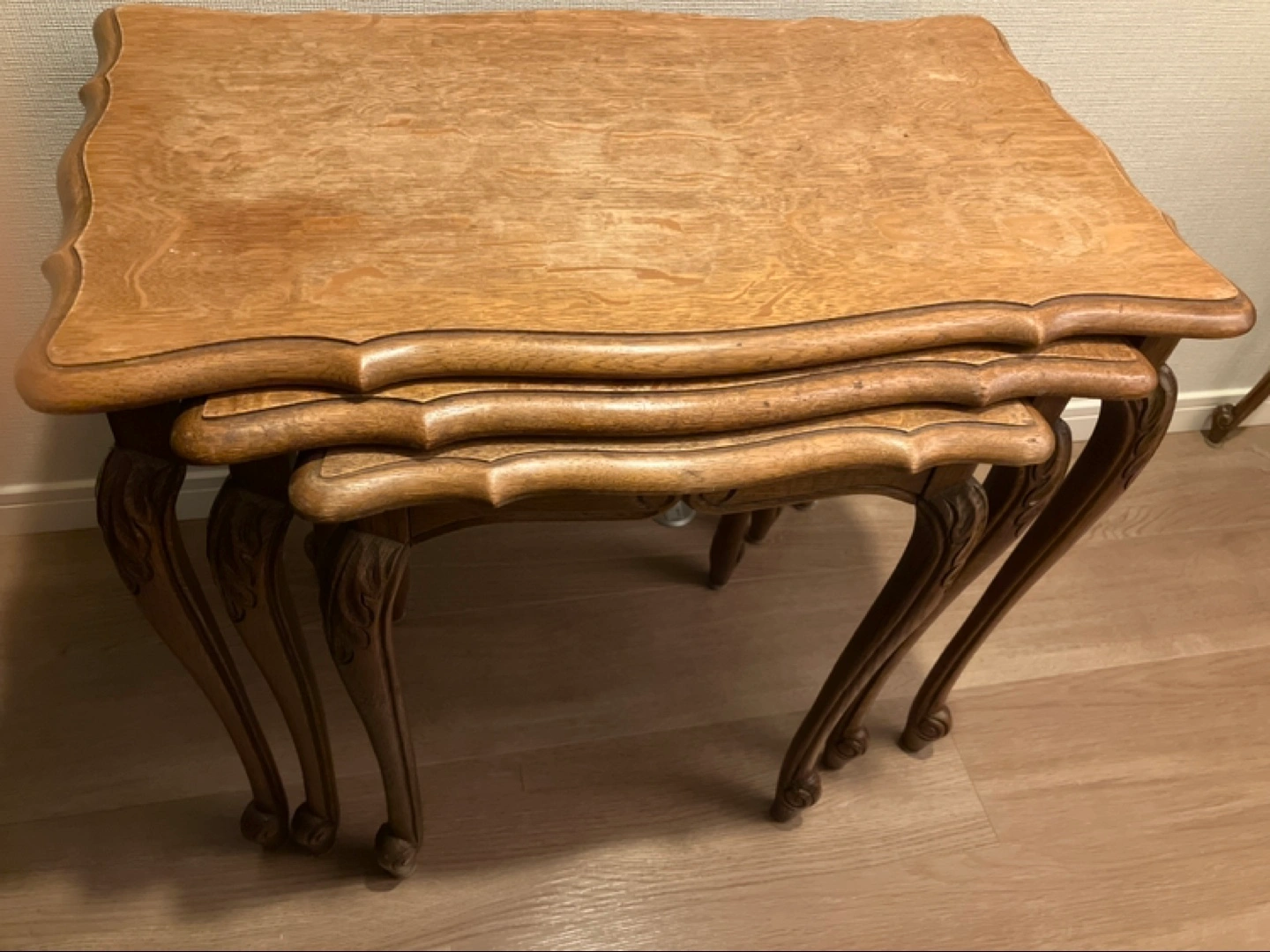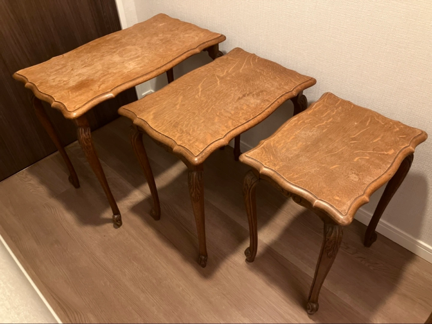 アンティークの三つ組テーブルです。 20世紀前半のイギリスアンティーク。 素材はオーク。 アンティークショップでの購入時は3万6000円でした。 引っ越しのため処分します。 ※サイズ大の脚の1箇所に補修があるため処分価格です (3枚目写真参照) 大:幅60cm 高さ52cm 奥行35cm(※) ※三つ組時は奥行38cm 中:幅49cm 高さ49cm 奥行33cm 小:幅38cm 高さ47cm 奥行29cm