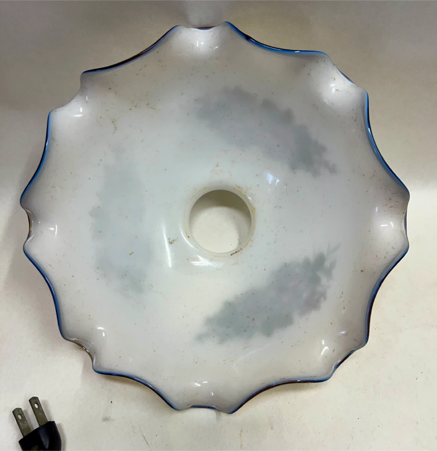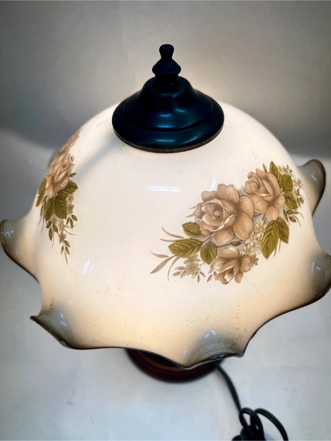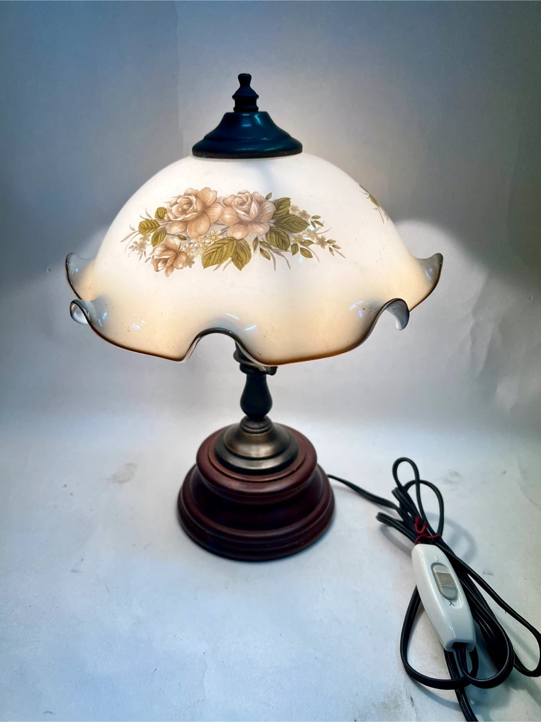 アンティーク フリルガラス 硝子 薔薇図 卓上 テーブルランプ 木製台座です。 多少汚れておりますが、無キズで良い状態です。 高さ約28cm フリル硝子径約22cm 木製台座径約12cm