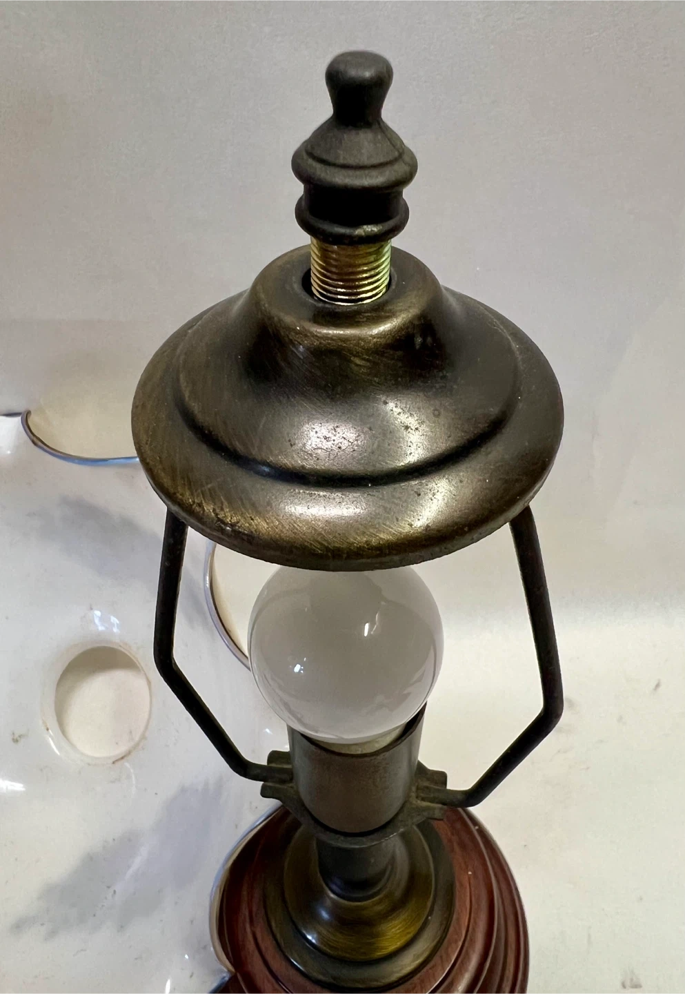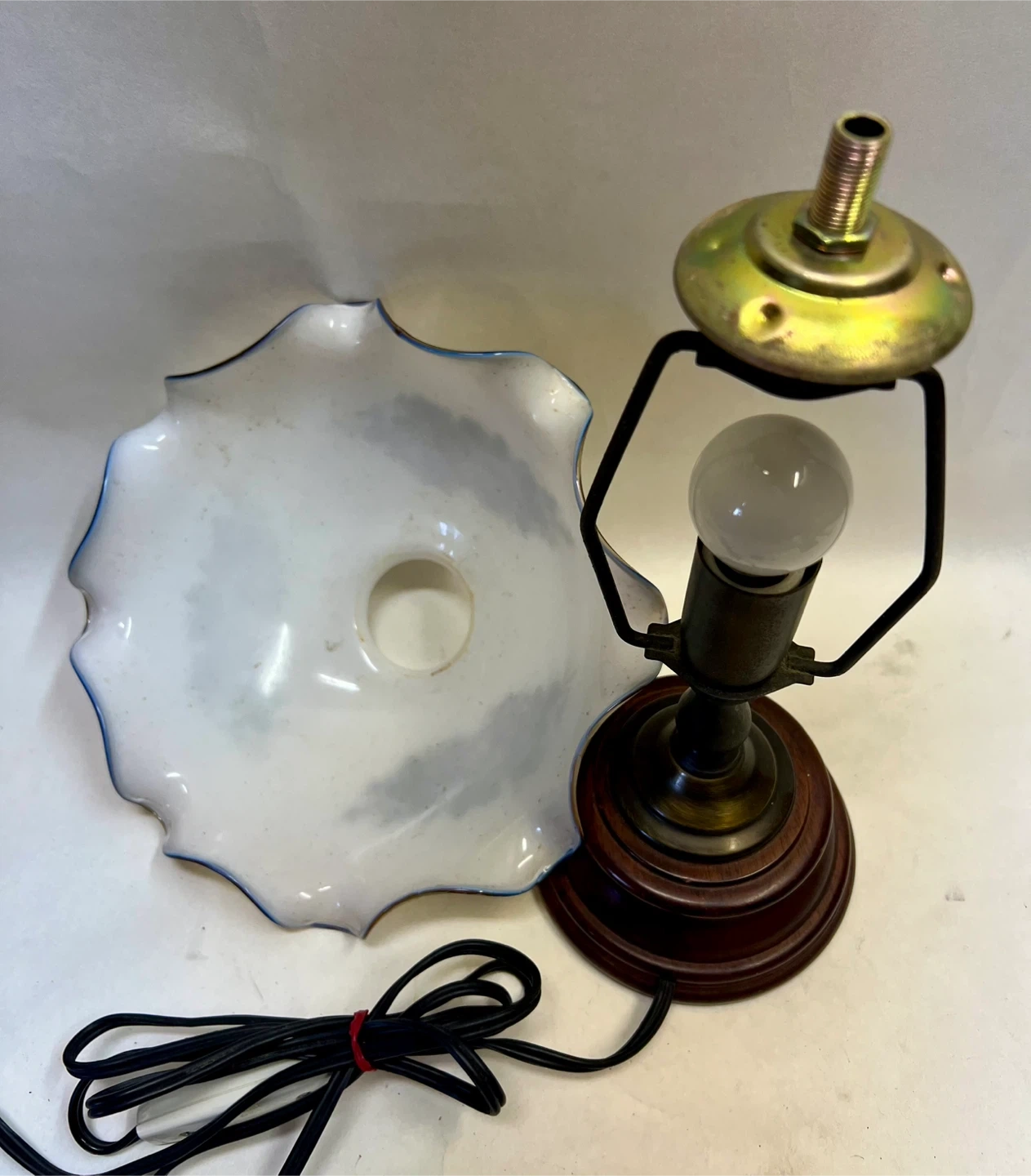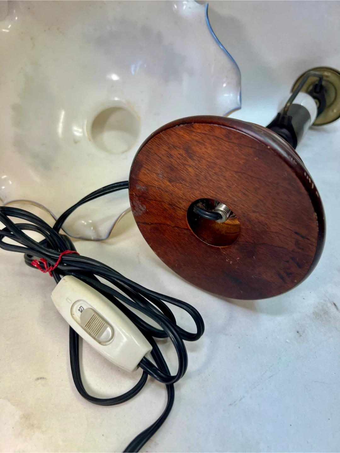 アンティーク フリルガラス 硝子 薔薇図 卓上 テーブルランプ 木製台座です。 多少汚れておりますが、無キズで良い状態です。 高さ約28cm フリル硝子径約22cm 木製台座径約12cm