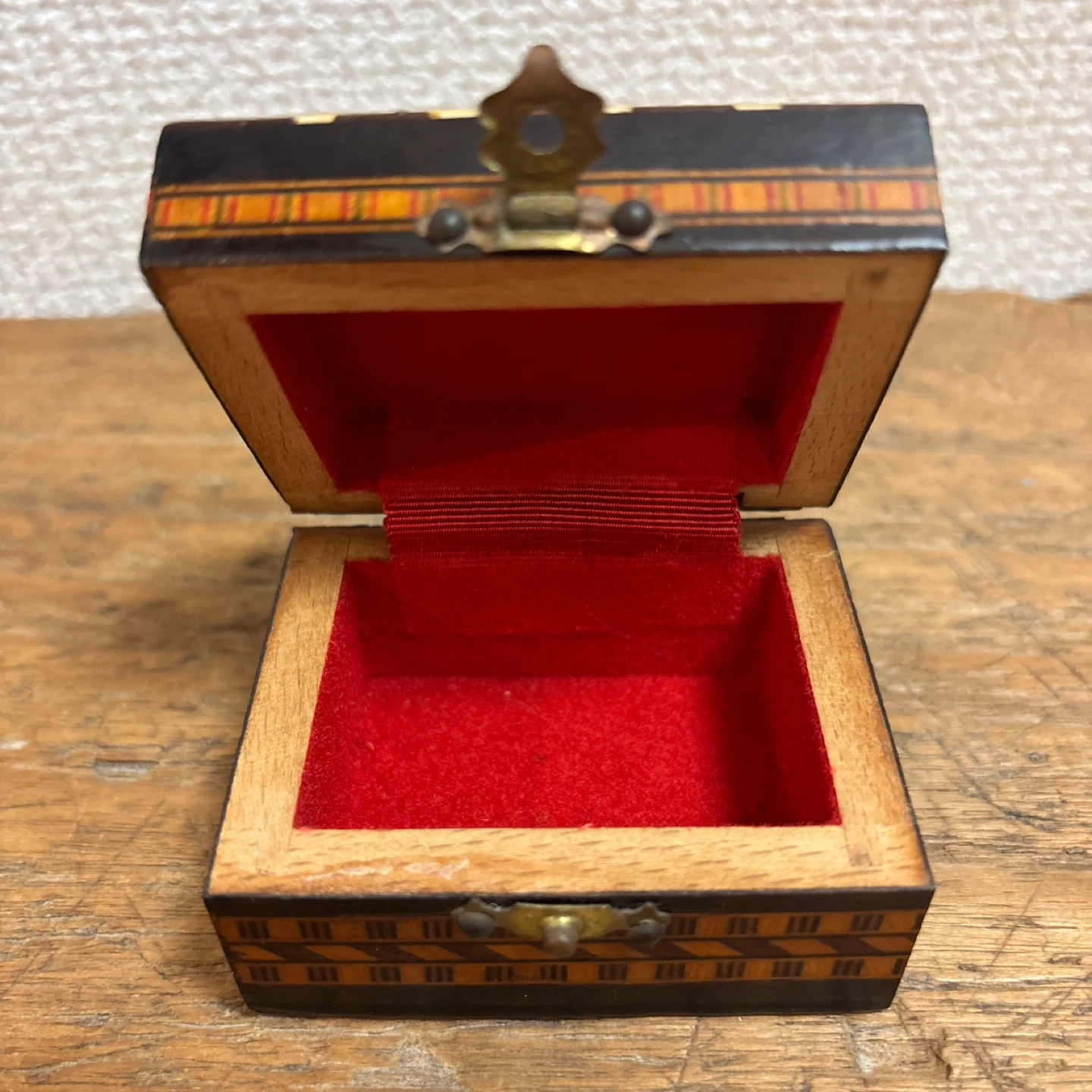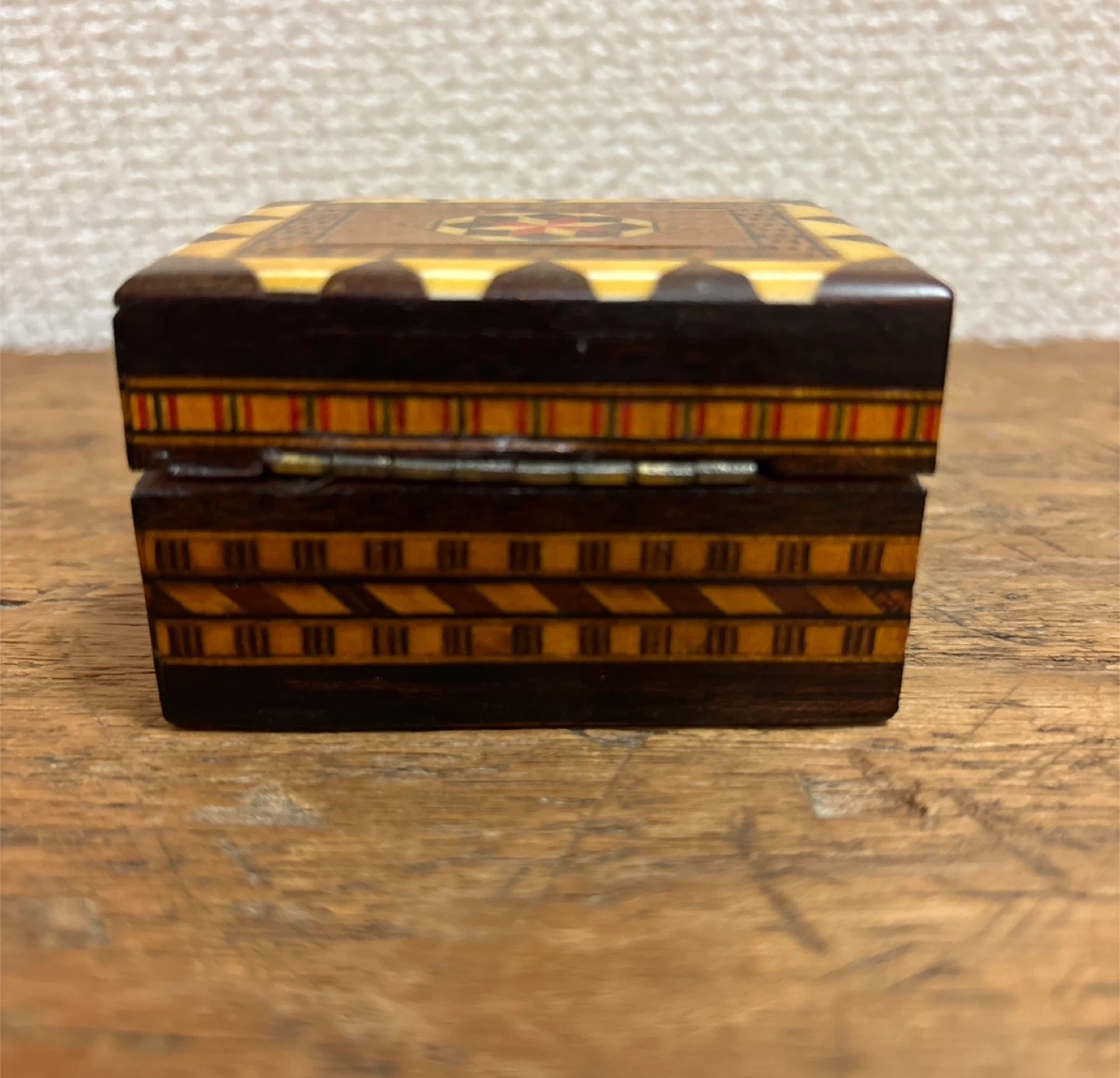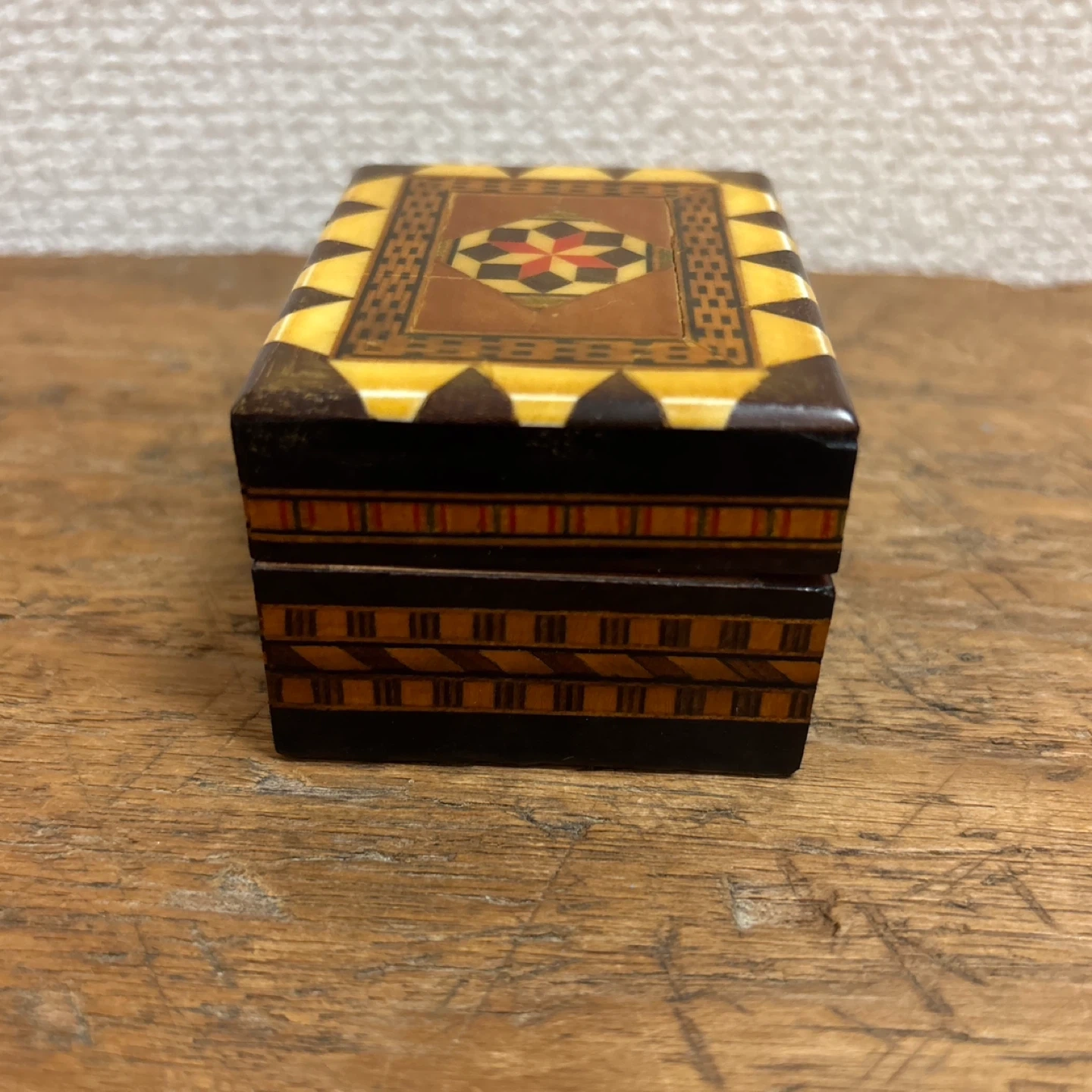 ご覧頂きありがとうございます! 寄木細工のアクセサリーボックスです。 かなり昔に家族が海外で購入したものです。 長期自宅保管のため、蓋に亀裂が見られます(写真3枚目)。 ご了承頂ける方でお願い致します。 古いもの、アンティークがお好きな方向きだと思います。 サイズ 縦 約5.3㎝ 幅 約6.6㎝ 高さ 約4㎝ キャンセル、返品、商品お受け取り後のクレームなどは不可でお願い致します。 ご希望の方はお気軽にご連絡ください。