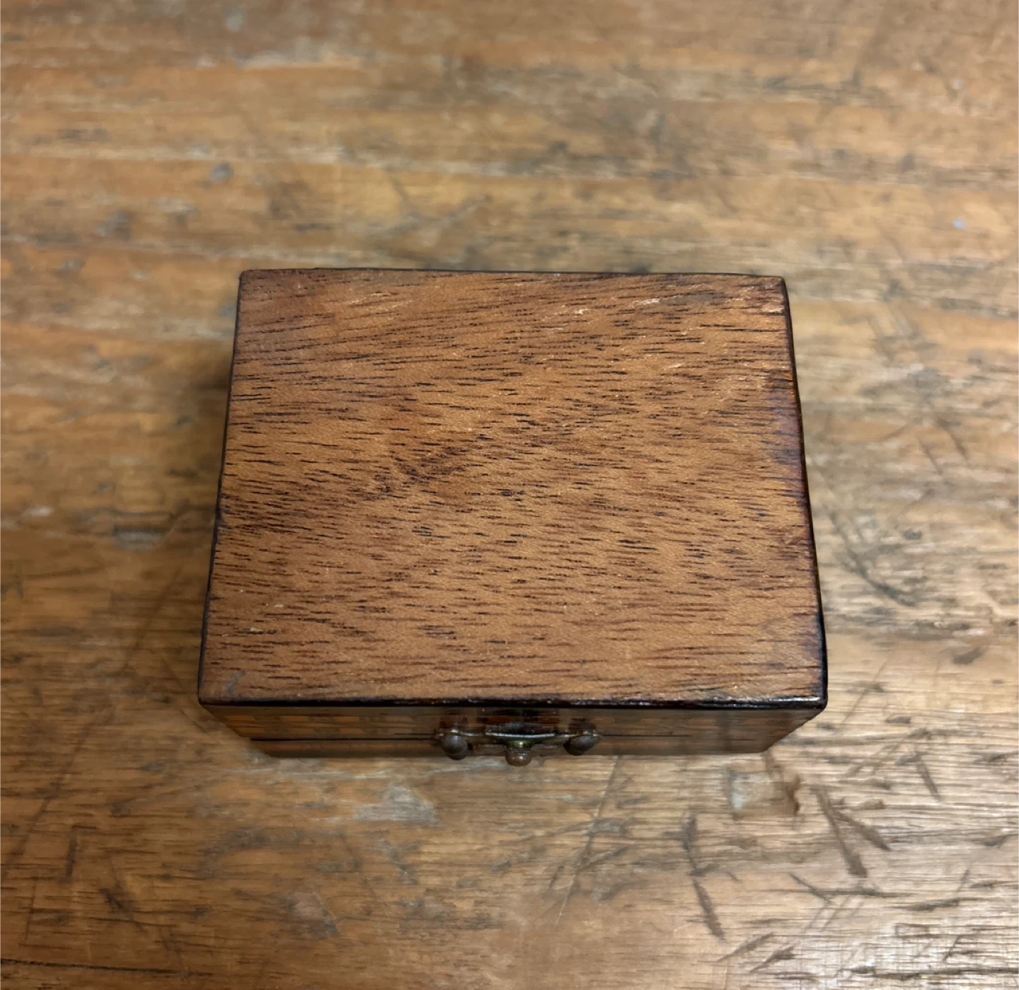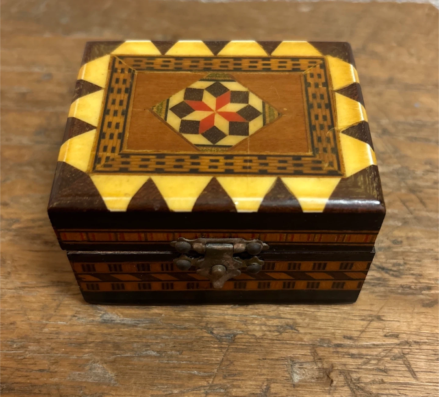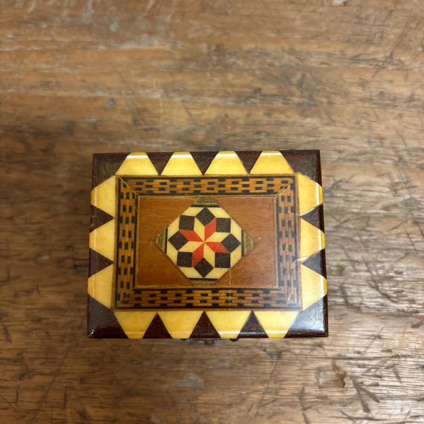 ご覧頂きありがとうございます! 寄木細工のアクセサリーボックスです。 かなり昔に家族が海外で購入したものです。 長期自宅保管のため、蓋に亀裂が見られます(写真3枚目)。 ご了承頂ける方でお願い致します。 古いもの、アンティークがお好きな方向きだと思います。 サイズ 縦 約5.3㎝ 幅 約6.6㎝ 高さ 約4㎝ キャンセル、返品、商品お受け取り後のクレームなどは不可でお願い致します。 ご希望の方はお気軽にご連絡ください。