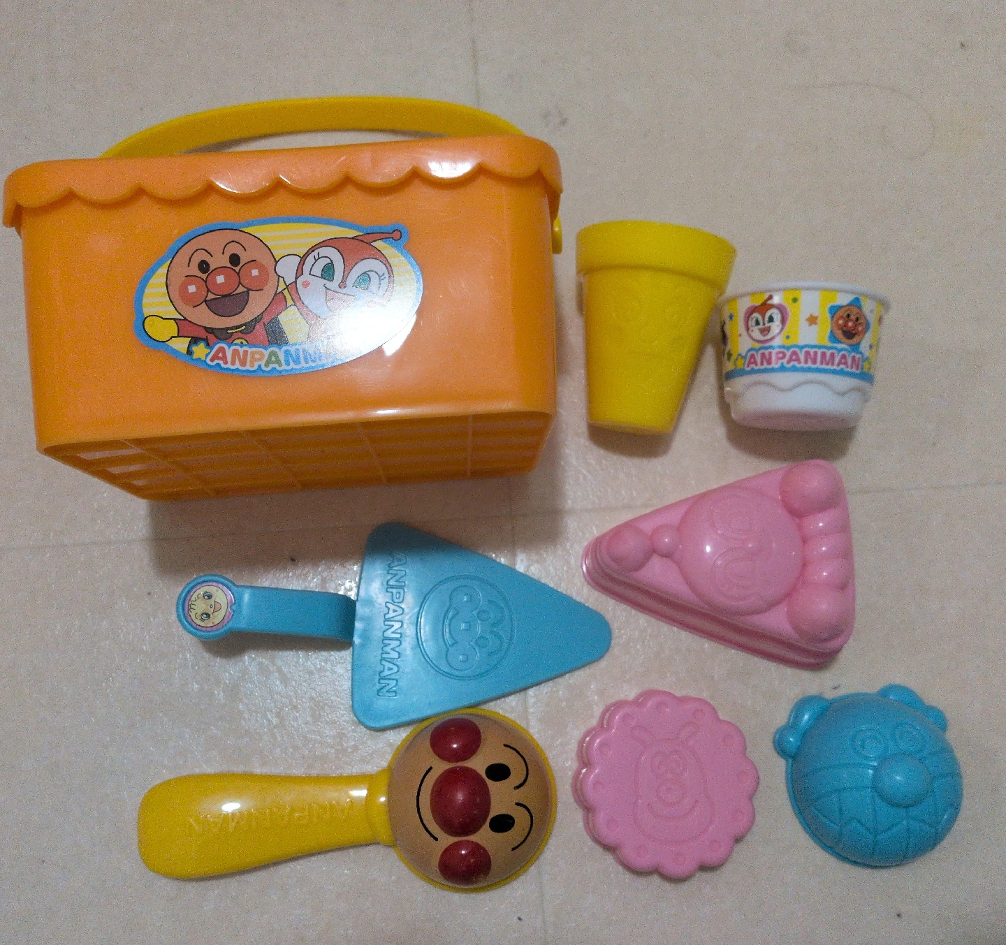 あたたかさアンパンマンのスイーツお砂場セットです ・オレンジ色のバケツ型ケース ・カップ2個(黄色、白/水色) ・スコップ1個(青色) ・その他型抜き4個 ソフトクリームの型とスプーンを無くしています。 洗ってありますが神経質な方はご購入ご遠慮ください。 猫を一匹飼っています猫アレルギー等ある方はご購入お控えください。 中古品であることご了承ください