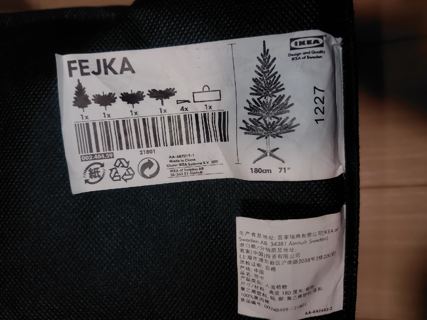 イケアのクリスマスツリーです。 【情報】 ブランド:イケア 商品名:FEJKA サイズ:高さ約180cm (71") 【状態】 10年ほど使用しました。 1年に1回の使用で収納してあるため、多少匂います。使用前に良く干して使用ください。 足が1本壊れたため、瞬間接着剤で修理しています。(写真参照) 【付属品】 取扱説明書、収納バッグ 状態についてご了解いただける方、よろしくお願い致します。