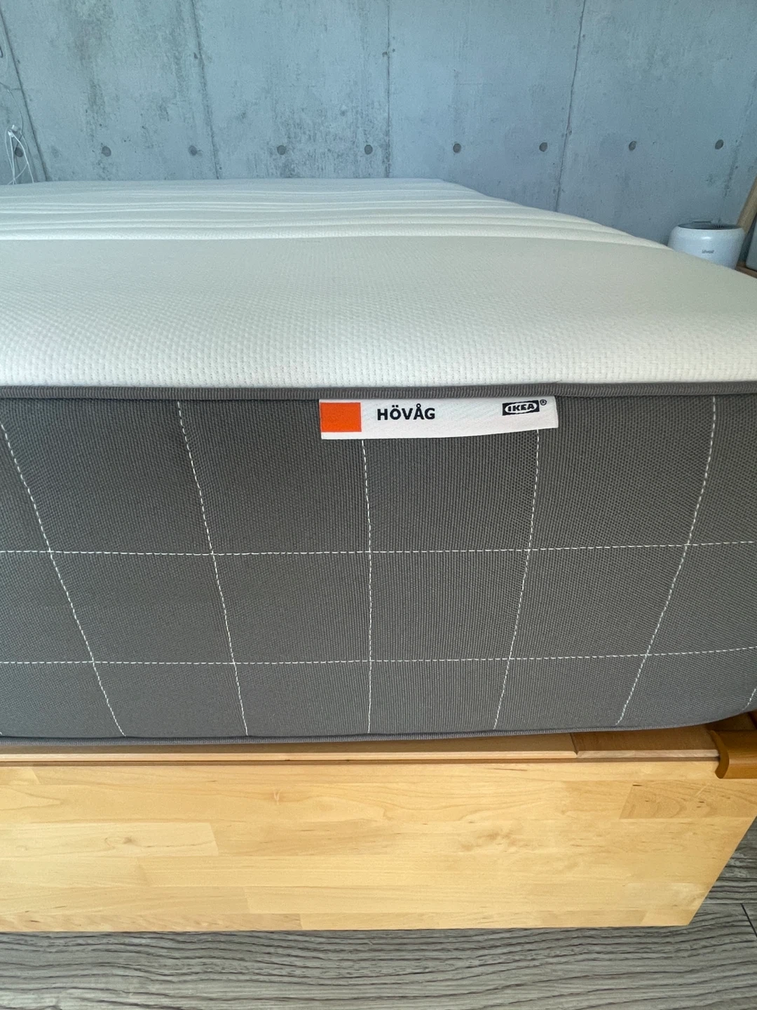 イケアのマットレスです 【情報】 ブランド:イケア 【マットレス】¥29,990 商品名:HÖVÅG 色:グレー サイズ:ダブル 厚さ約20cm HÖVÅG(ホーヴォーグ)は、IKEAで以前販売されていたポケットスプリングマットレス です。現在、IKEAの公式サイトでは取り扱いが終了しており、後継モデルとしてVESTERÖY(ヴェステロイ)**などのマットレスが販売されています。 ブランド:イケア 商品名:HÖVÅG 【状態】 一部にシミあり ご希望の方は、中古になりますが ☑︎無印のベッドカバー(ベージュ) ☑︎ニトリの極冷、極暖カバー(両面使用可) 一緒にお渡し出来ます! 中古品であることご了承ください