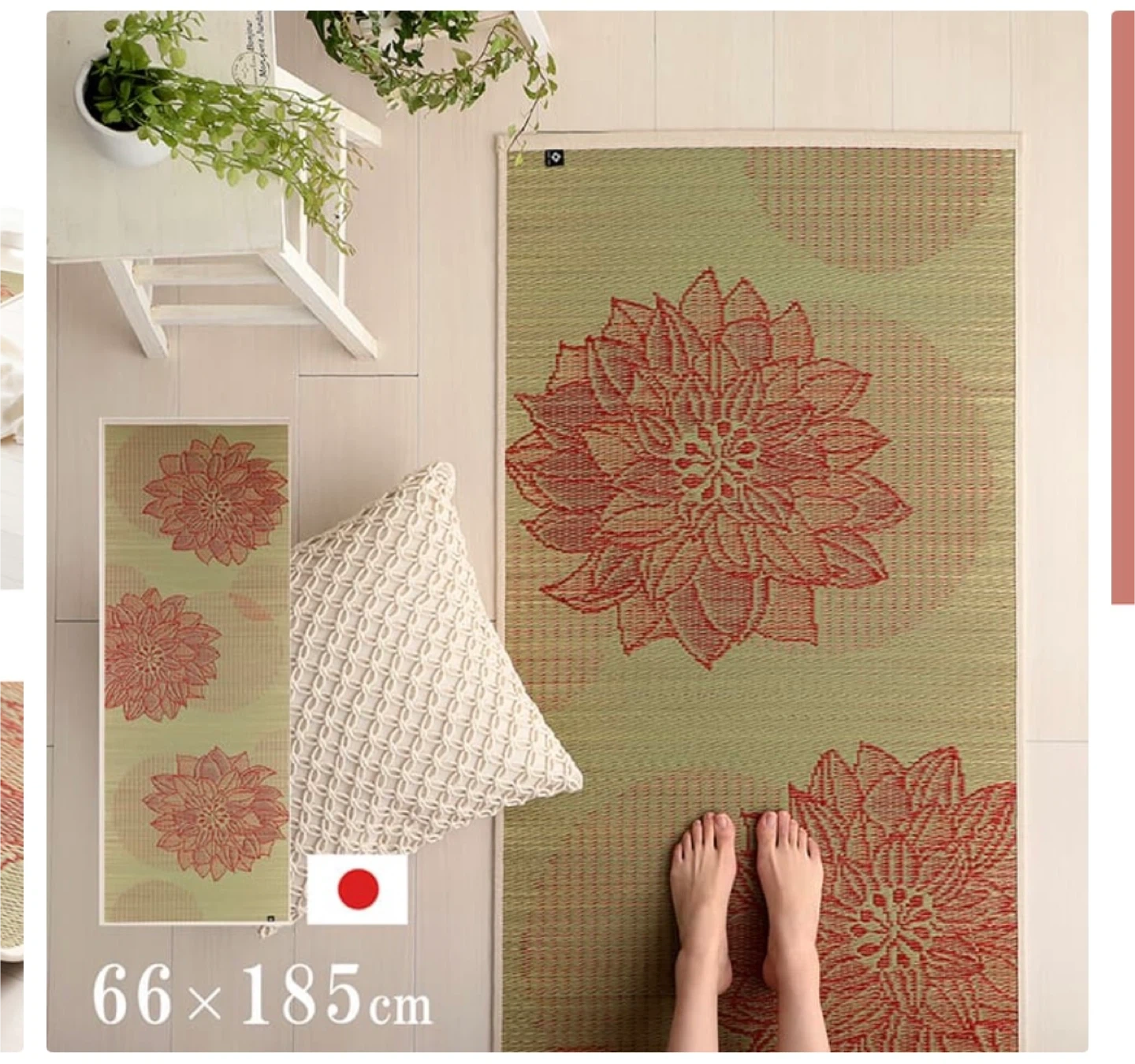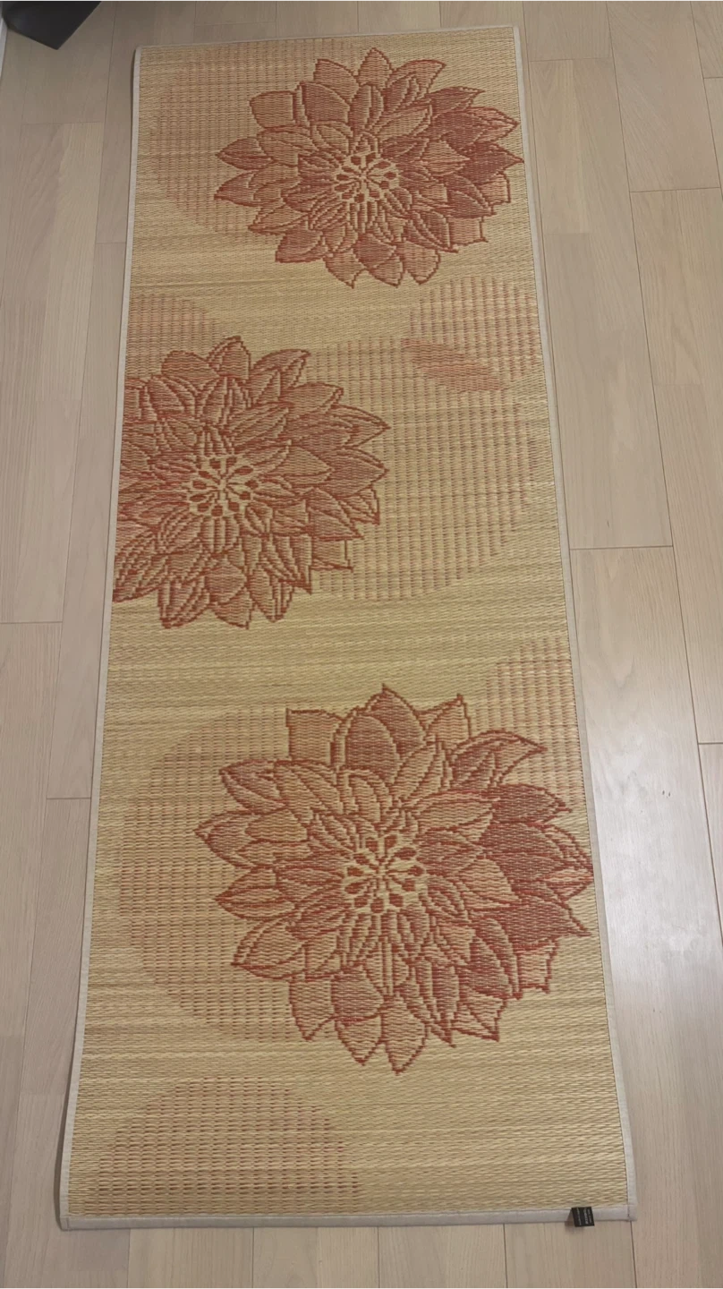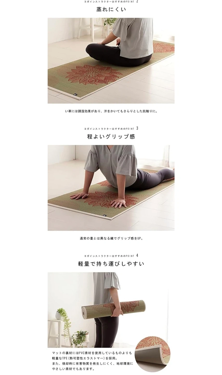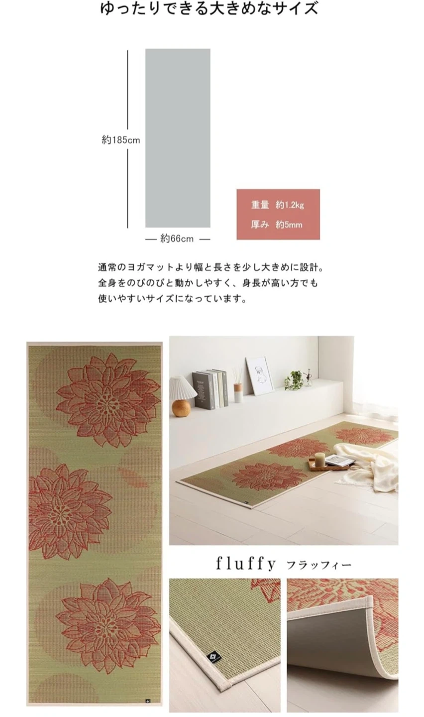 イケヒコ 国産い草使用の畳ヨガマット フラッフィー 蓮の花の柄がとってもかわいいです。 開封しましたが、別のヨガマットがありほとんど使わず自宅保管していたものです。 美品ですが、自宅保管にご理解いただける方、宜しくお願い致します。 種類 フラッフィー サイズ 185長さ x 66幅 x 0.5厚み cm メーカー  イケヒコ・コーポレーション(IKEHIKO) 【素材】表地=い草 裏地=TPE(熱可塑性エラストマー) ヘリ=綿85%・麻15% 【生産国】日本 定価 13200円   ⚫︎商品説明 い草を使った新感覚の日本製ヨガマット 鮮やかな色合いのグラデーションがおしゃれなヨガマットです。 い草の香りでリラックス効果や、森林浴の癒し効果成分でリラックスしてヨガに専念できます。 おしゃれなデザインでヨガマットだけでなく、 ラグ・マットなどお部屋のインテリアにも最適です。 国産い草のみを使用し、国内で生産・加工をしています。 日本のい草は、丈夫で長持ちし、吸湿性とほどよいクッション性があります。 ⚫︎こだわりの織り方 表面のい草の織り方は、ヨガのポーズをとりやすいようにグリップ力が増すような織り方で仕上げました。 ⚫︎裏面はPVCゴムを使用 裏面はヨガマットに使われるPVCゴム(厚み6㎜)を使用し、滑りにくくクッション性を持たせています。ほどよいクッション性もあるため、フローリングの上でもお使いいただけます。 ⚫︎こだわりのデニム生地ヘリ ヘリはデニム生地の製造で日本を代表する広島県カイハラ株式会社のオリジナルデニムを使用しています。カラフルない草とデニムは相性ばっちりです! ⚫︎ 天然の抗菌防臭効果 青森県のヒバの木から抽出した「ヒバエッセンス」をメーカー独自の技術で、材料や商品に吹きつけ加工を施しています。 ヒバエッセンスには、ヒノキチオールという天然成分が含まれており、無加工品より高い抗菌・防臭の効果をもたらしてくれます。 ヨガマット 厚み5mm 日本製 ストレッチマット 畳ヨガ い草 マット 「 フラッフィー」 約66×185cm 幅広 TPE イケヒコ 国産 い草ヨガマット い草マット おしゃれ リラックス 母の日 父の日 宅トレ ヨガマット 日本製 畳ヨガ フラッフィー 約66×185cm 5mm い草 マット 軽量 tpe