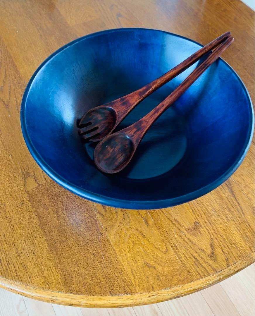 濃紺の木製、大ボウルとサラダサーバーのセットです。 35×10cm 大変珍しい濃紺の大きなウッドボウルです。 数回使用したので小傷はありますが、美しい艶で迫力があり、食卓で映えます。 サラダボウル、果物入れなどに。 - 色: 濃紺 - 素材: 木製、イタリア製 - 付属品: 天然木サラダサーバー (30cm)2本 自宅保管品です。 ご希望の方はお気軽にご連絡ください。