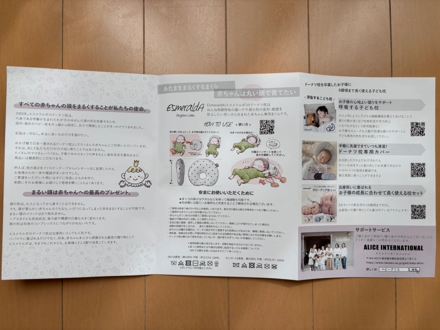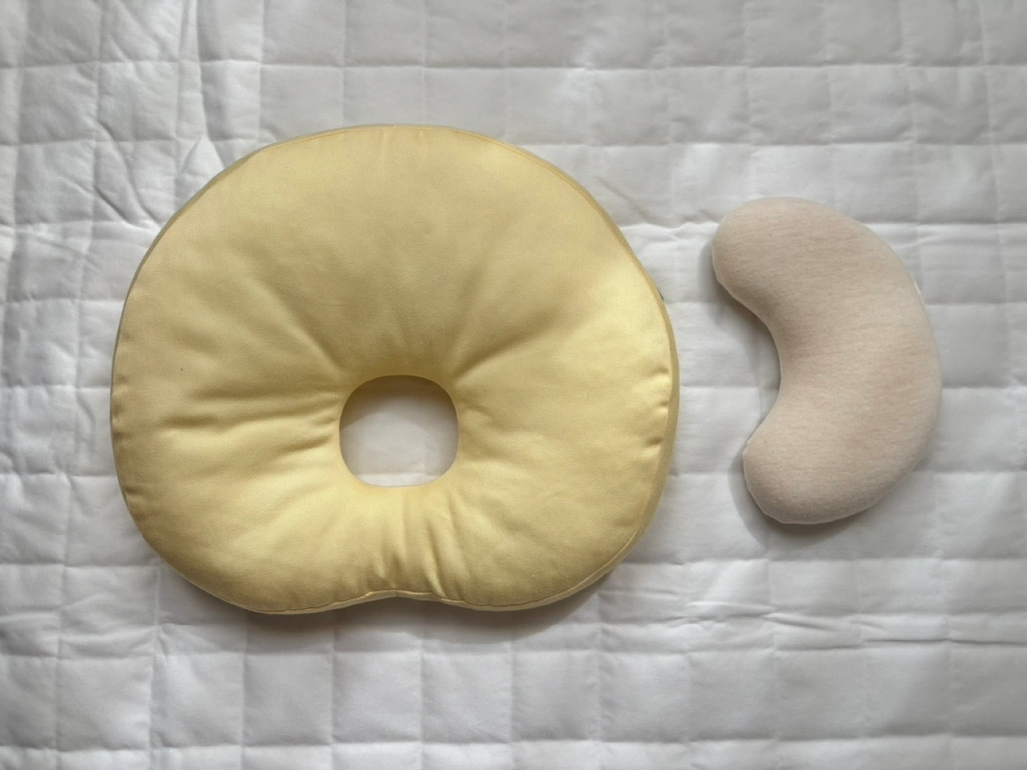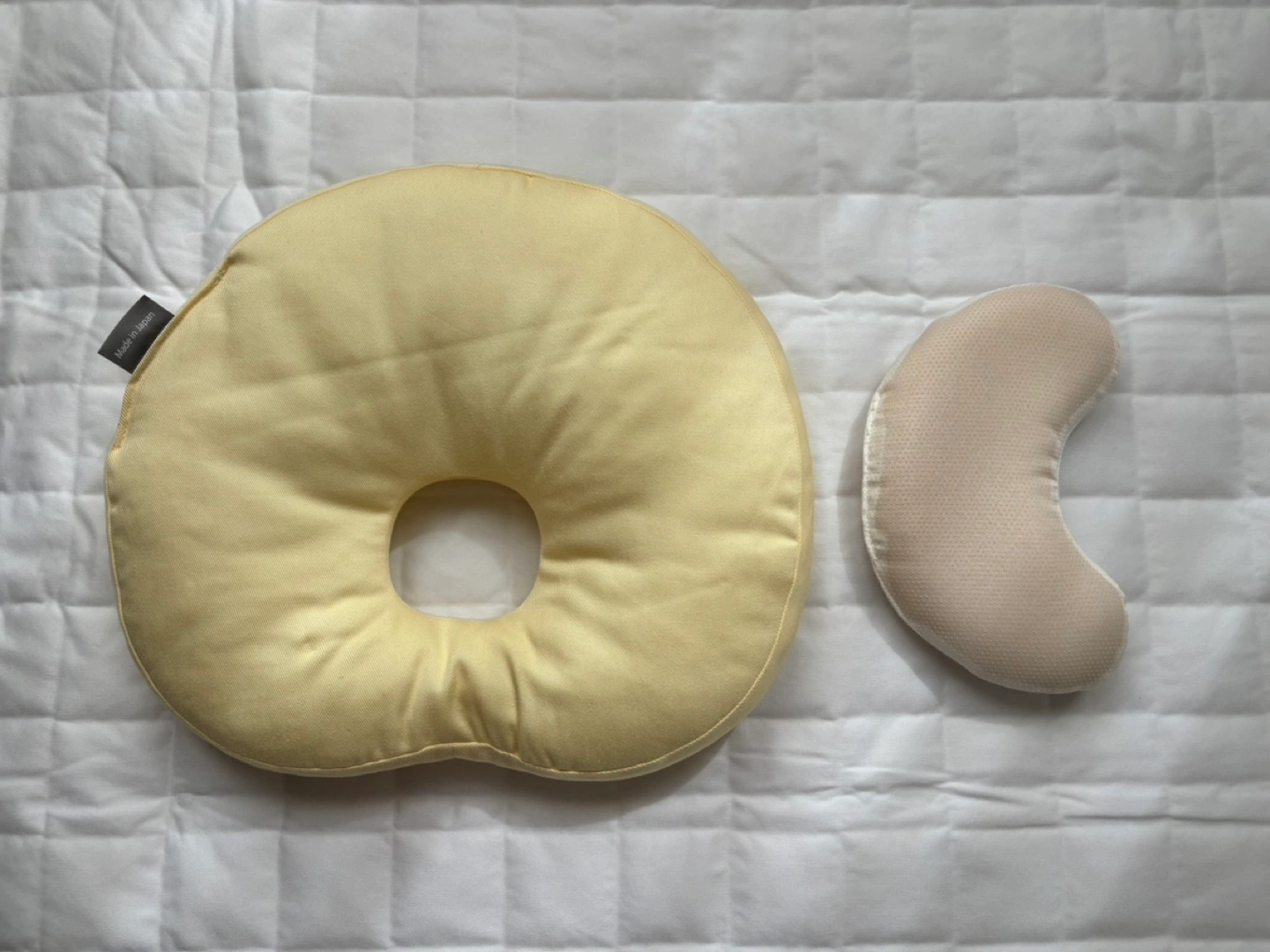 インサート枕(傾きを調整する小さい枕)付きドーナツ枕です。(カバー無し) 子供が5ヶ月頃に寝ているときの向き癖が気になって購入しました。 ガーゼタオルをぐるぐるに巻いて使用していましたが、一週間ほど使用する中で、うちの子にはあまり合わずお蔵入りとなっていました。 公式HP(参考):https://www.esme-ralda.com/?pid=155653692 ※出品物は、添付写真のものとなります。