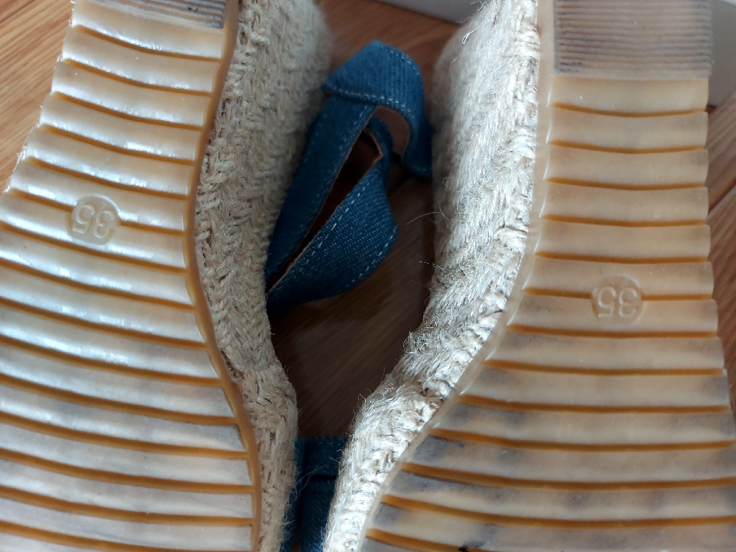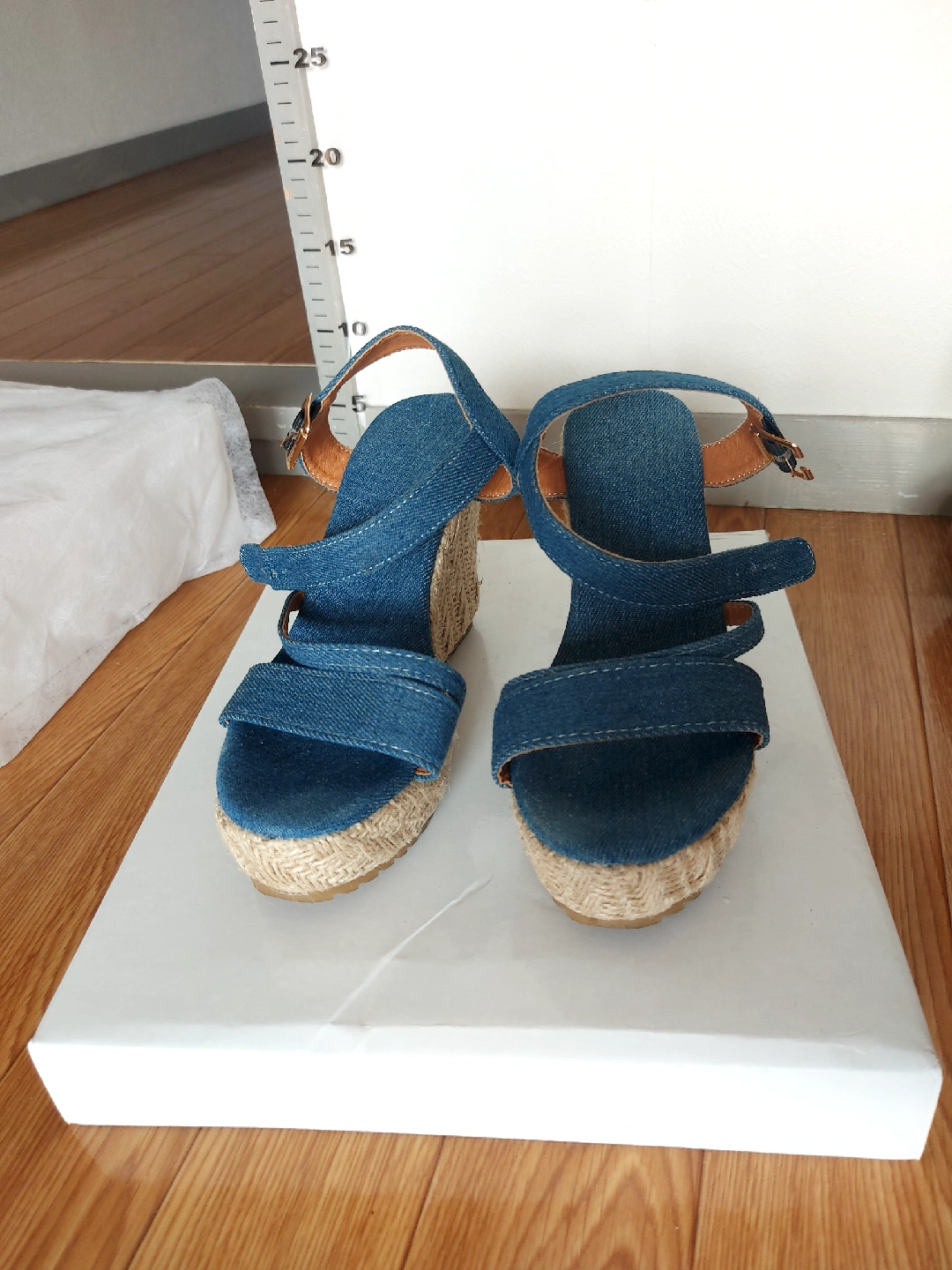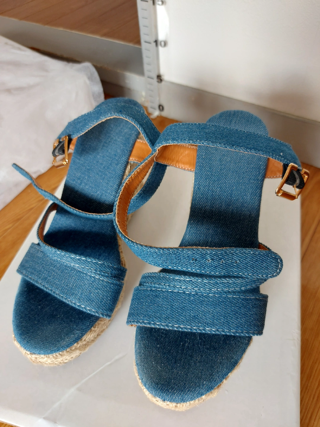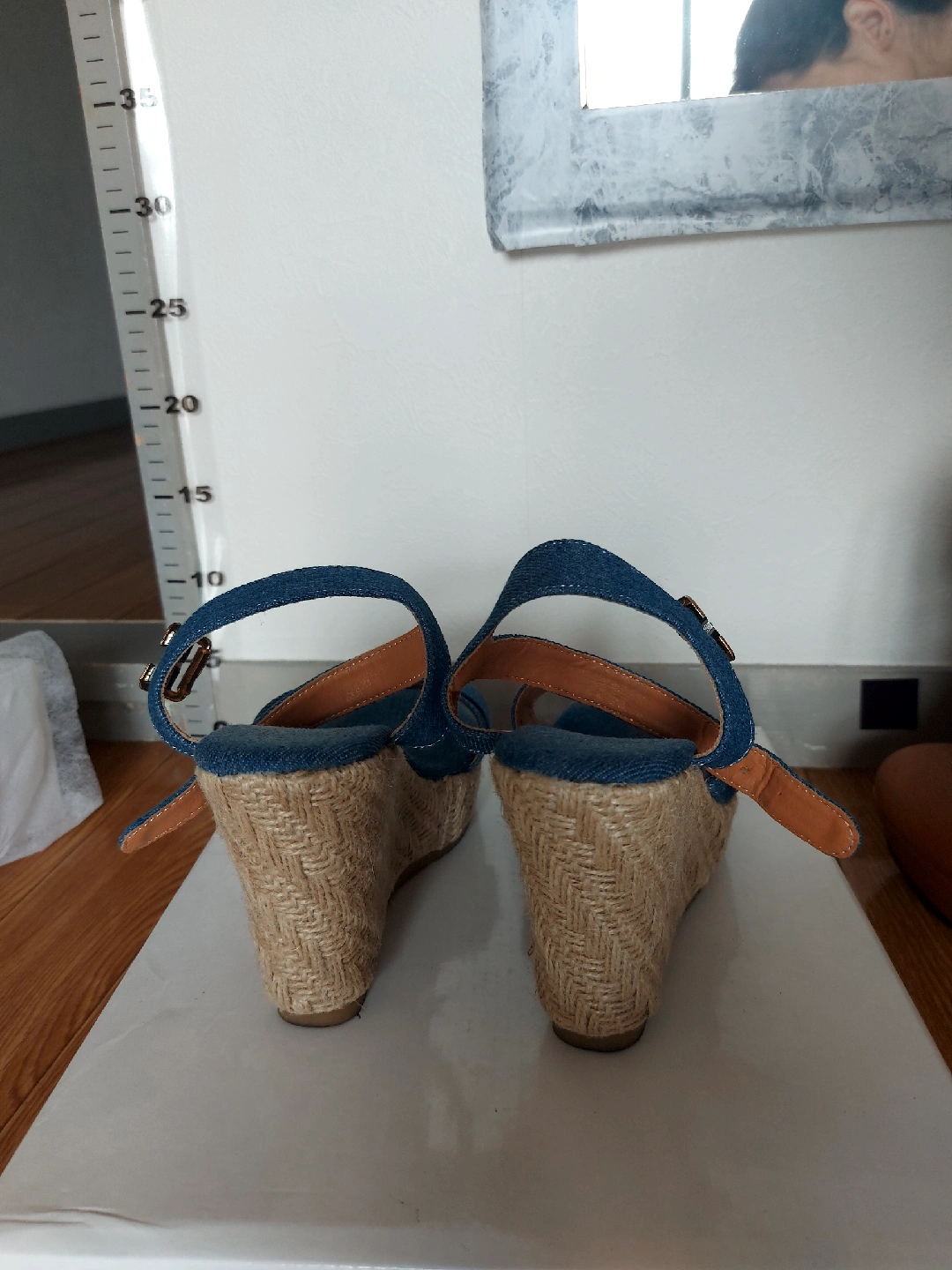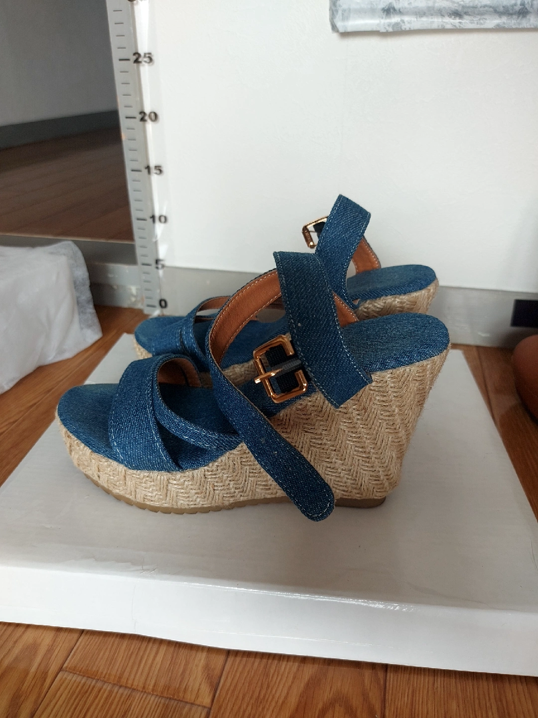デニム風ウェッジソールサンダルです ・色:青系デニム風 ・サイズ:35 (22,5センチ) ・ウェッジソールの高さ:約9cm ・状態:使用感少なめ 中古品であることご了承ください