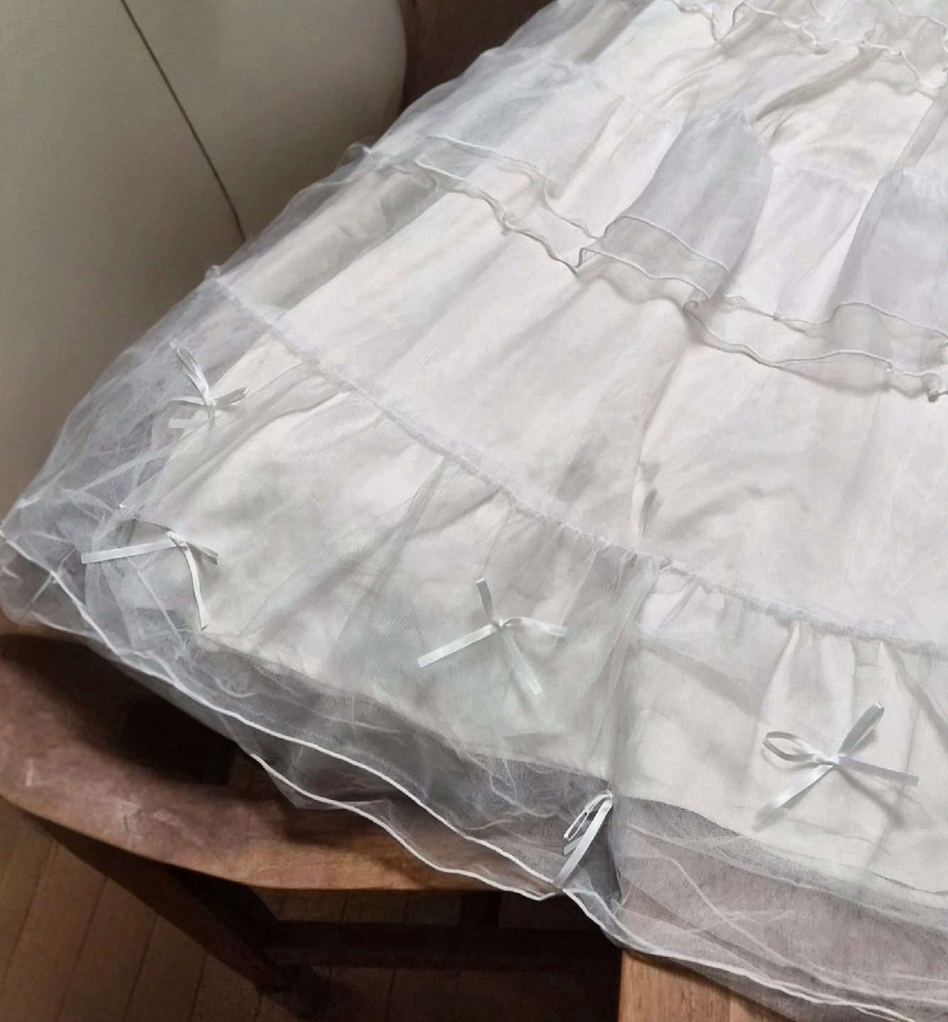 ウェディングベールとスカートです。 どちらも娘がライブで1回使用したものです。 ベールの金具部分は元々若干並びが揃っていません。 髪に差すのに問題無いそうです。 本物のウエディングベールではないので、コスプレ用に気軽に使っていただけると思います。 スカートサイズはフリーサイズ ウエストはゴムになっています。 丈は中の白い部分が約80cm レースまでで約88cm 身長152cmの私で、くるぶしの上辺りまでになります。 素人測りになりますので宜しくお願いします。 スカートは全体的に可愛く見えますが、あまり広がらないデザインですので、普段着にもじゅうぶん着用できると思います。 今の季節 #ハロウィン🎃のコスプレにオススメです。 色の変色も見られず綺麗な状態ですが、あくまでも一度着用したものですので神経質な方は御遠慮ください。 受け渡し場所は武蔵小杉駅周辺も可能です!