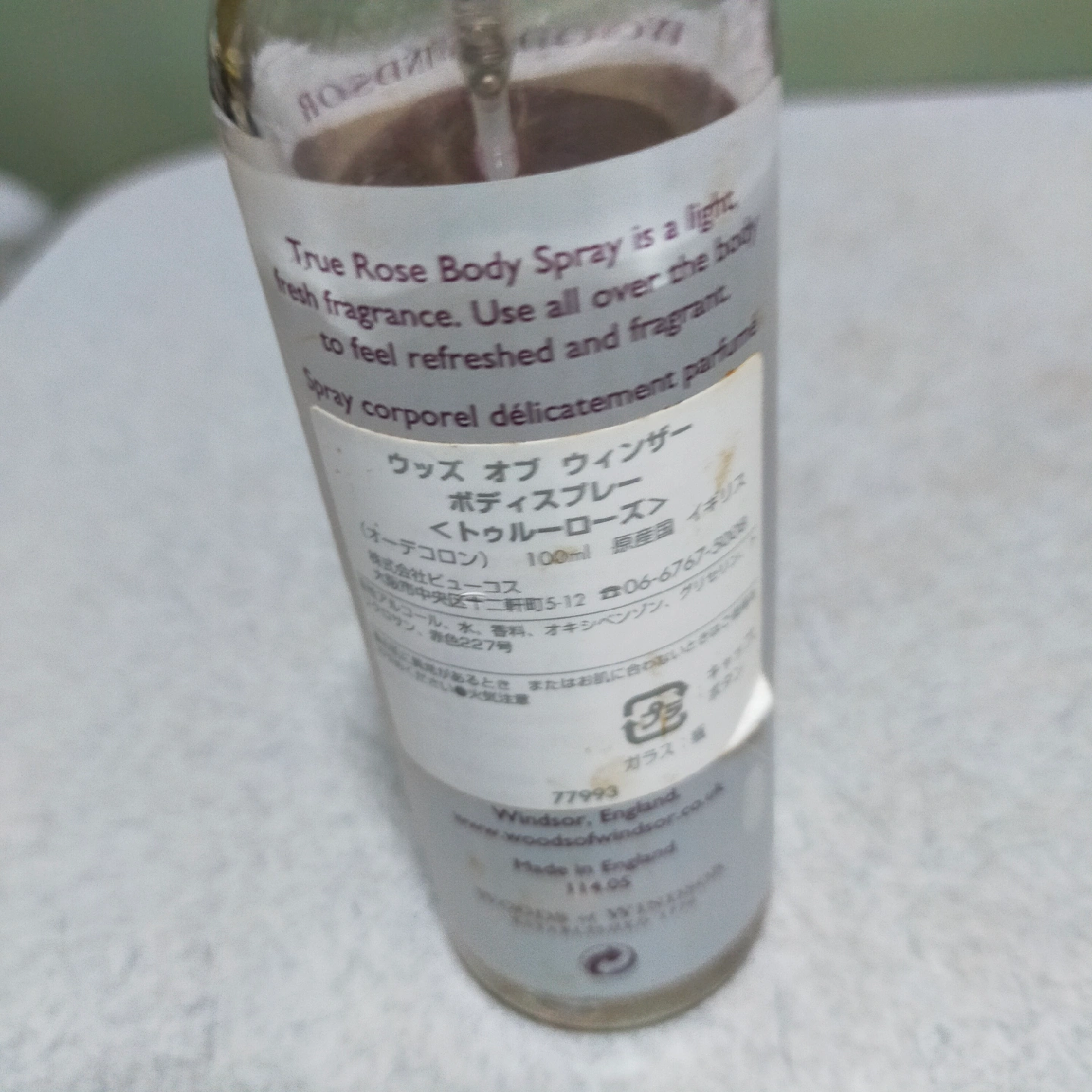 ウッズオブウィンザーのボディスプレーです ・ブランド:ウッズオブウィンザー ・商品名:True Rose ・容量:100mlボトルの下から   7.5センチ 蓋はありません。