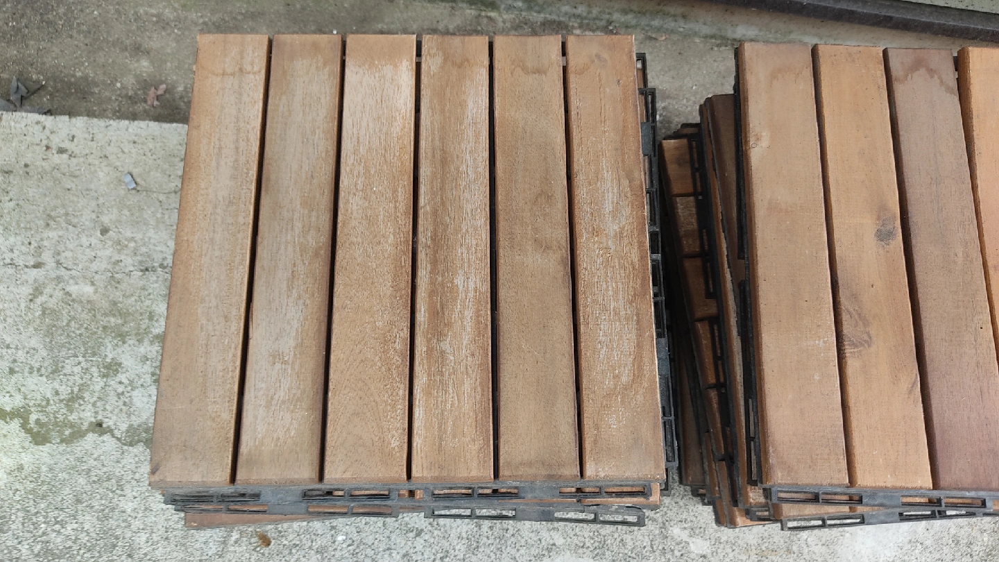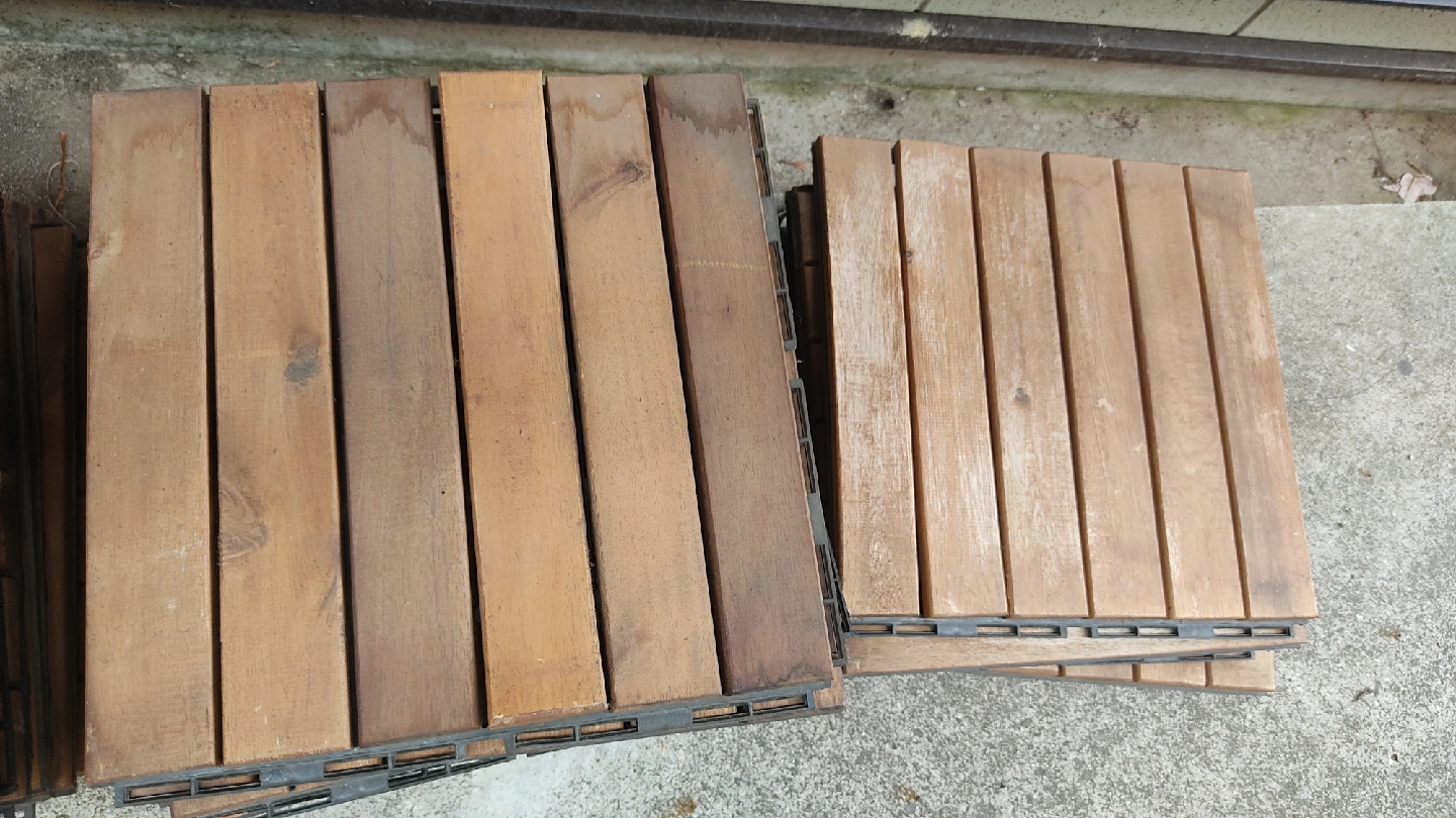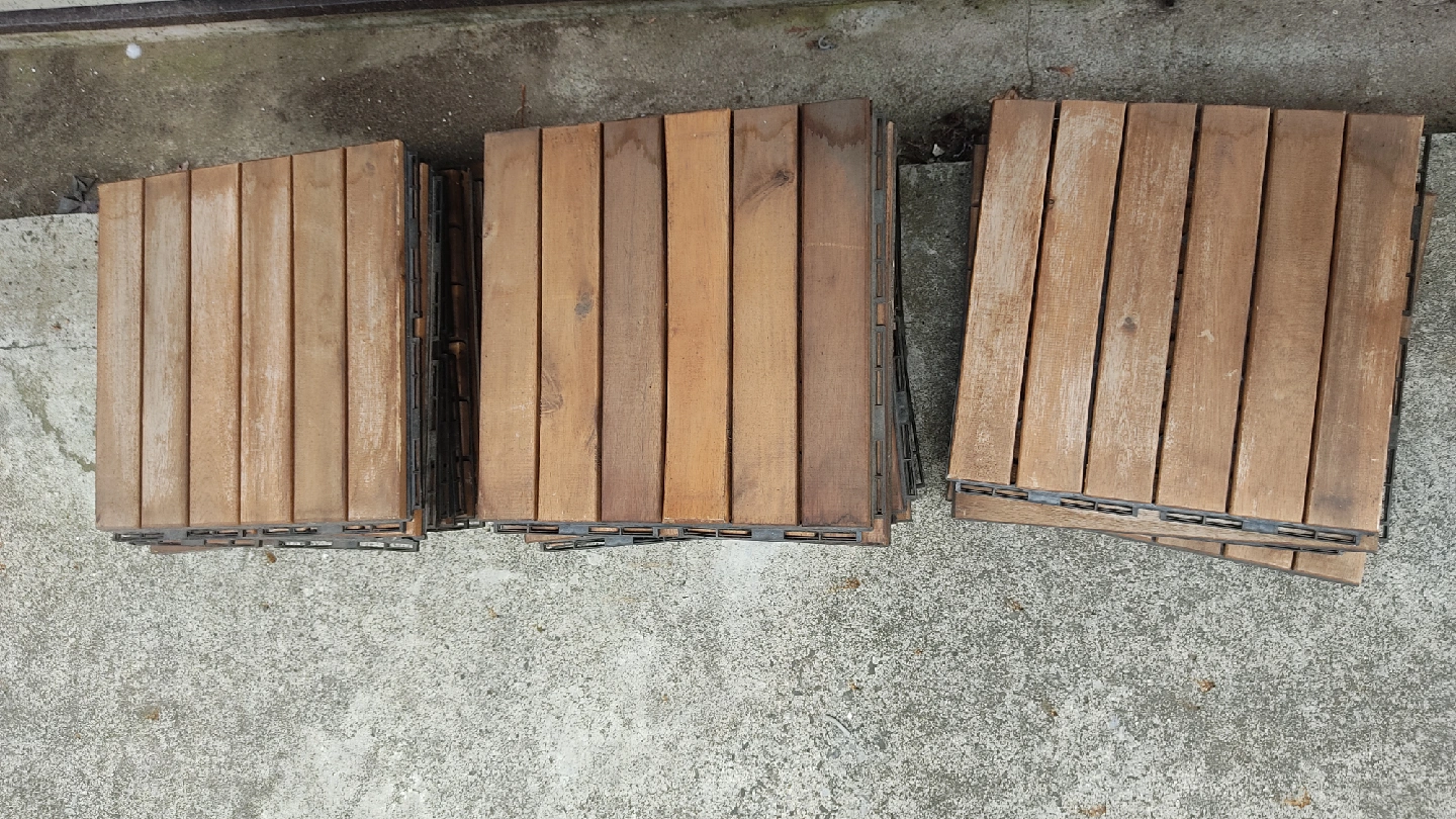 ウッドデッキタイルです。 庭やバルコニーに最適なウッドパネル、30cm角のタイル状で簡単に設置可能。 - サイズ: 30 cm x 30 cm x 2 cm - 用途: 庭やバルコニーの装飾用 - 24枚セット 中古品であることご了承ください。