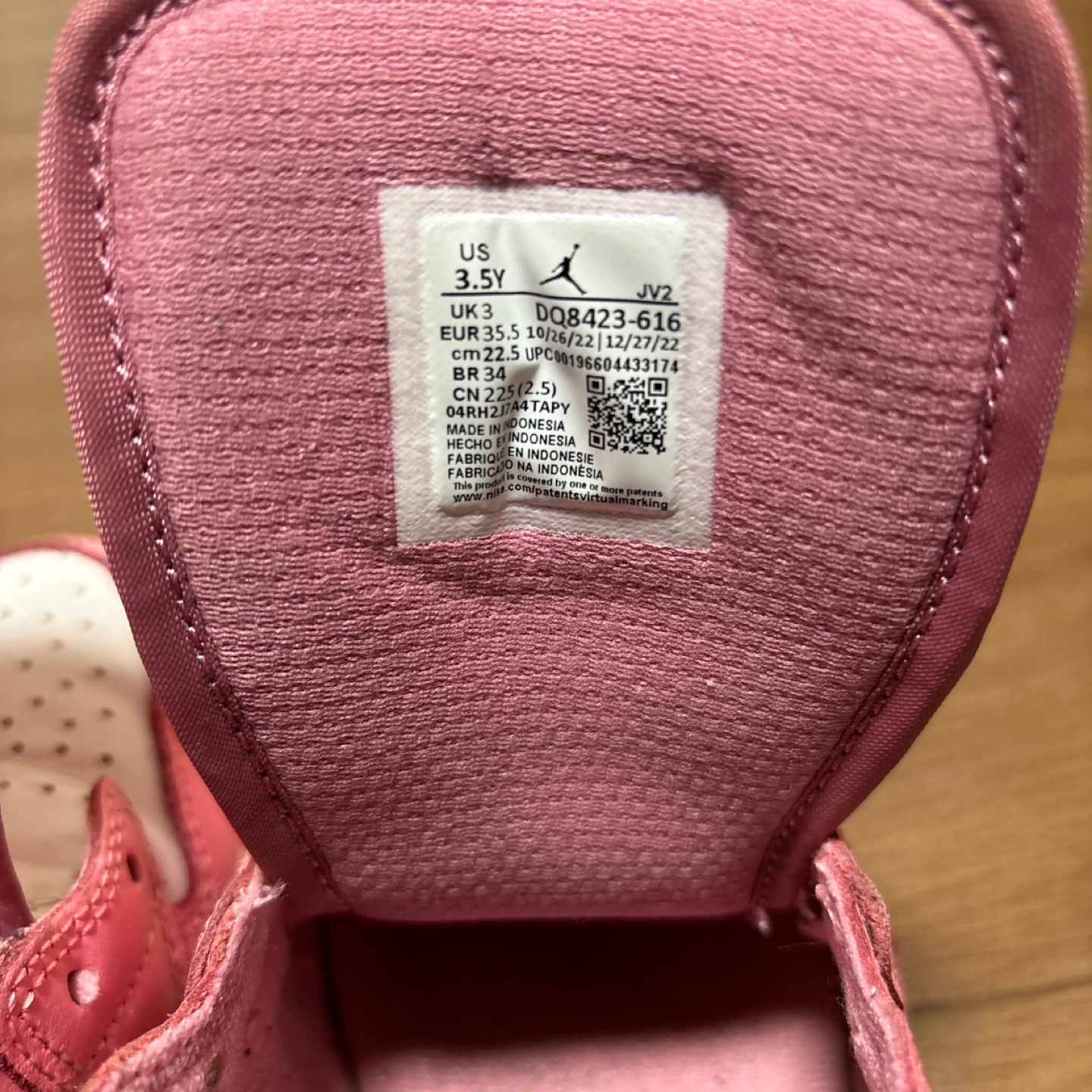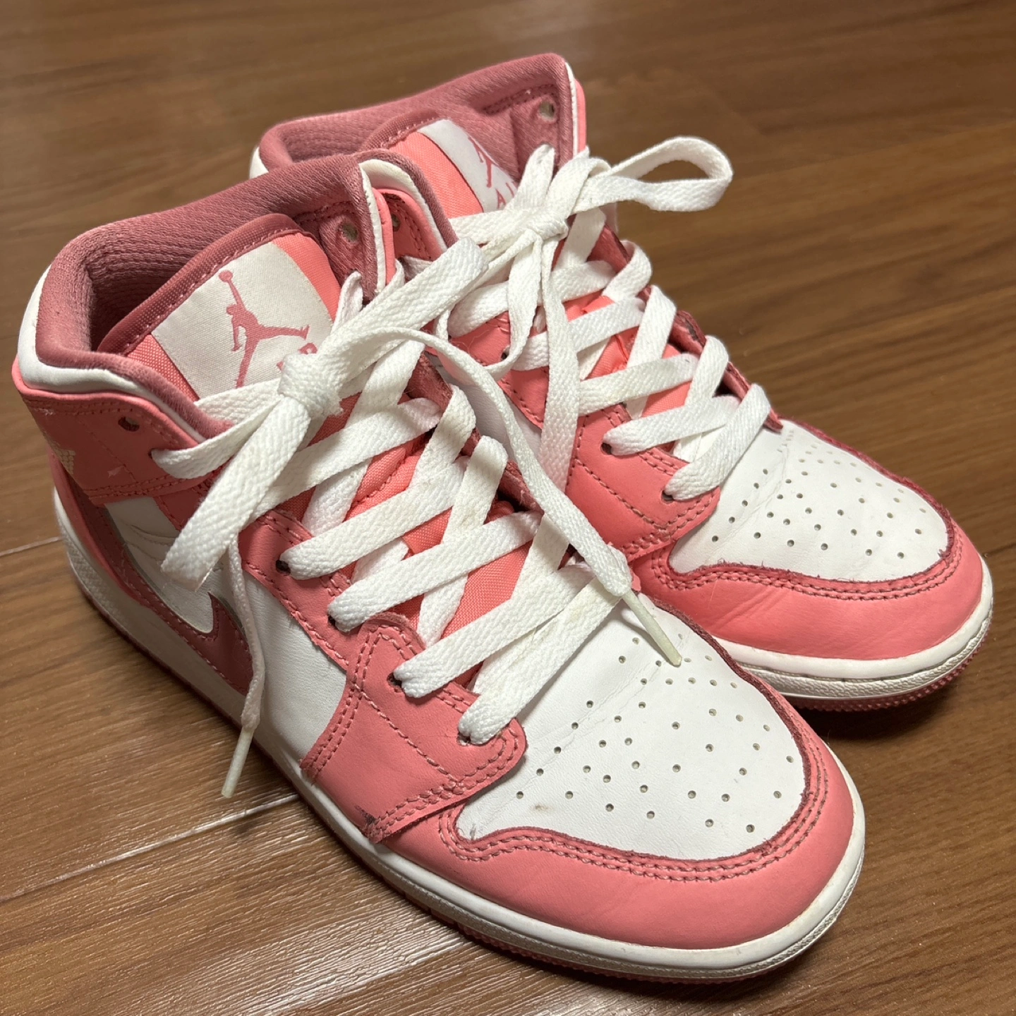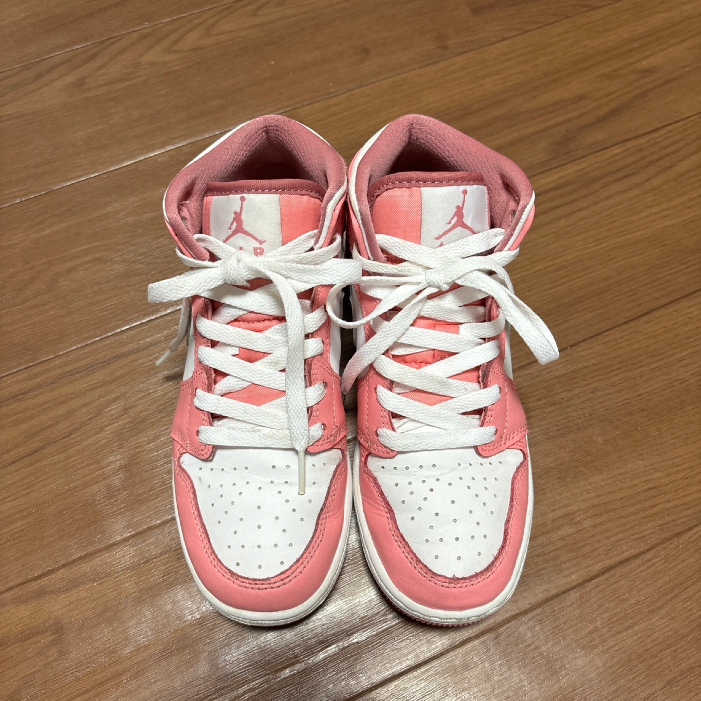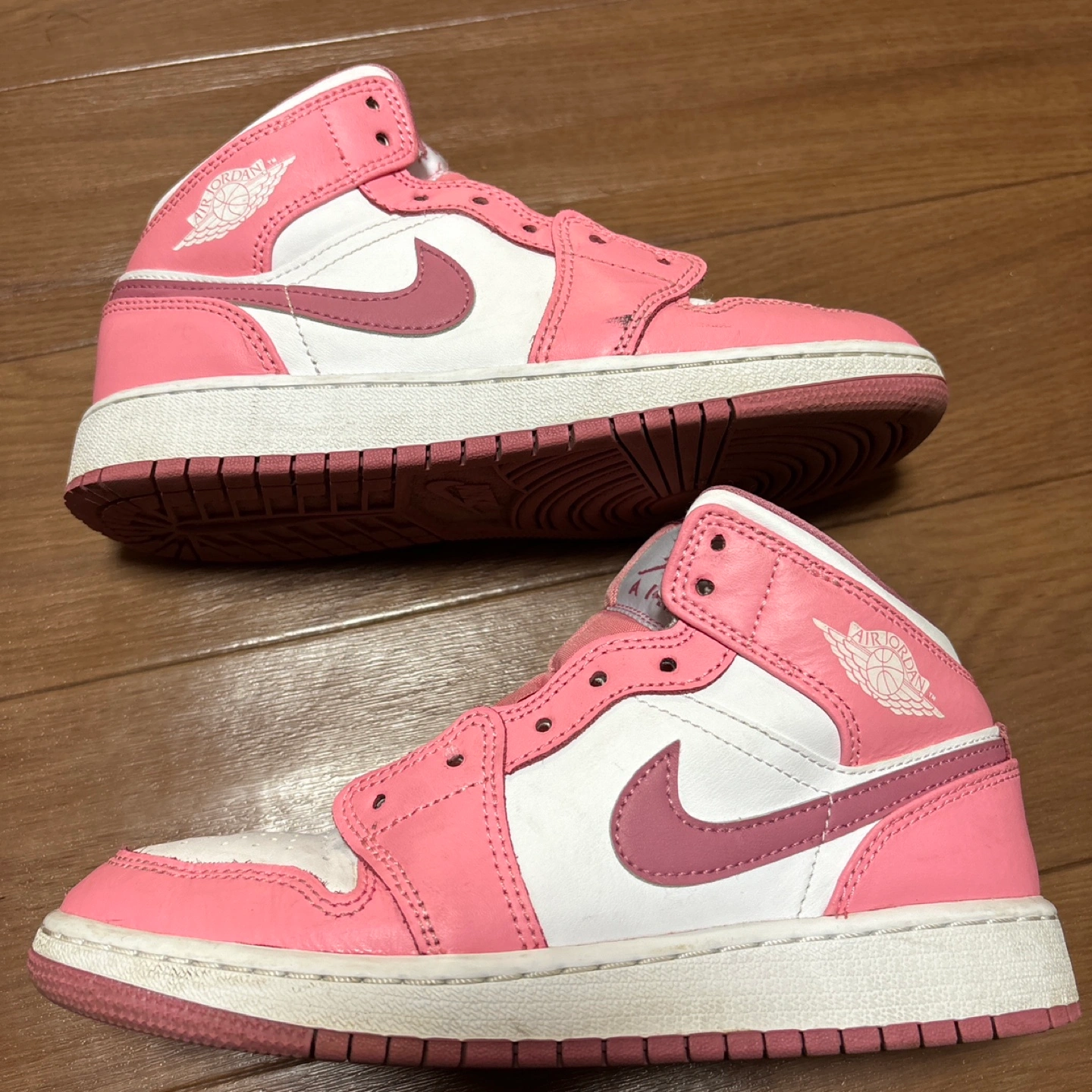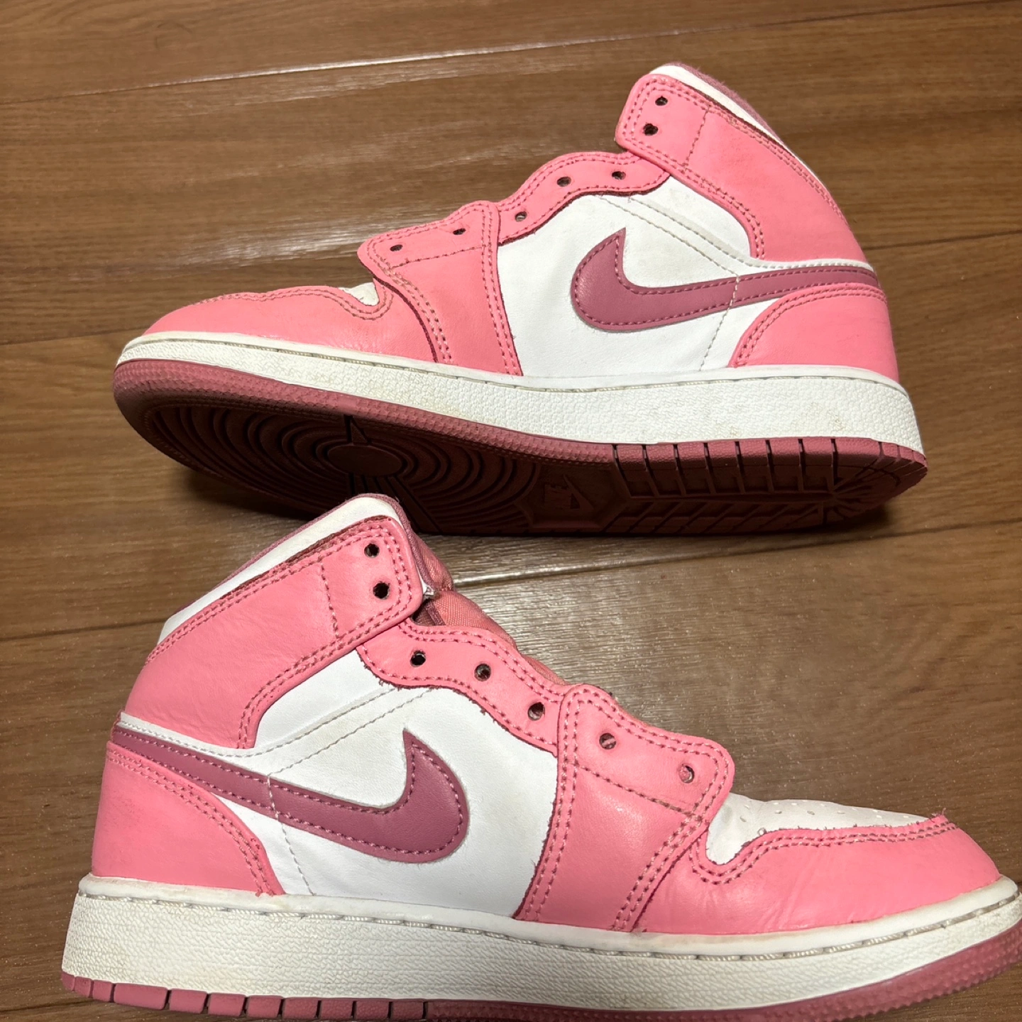 昨年春に香港のハーバーシティにあるNIKE直営店で自身が購入し、娘に履かせていました。 正真正銘の本物になります。 サイズはGSの3.5(22.5cm相当)です。 日本ではプレミア価格なのか、普通に買えない製品でしたので、大切に手入れをしながら履かせていました。 着用頻度もそこまでは高くない為、まだまだ履いていただけると考えています。 個人的には結構状態は良いと思います。 親御さんがエアジョーダン1をよく履かれる方等は、親子でペアでお出かけ等、如何でしょうか。 できれば、自身のお子様へ履いて頂き、大切にして頂ける方へお譲りしたいと考えています。 写真にあるものが全てになります。 転売目的ではなかったので、箱などは御座いません。 - ブランド: Nike - モデル: Air Jordan 1 MID GS DQ8423-616 - サイズ: US 3.5 (UK 3, EUR 35.5) - 色: ピンク/ホワイト - 素材: レザー