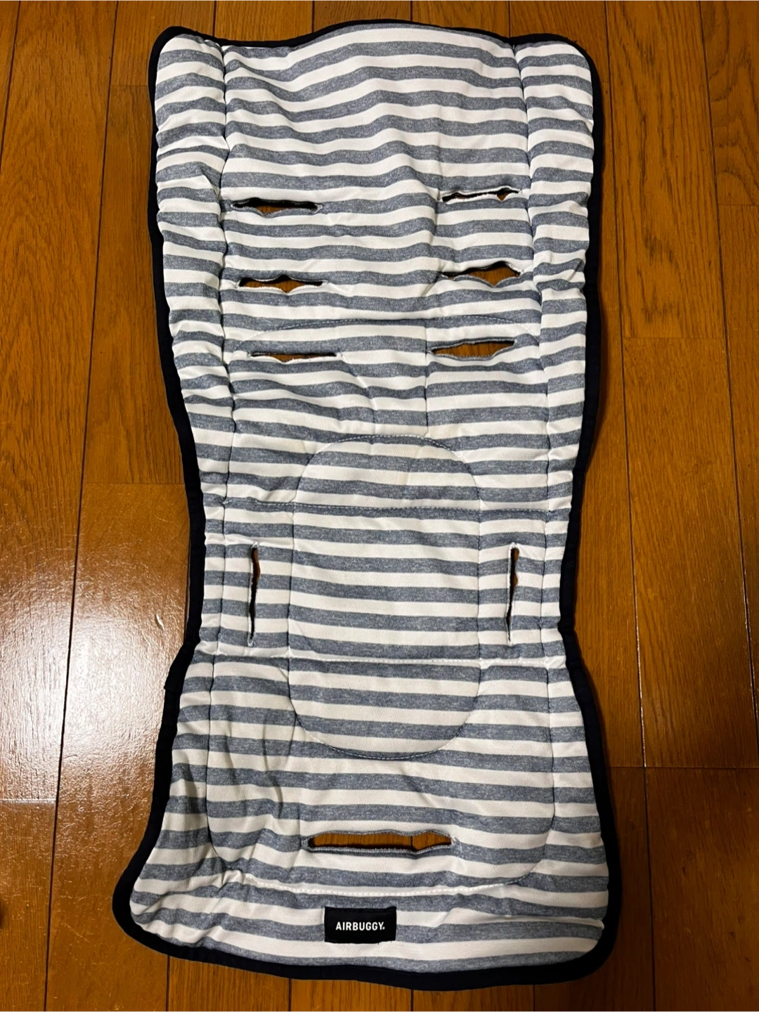 エアバギーのベビーカーマットです。 夏用の薄手のものになります。 色はブルー系のストライプです。 収納袋もあります。 ホームクリーニング済みですが、ご使用前には一度お洗濯をおすすめします。