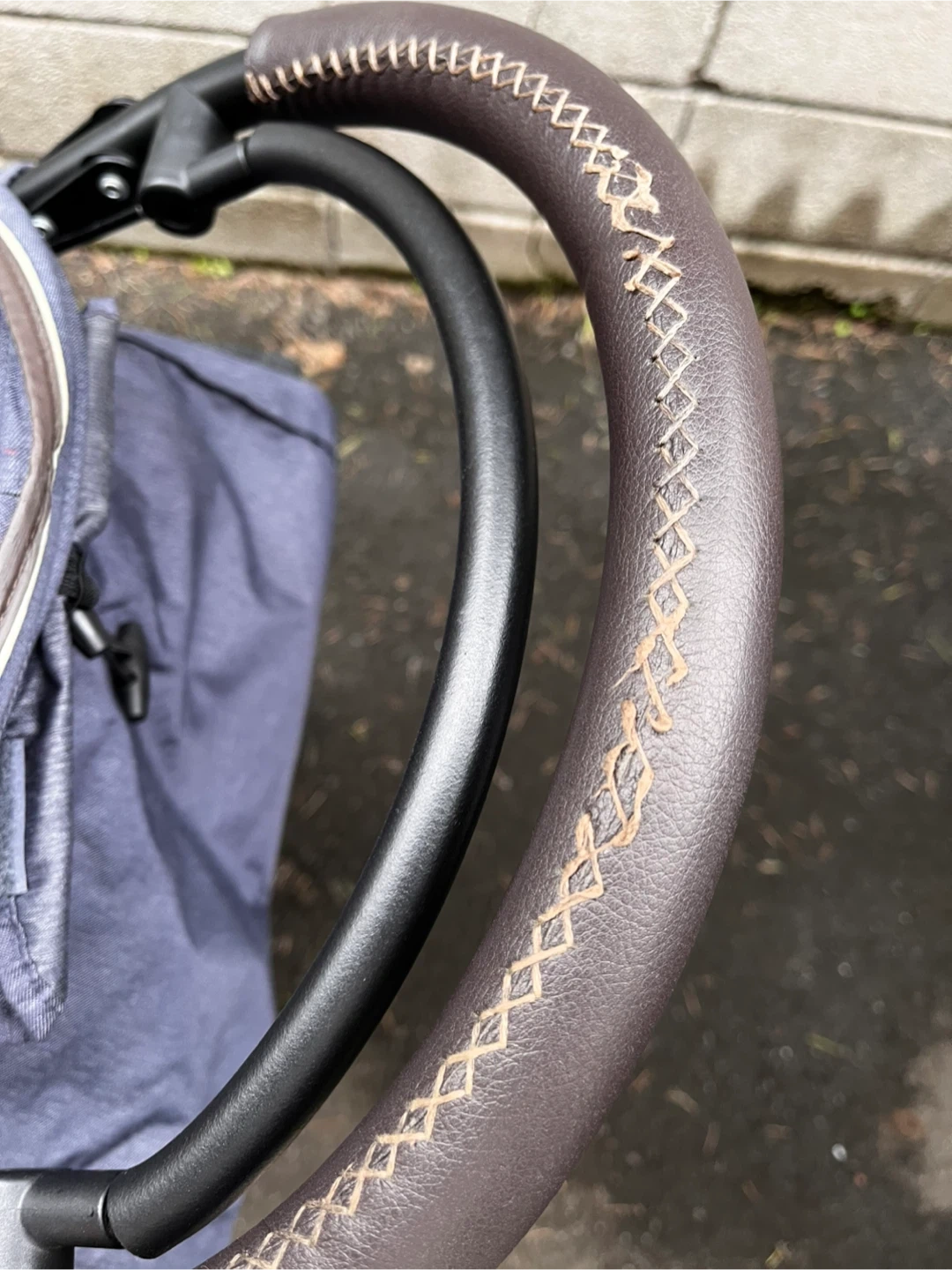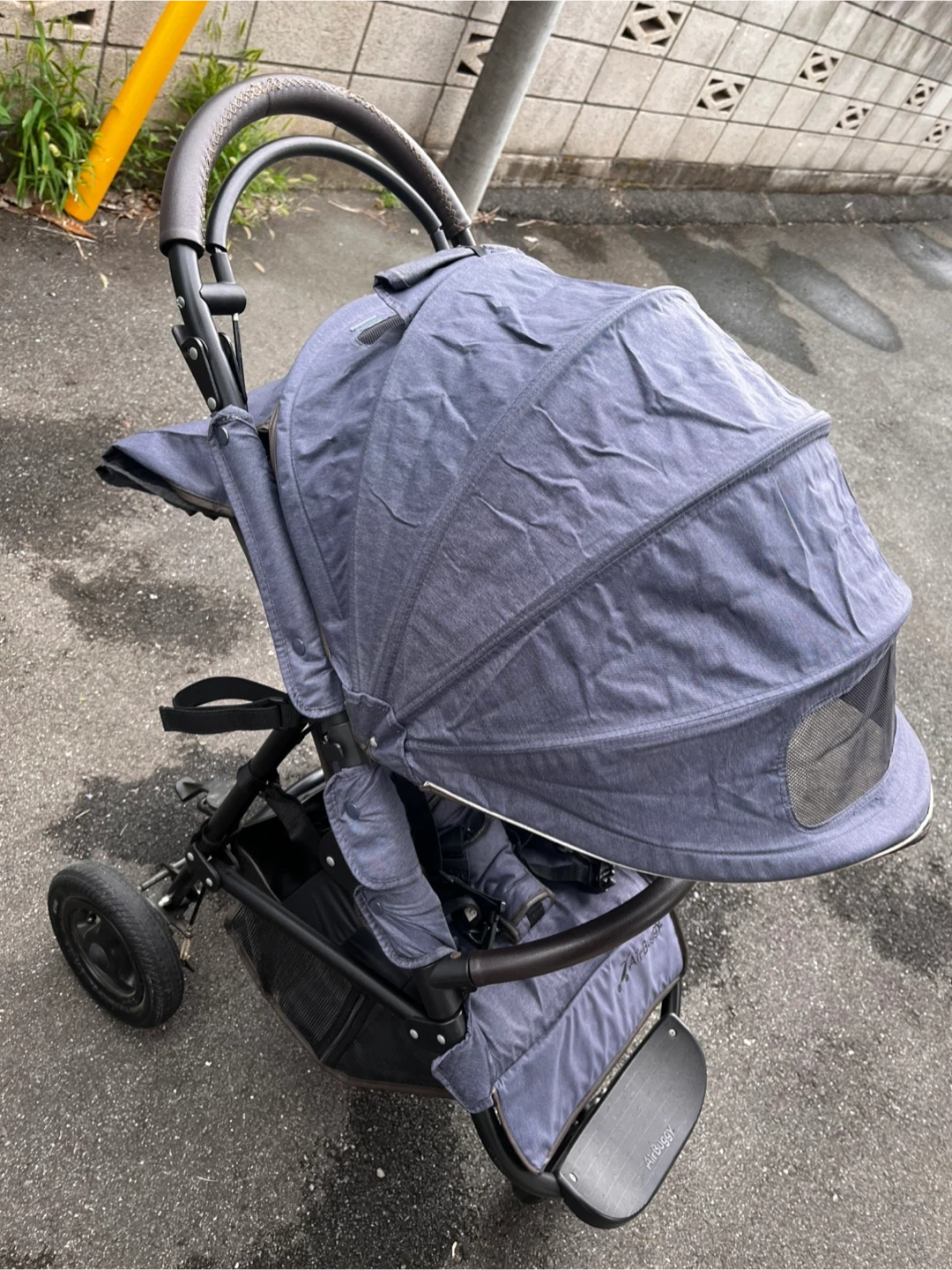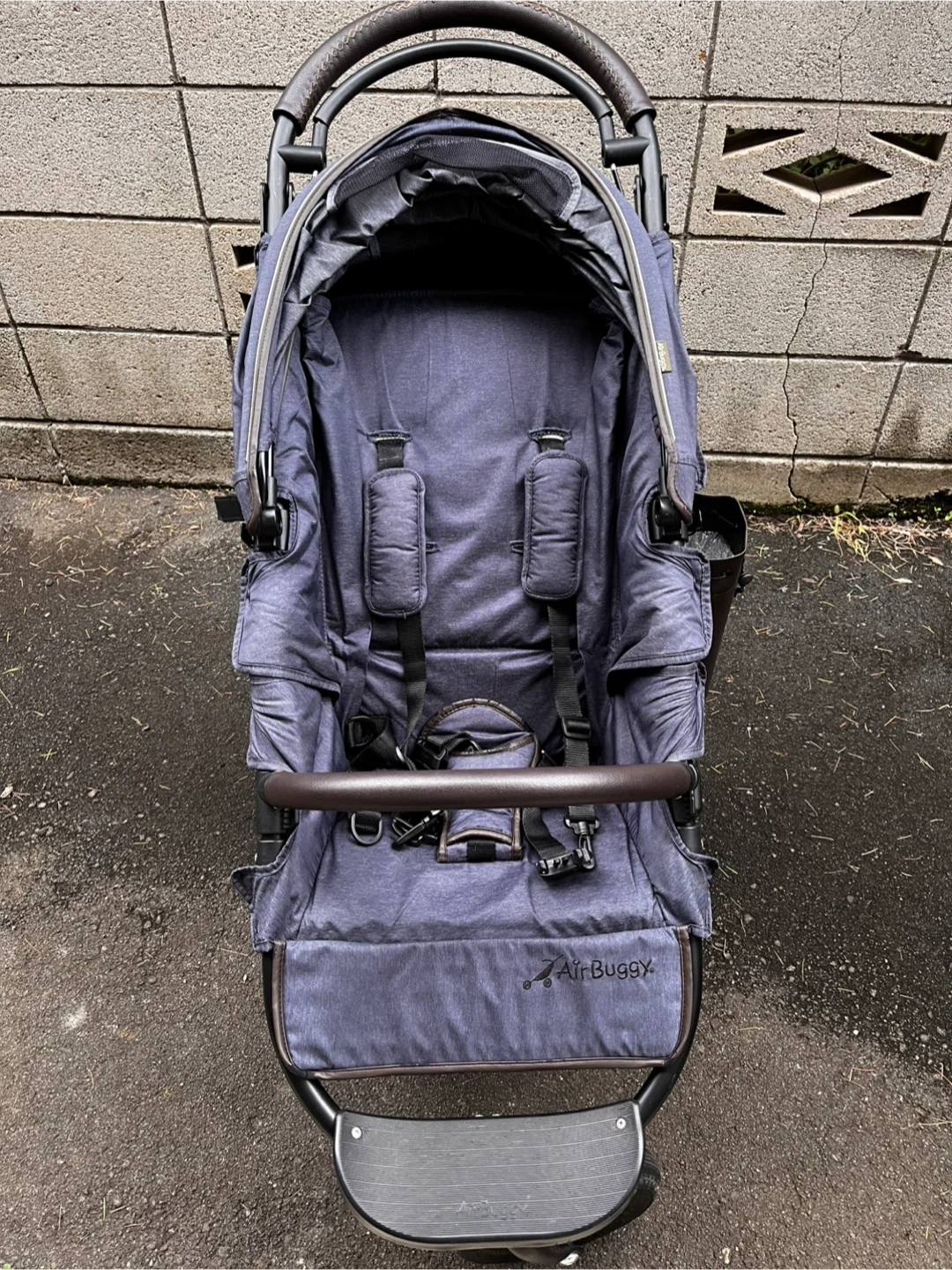 エアバギーのベビーカーCOCOブレーキです。 色はデニム地のブルー系です。色褪せはあまり感じません。 ハンドル、ドリンクホルダー、フロントバーはブラウンの合皮です。 付属品:ドリンクホルダー、レインカバー、空気入れ 2017年に購入し、2人の子に使用し、完全に使わなくなったのは2025年の春頃です。 2021年12月に1度クリーニングをしてもらっています。レインカバーはクリーニング後1度も使用していません。 2019年頃に前輪のみタイヤ交換をしています。後輪2つは交換していませんので、擦り減りが前輪より強めです。 写真7枚目:ハンドルの縫い目がほつれています(フックのマジックテープがひっついてしまったため)。使用には問題ありません。 写真8枚目:合皮部分が所々破れてしまっています。全ての部分を写真添付できなかったので、1番破れが多い部分を載せています。 現在発売されているエアバギーの仕様とは異なり、リクライニング方法が全く違います。 説明書が紛失していますので、ネットで検索お願いいたします。 【情報】 ブランド:エアバギー 【状態】 使用感、傷あり あくまでも中古品であることご了承ください。 エアバギー製品やベビーカーグッズも出品しています。 おまとめ買いの場合は気持ちお値引きさせていただきますのでご検討ください。