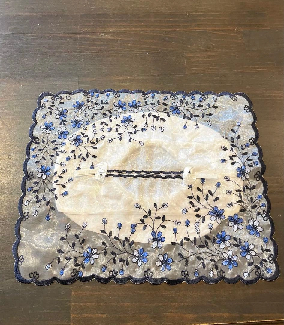 花柄の刺繍が施されたティッシュボックスカバーです。青色のお花が美しいデザインです。 海外製のエレガントなティッシュカバーです。 サイズ: 平置き 約37x約30cm - デザイン: 刺繍入り、花柄のデザイン - 色: 青色の刺繍 - 形状: 四角形、スカラップエッジ - 素材: 透明な生地に刺繍 - 用途: ティッシュボックスカバー ご覧いただきありがとうございます。