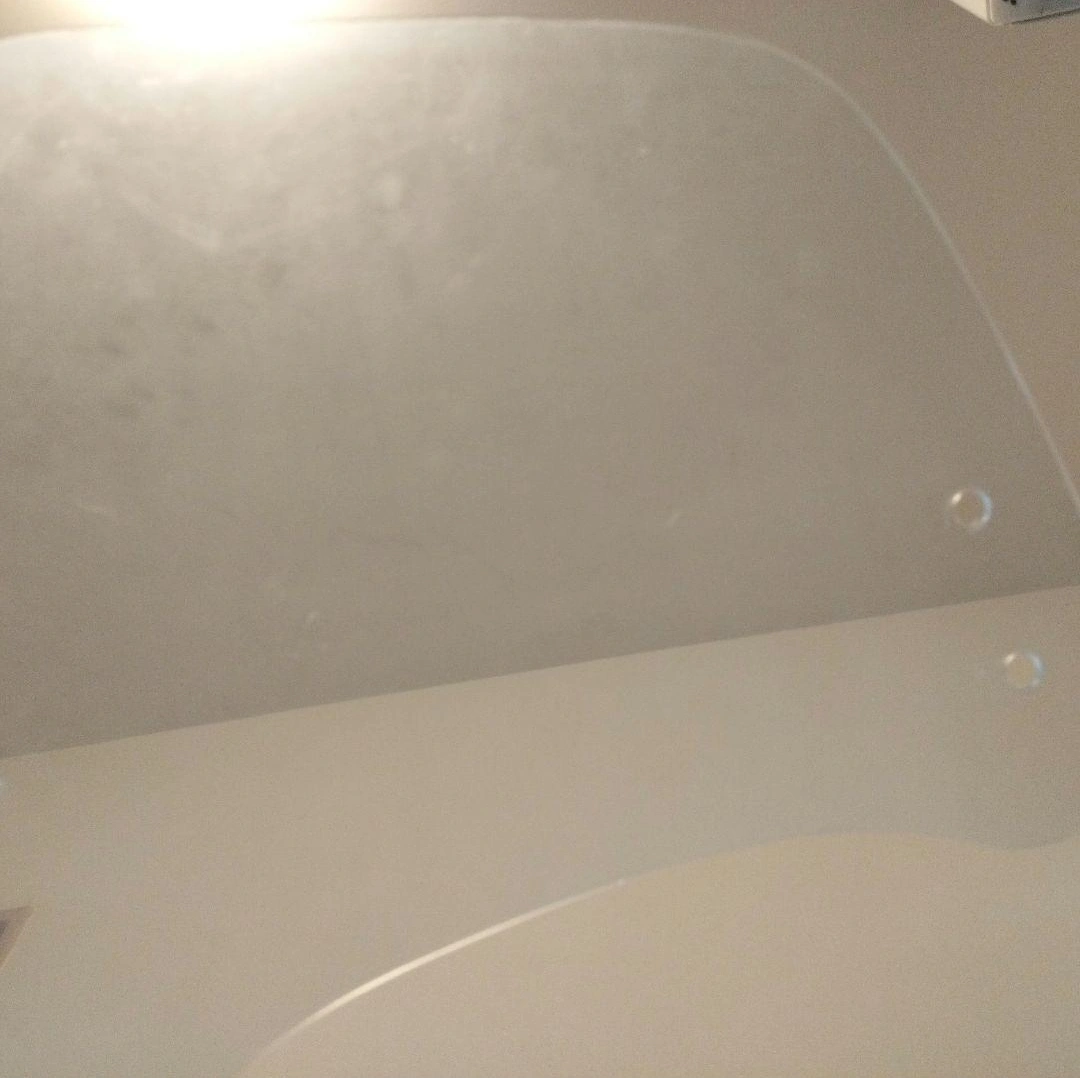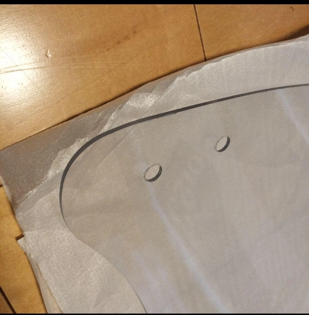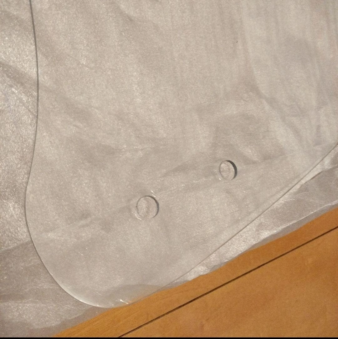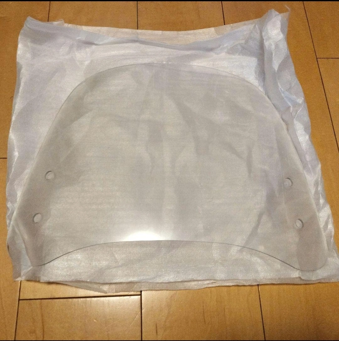 オートバイ用の風防です。 高さ30cm程度✕幅38cm程度です。 一度原付バイクに取り付けて試走しましたが、少し高さが足りず、頭に風を受ける感じでしたので、使用するのをやめました。 表面のビニールは剥がしていません。 裏面のビニールはもともと無かったようです。 表面のビニール以外にはキズは見受けられませんが、もしかしたら細かいキズがあるかもしれません。 風防のみで、ステー、金具類はありません。 ネット購入しましたが、メーカーは『オートパーツセンター製』となっています。