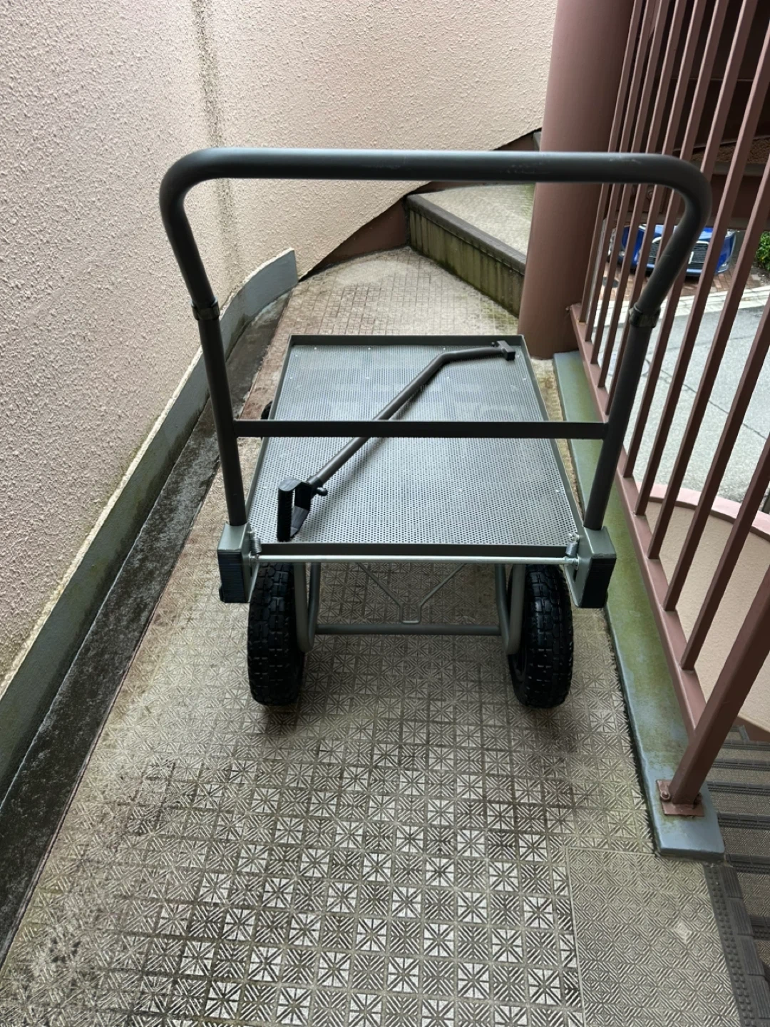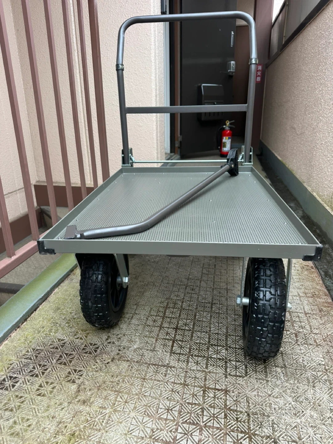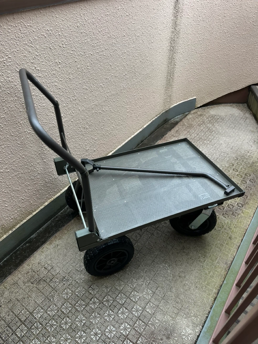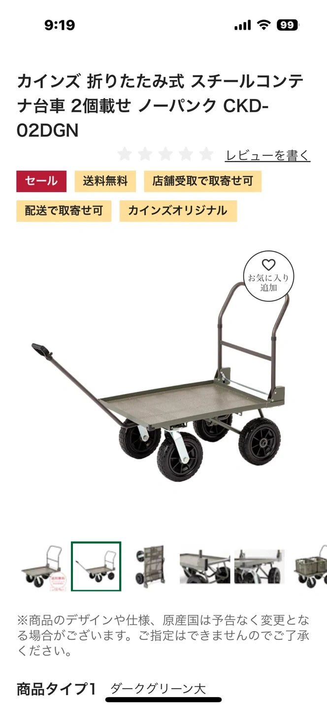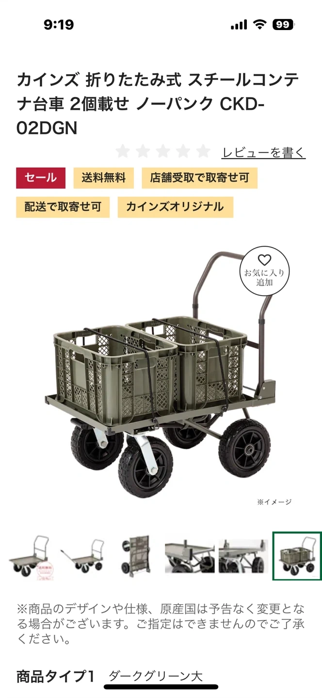 カインズの折りたたみ式スチールコンテナ台車です 【情報】 ブランド:カインズ 型番:CKD-02DGN 【状態】 使用感少なめ 商品コード 4549509908968 カラー ダークグリーン 本体サイズ(cm) ( 約) 幅94× 奥行55.5× 高さ92.5cm 使用時サイズ ( 約) 幅94× 奥行55.5× 高さ92.5cm 積載面寸法 荷台サイズ( 内寸):(約)幅765× 奥行545mm 特徴 トレーラーハンドルで引いても使える。ハンドルは折りたため、たたんだ状態で立てられる。荷崩れ防止紐(市販品)が掛けられる引っ掛け部付き。 用途 運搬 タイヤタイプ ノーパンク 材質 材質: 本体/スチール ハンドル/スチール、合成ゴム タイヤ/ポリプロピレン、ポリウレタン ネジ部/スチール トレーラーハンドル/ スチール、ポリプロピレン クッション材/塩化ビニル樹脂 耐荷重 ( 約)100kg 使用上の注意 ●本来の用途以外には使用しないでください。 生産国 中国 特記事項 過積載、片積みは破損や転倒の原因になりますのでやめてください。●人は絶対に乗らないでください。転倒の原因になります。●坂道や傾斜地には絶対に止めないでください。事故の原因となります。 ちなみに自分の体感で本体の重さが20キ ロ位あると思います。 重いけど丈夫で長持ちすると思います。 中古品であることご了承ください