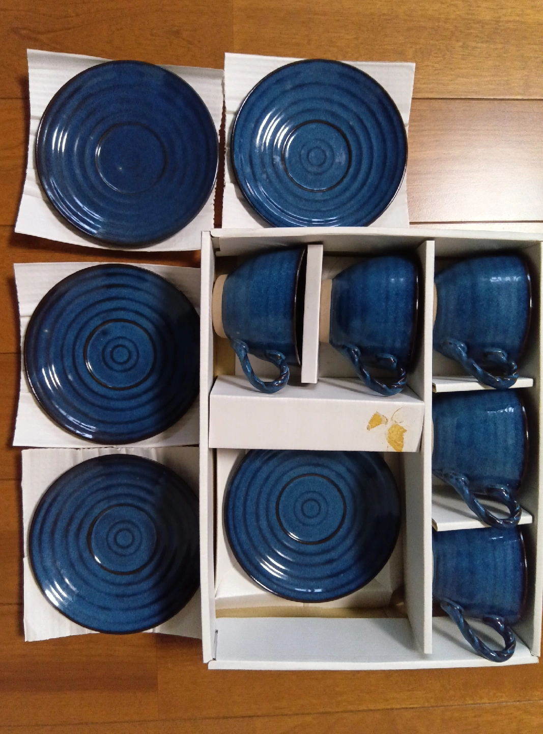 カップ&ソーサーのセットです ・カップ5客 ・ソーサー5枚 ・箱入り ・色は青色です 購入してからほとんど使わず、しまっていました。保管期間が長いので、箱が傷んでいます。 一度人の手に渡ったものです。中古品であることご了承ください。